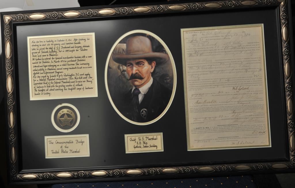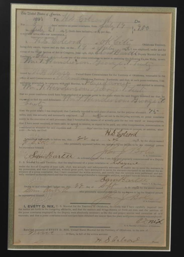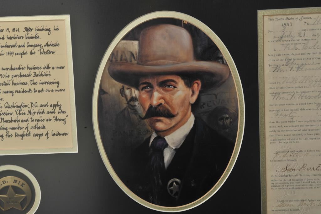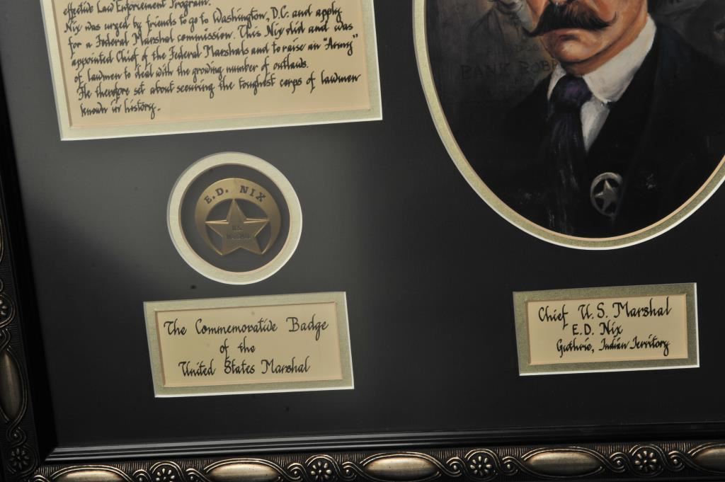 Beautifully framed and matted display regarding Chief U.S. Marshal E. D. Nix including an original U.S. Marshal for the Territory of Oklahoma posse comitatus document dated July 19, 1893 and signed by E.D. Nix; also a Commemorative badge of the U.S. Marshal, a color print sketch of Marshal Nix and brief written summary indicating in part that Nix was born in Kentucky on Sept. 19, 1861; he moved out West to Oklahoma in 1889 and entered the General merchandising business; given increased lawlessness in the area, Nix was urged to go to Washington, D.C. and apply for a Federal Marshal Commission. He did and was appointed Chief of the Federal Marshals, working with the likes of famous lawmen, Chris Madsen, Bill Tilghman and Heck Thomas; Nix and the “Three Guardsmen” helped bring law and order to the Indian and Oklahoma Territories. Size of framed tribute is approximately 18.5” x 30.5”. Est.: $100-$200.