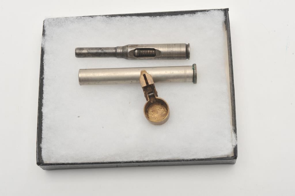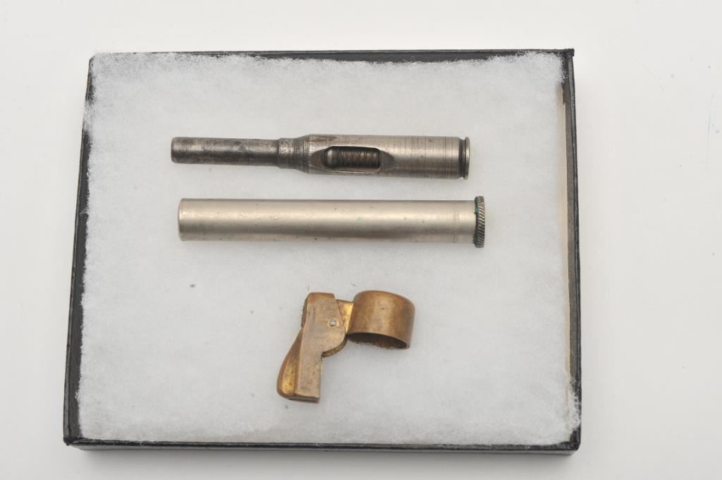Small lot of U.S. military accessories including a butt trap oiler and a brass muzzle cover for a U.S. Springfield Krag bolt action rifle; also a conversion shell for a bolt action rifle; in riker case. Est.: $50-$100.