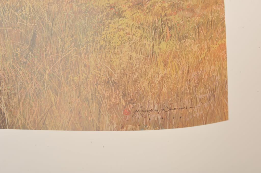Lot of 2 color Michael Coleman prints, one entitled “Winter Camp”, approximately 22” x 30”; the other showing bear family raiding a fishing camp, approximately 22” x 25”. Coleman Est.: $75-$100.