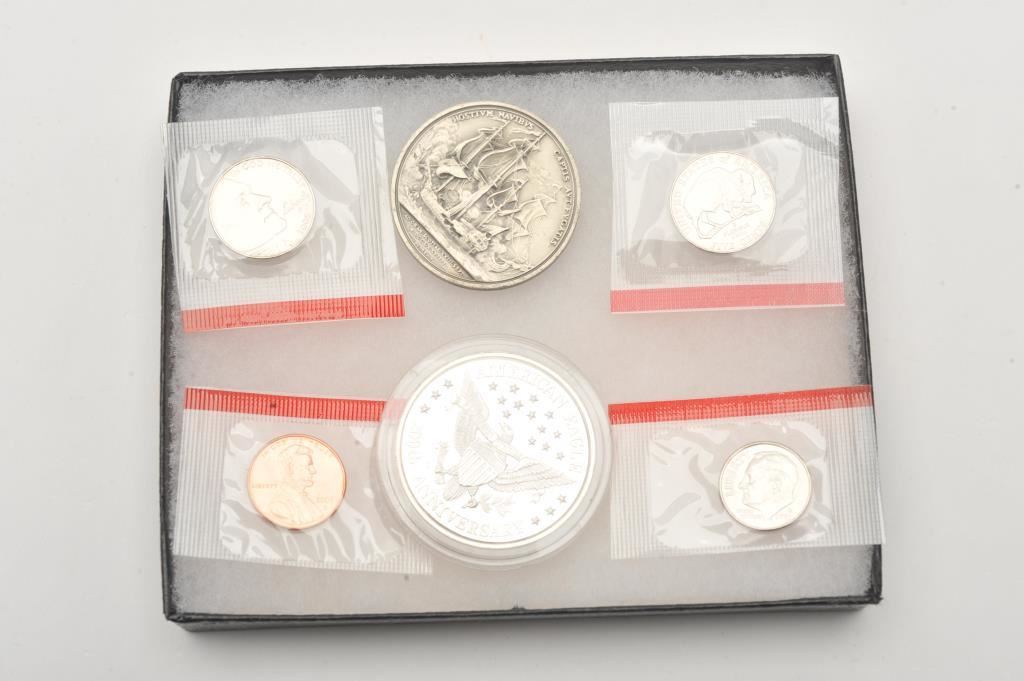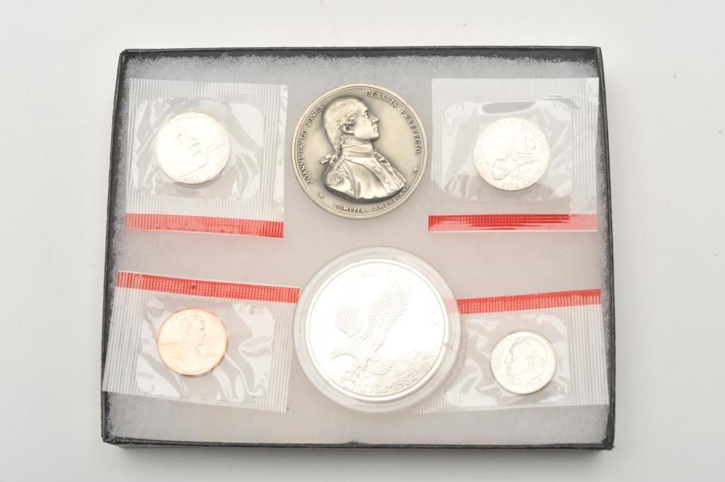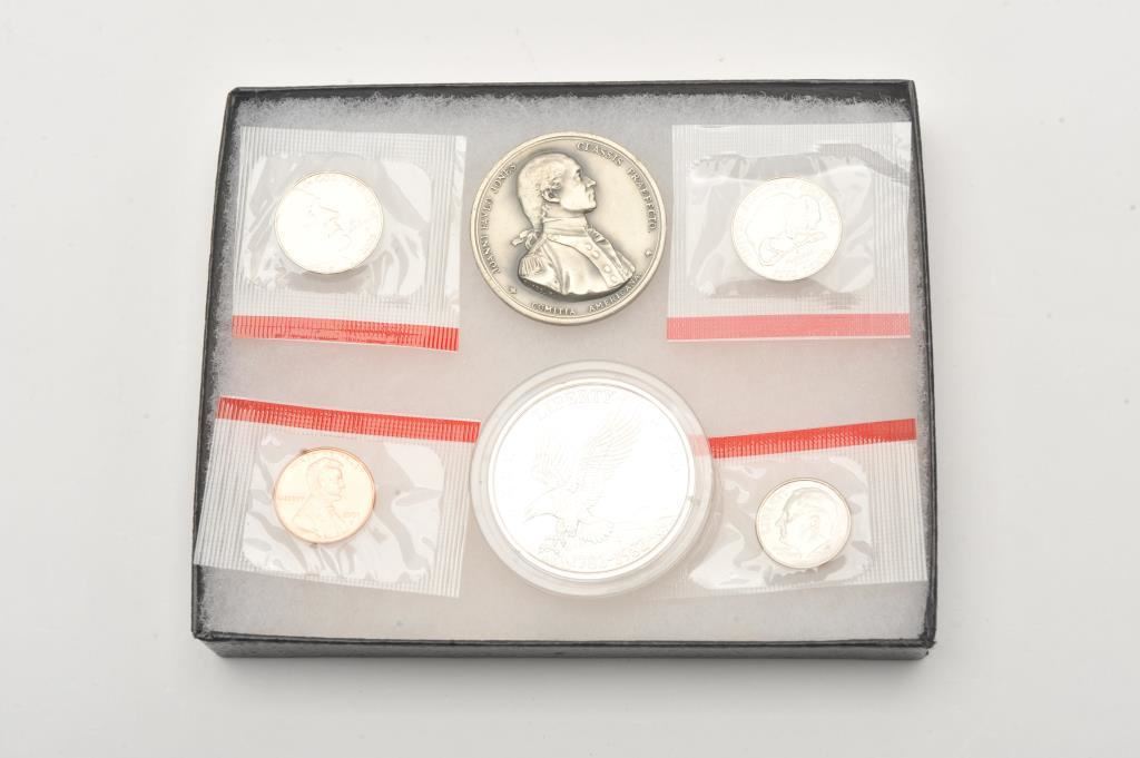 Small lot of 4 U.S. coins and 2 Commemorative coins in riker case. Est.: $25-$50.