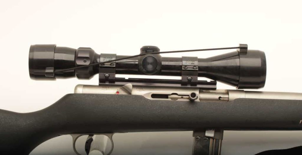 AMT .22 Magnum Hunter Model semi-automatic rifle, .22 Magnum caliber, Serial #MR0749. The rifle is in very good overall condition with a 20” barrel. The metal surfaces retain the majority of their matte stainless steel finish. The textured synthetic stock is in good condition with small mars and scratches consistent with field use. The butt ends with a hard plastic butt plate. The rifle is topped with a Bushnell 3 x 9 variable power scope. The bore is good, the action functions and the markings are legible. The lot includes one correct magazine, sling swivels and a nylon rifle sling. Est.: $250-$500. (Modern).