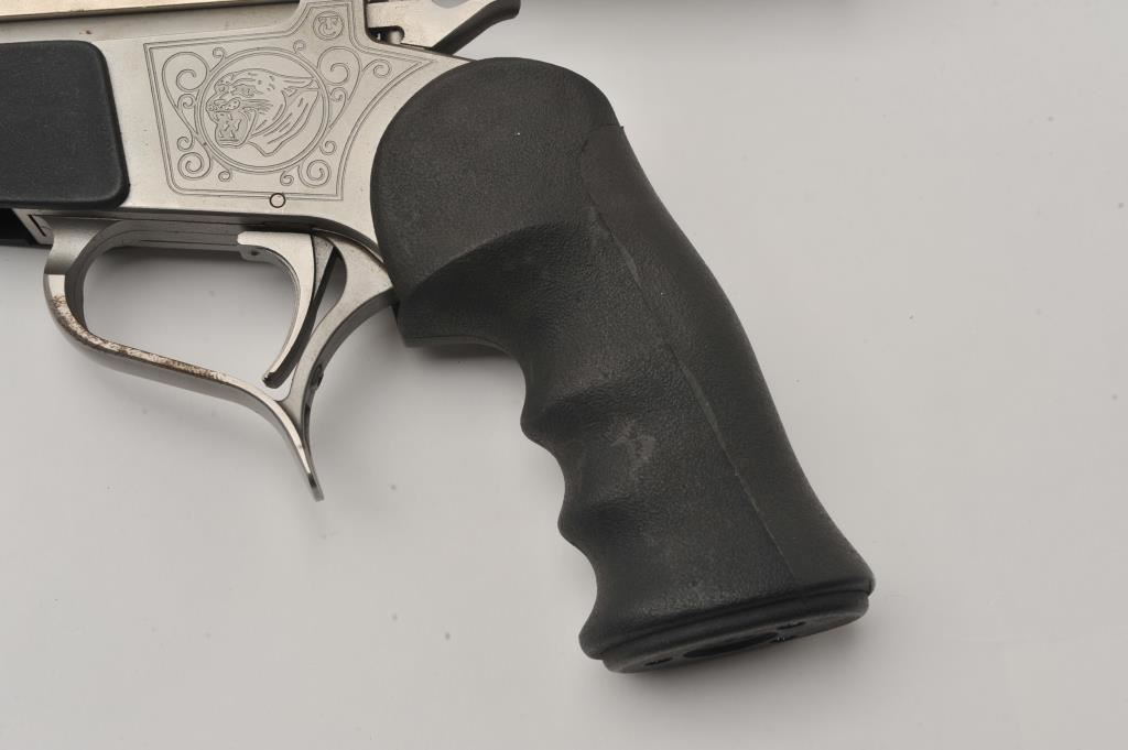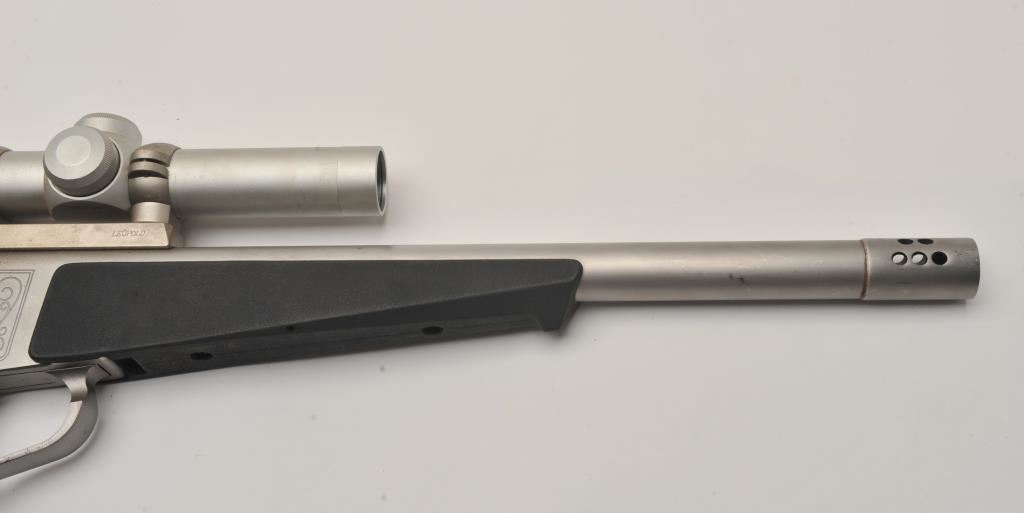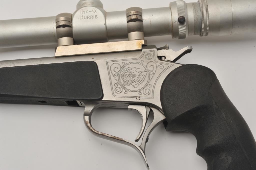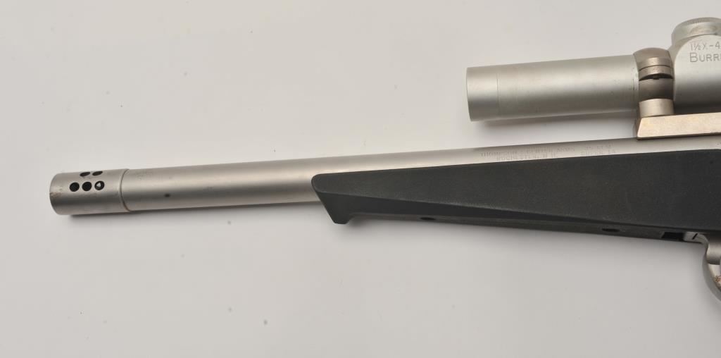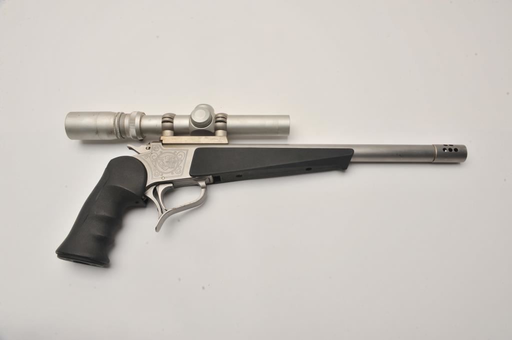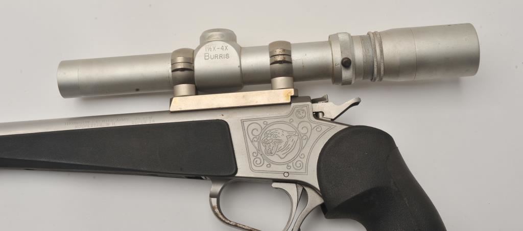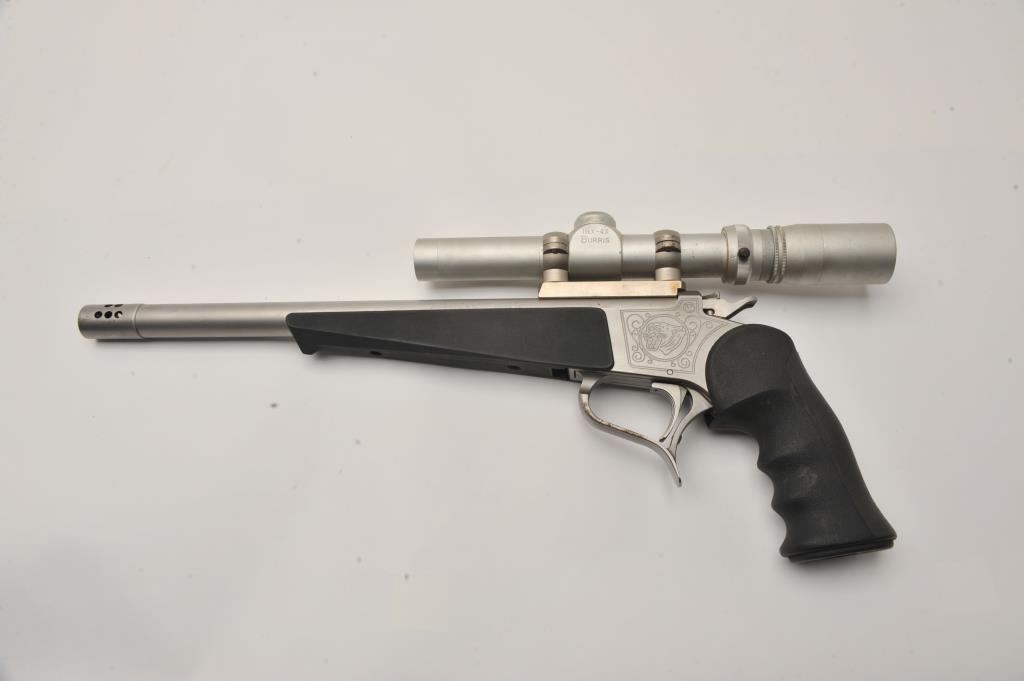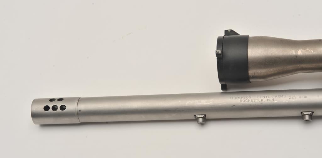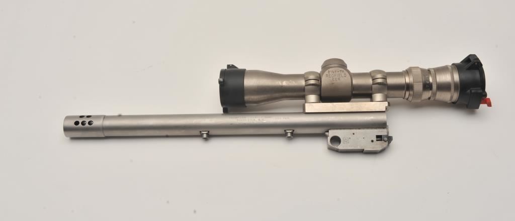 Thompson Contender single shot pistol, .35 Remington caliber, Serial #S12111. The pistol is in good overall condition with a 14” barrel with muzzle break. The metal surfaces retain the majority of their matte stainless steel finish with wear at the muzzle and light surface rust on the trigger guard. The textured rubber grips are in good condition with small mars consistent with field use. The pistol is topped with a matte stainless finish Burris 1 ½” x 4 variable power scope with clear, crisp optics. The lot includes a second barrel, 12” in length with a muzzle break chambered in .223 Remington. The 2nd barrel is topped with a Redfield EER 2 ½ x 7 variable power scope. The bores are good, the action functions and the markings are legible. Est.: $400-$800. (Modern/PPT).