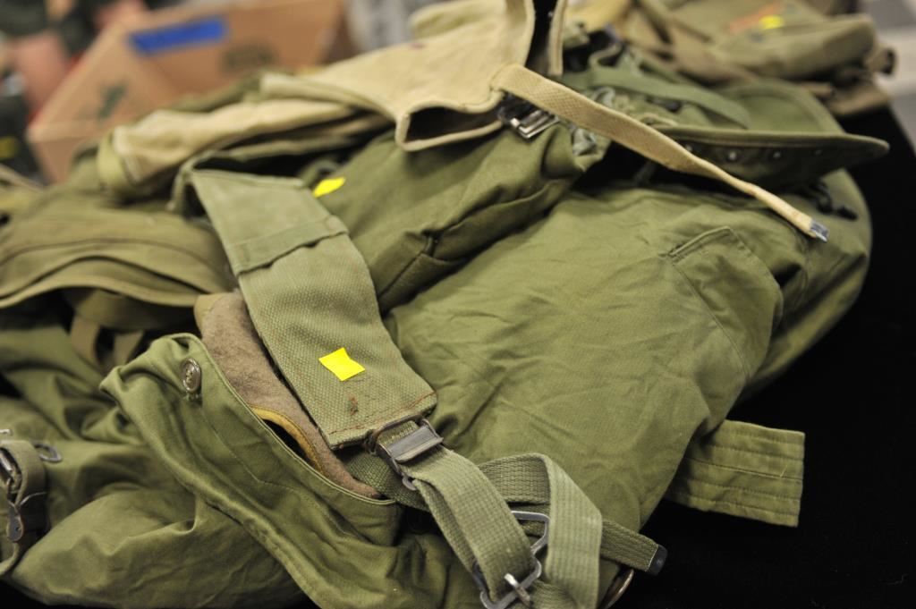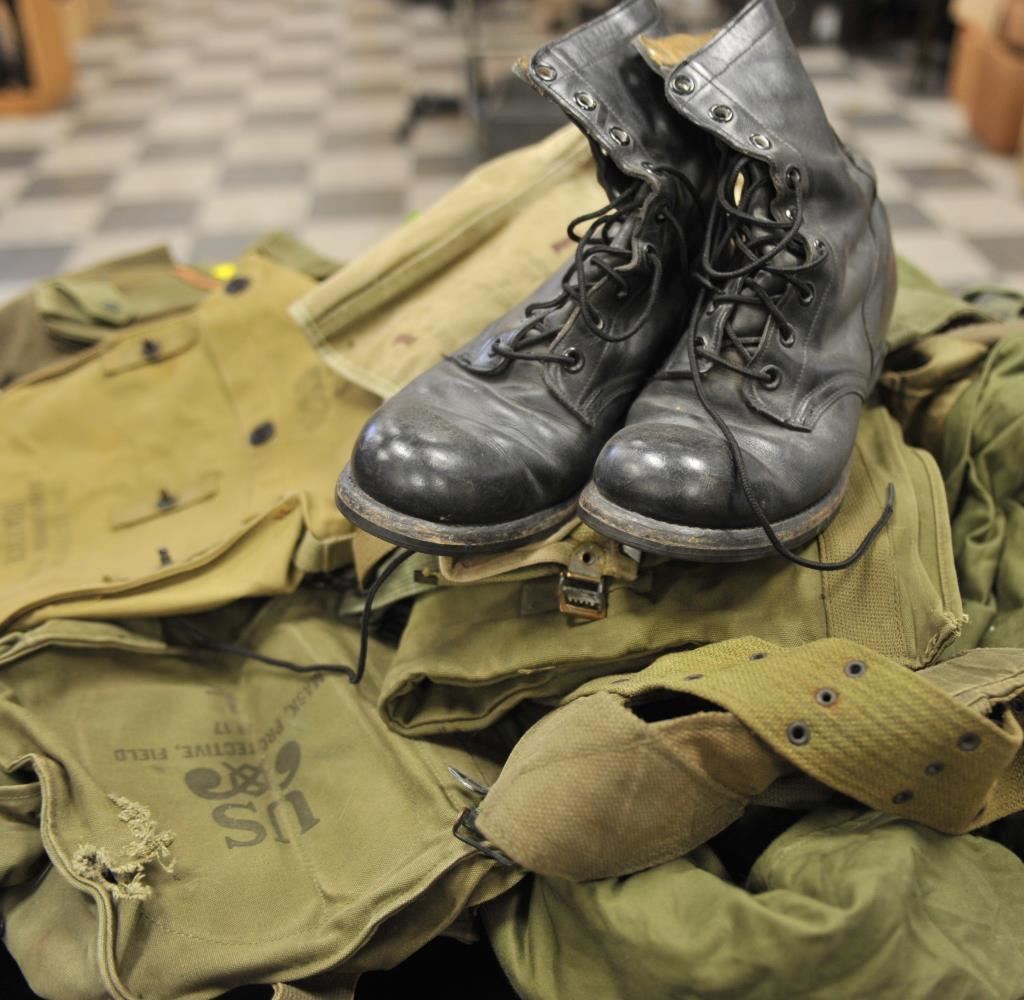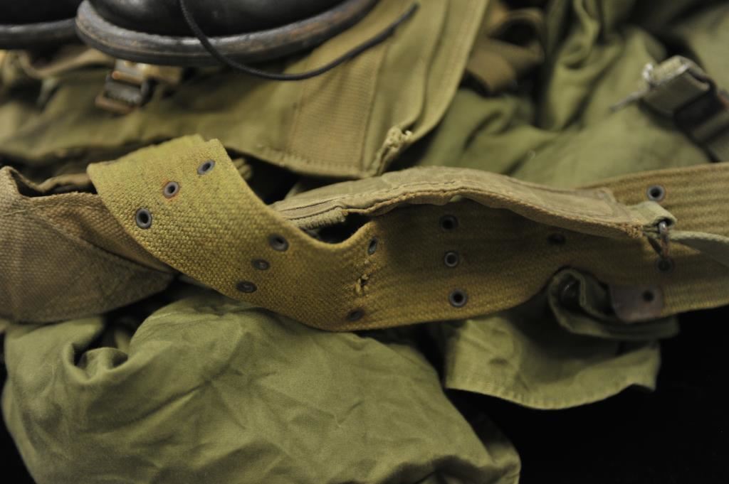 Lot of military clothing. The lot includes wool GI trousers, gaiters, GI boots, belts, canteen with cover, web gear and gas mask cases. A bonanza lot of military surplus items from a local estate. Est.: $125-$250.
