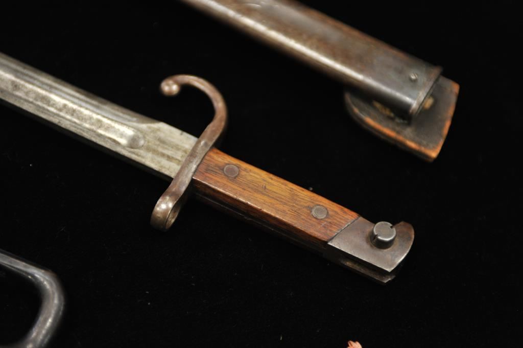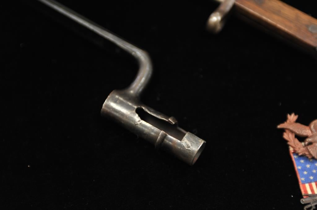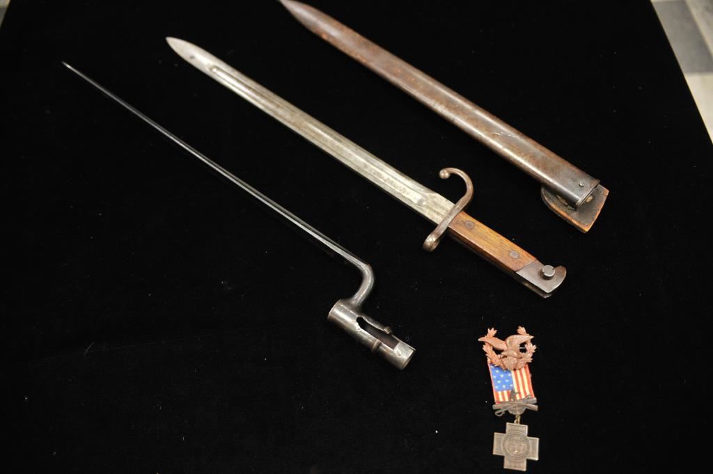 Remington marked bayonet for rolling block with scabbard in good condition also along with takedown Springfield bayonet in near fine condition. Along with Spanish American War service medal. No scabbard. Est.: $100-$200