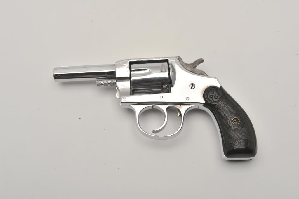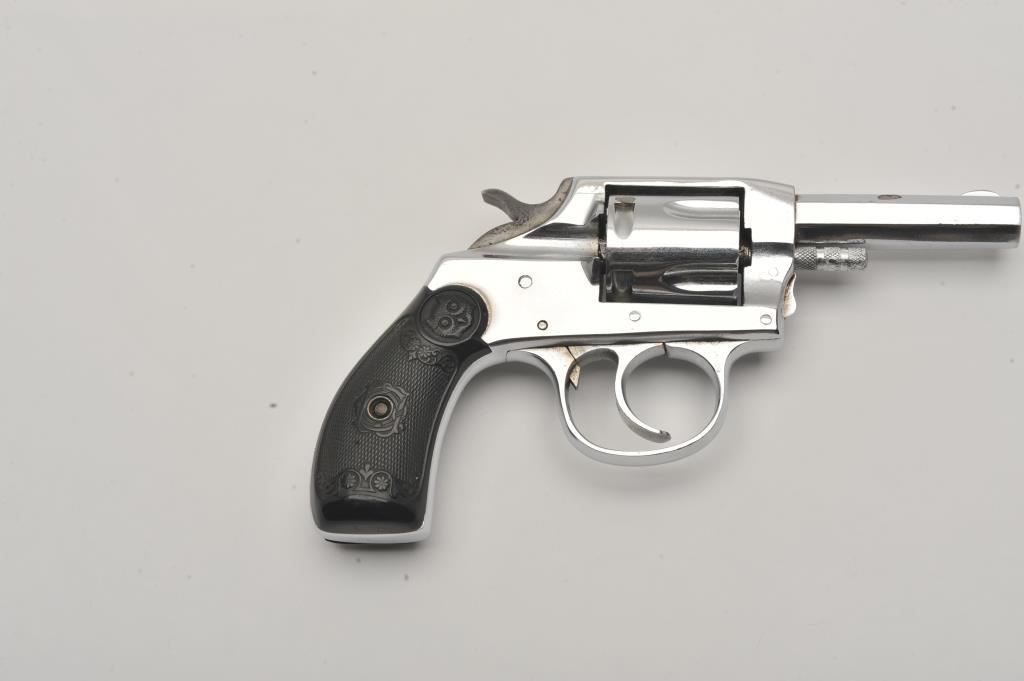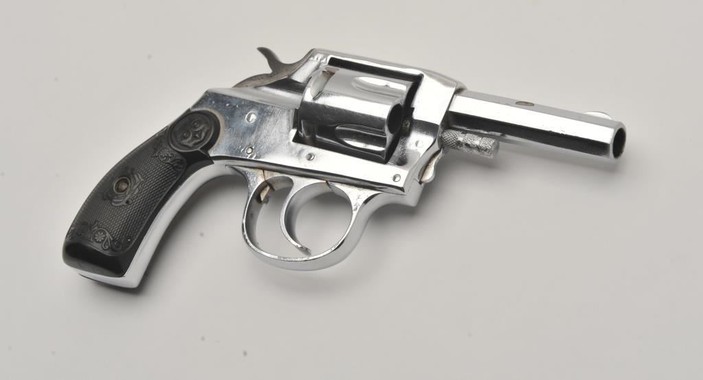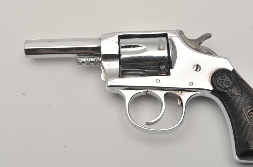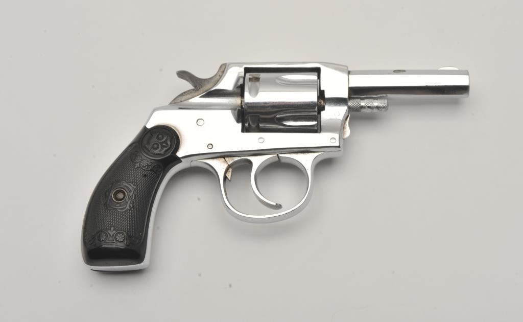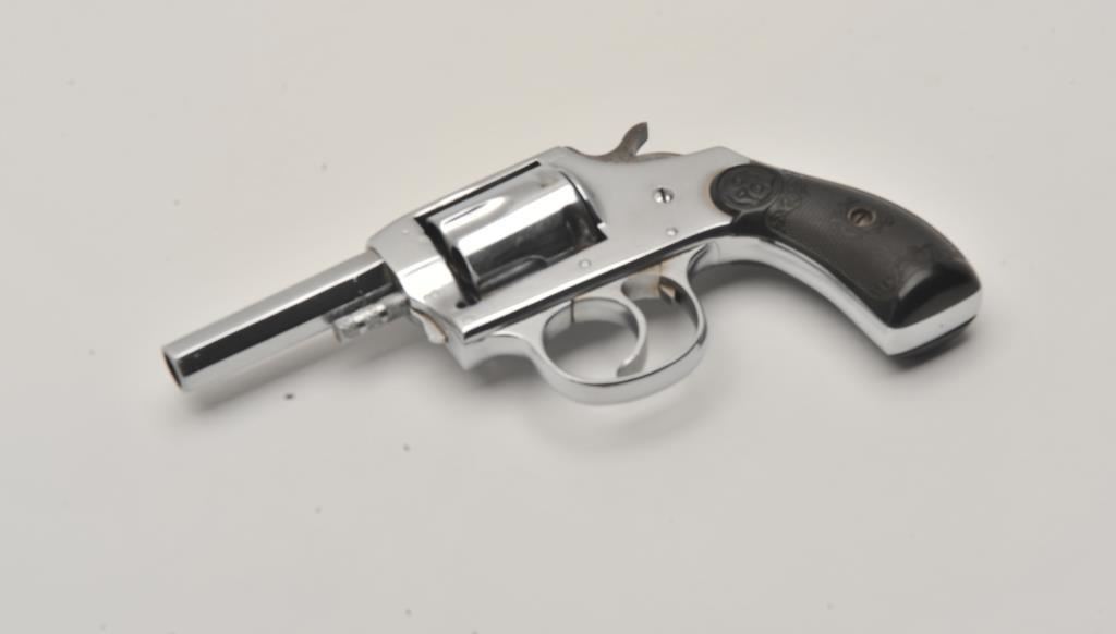 Iver Johnson Model 1900 double action revolver, .32 caliber, Serial #39264. The pistol is in fine overall condition with a 2 ½” barrel. The pistol retains a significant amount of its nickel finish with high point edge wear, wear at the muzzle and small scratches. The checkered hard rubber grips are in good condition with small mars and sharp checkering. The bore is fair, the action crisp and markings are sharp. Est.: $70-$140. (C+R/PPT).