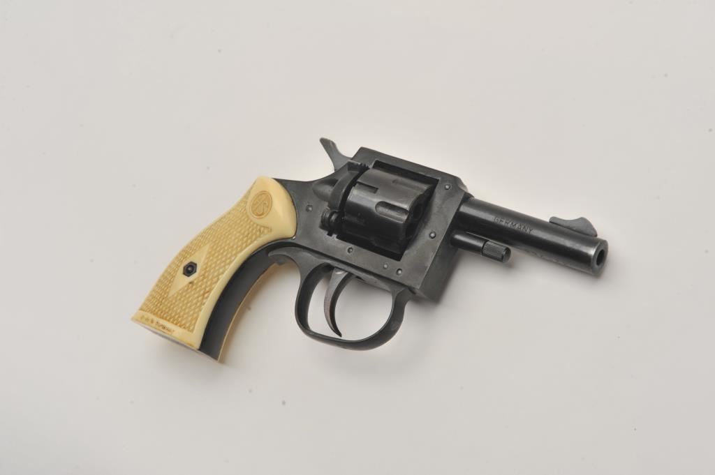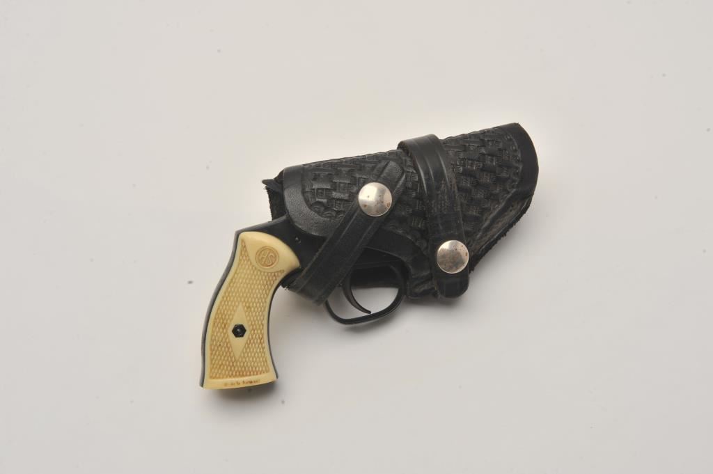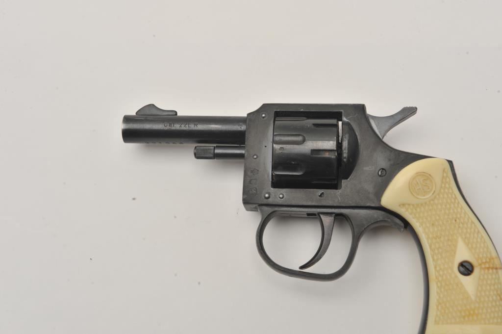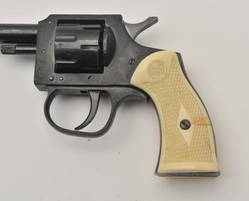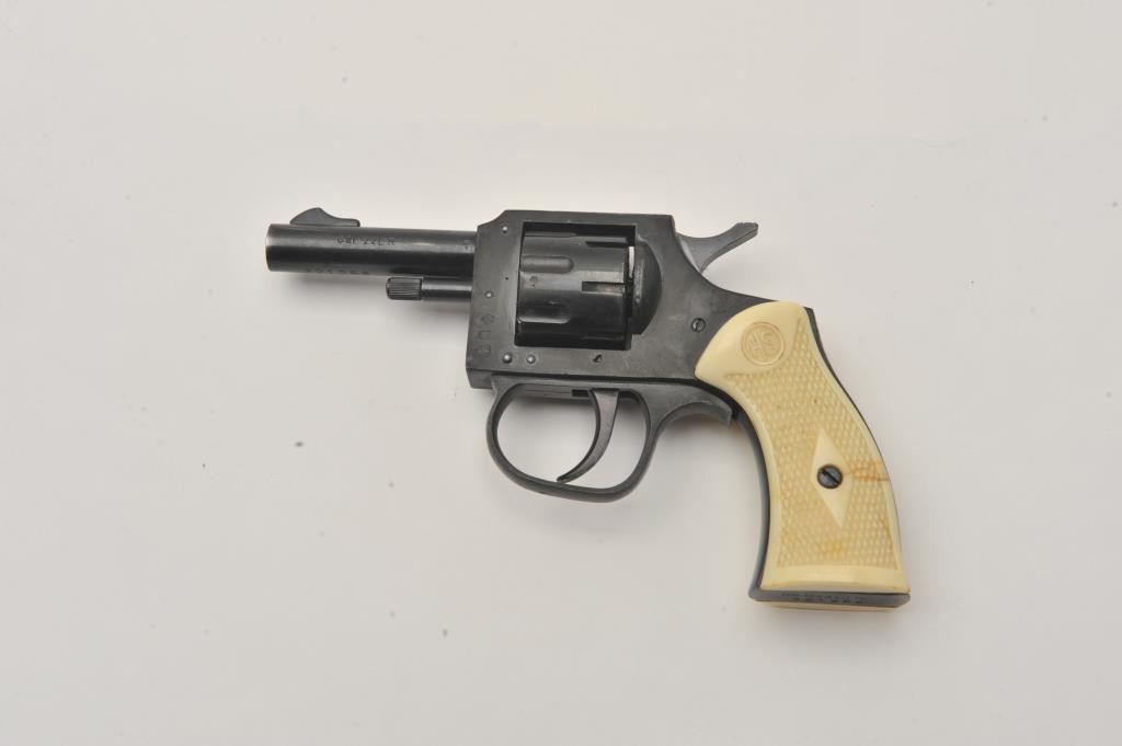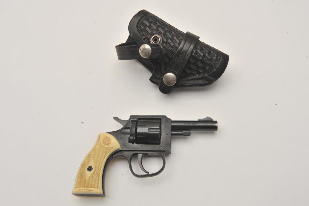 Herman Schmidt Modell 10 double action revolver, .22 caliber, Serial #321255. The pistol is in good overall condition with a 2 ½” barrel. The metal surfaces retain the majority of their black finish with holster wear at the muzzle and handling marks. The checkered plastic faux ivory grips are in good condition with mars and scratches from carry and use. The bore is fair, the action functions and the markings are legible. The lot includes a black leather Viking belt holster with top snap. Est.: $30-$60. (Modern/PPT).
