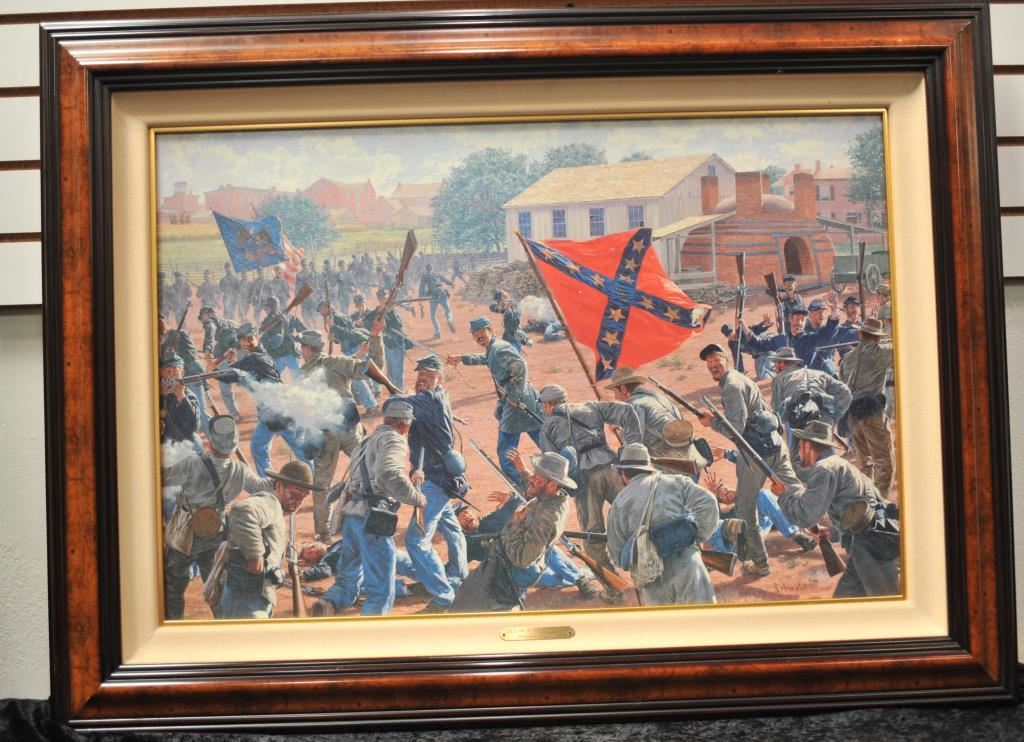 “Bedlam at the Brickyard” Civil War battle scene by Somerset House publishing. The work by artist Bradley Schmehl is a framed, master graphic on canvas limited edition of 195 pieces. This piece is 6/195 in the edition. The 30” x 20” piece is nicely framed in faux burl wood frame. Issued in 1998, the work is signed in the lower right corner. Est.: $150-$300.