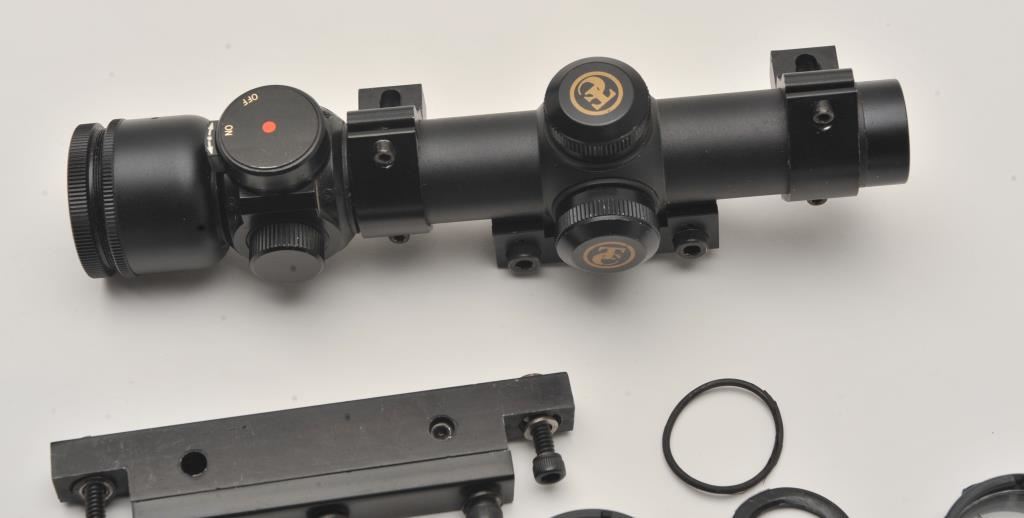 Thompson Center Arms 4 x 20 Electra Dot scope with spare parts including scope mount, lens filters, etc. Est.: $50-$100.