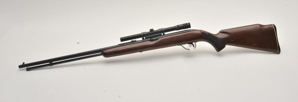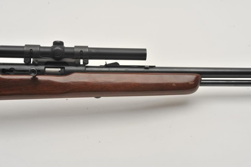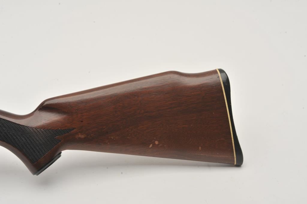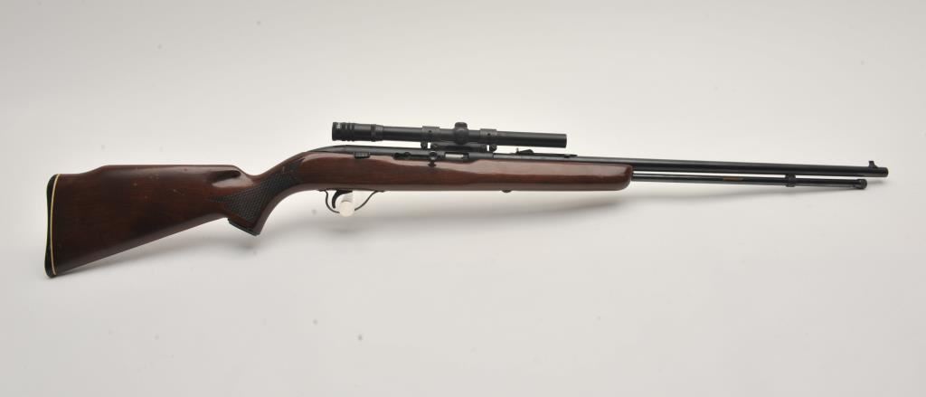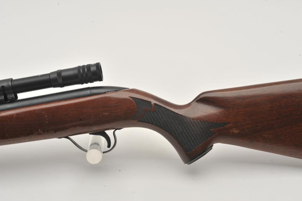 High Standard Sport King Model A1041 semi-automatic rifle, .22 caliber, Serial #NSNV. The rifle is in very good overall condition with a 22” barrel and full-length tubular magazine. The metal surfaces retain the majority of their blue finish with light wear at the muzzle. The checkered wood stock is in good condition with small mars and compressions associated with carry and use. The butt stock ends with a plastic butt plate. The rifle is topped with a 4 x 15 Compac fixed power scope. The bore is good, the action is crisp and markings are sharp. Est.: $40-$80. (Modern).