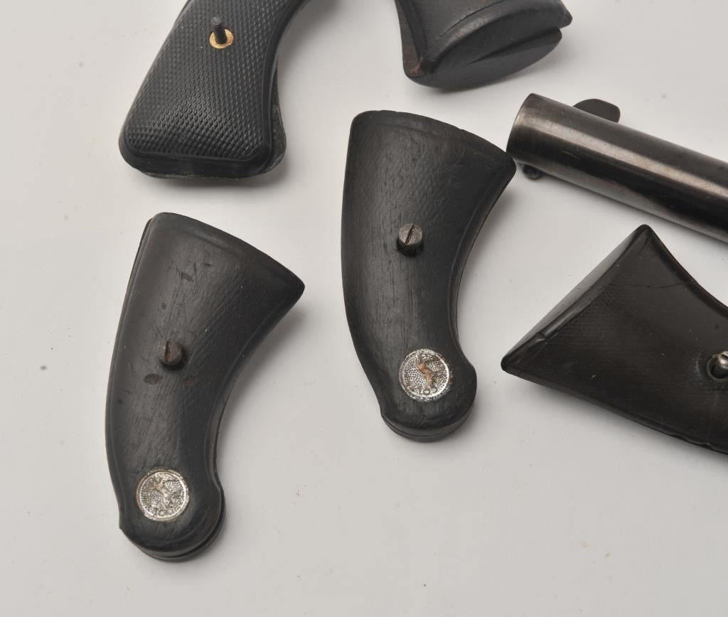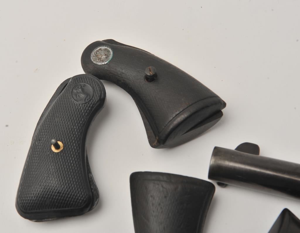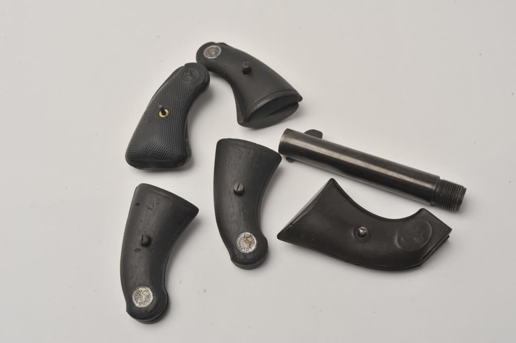 Lot of Colt parts including a 4.75” Single Action barrel, a pair of well-worn Single Action checkered hard rubber grips and four pair of pocket model DA revolver grips (3 pair wood and one pair hard rubber). Est.: $100-$200.