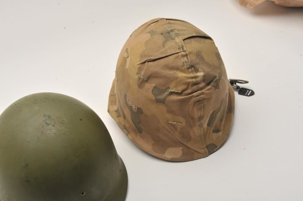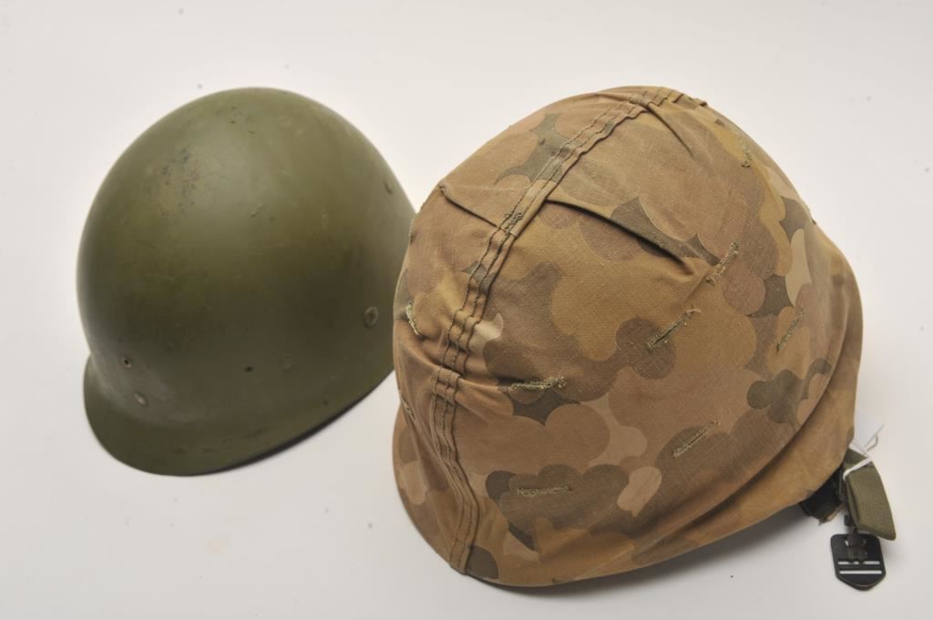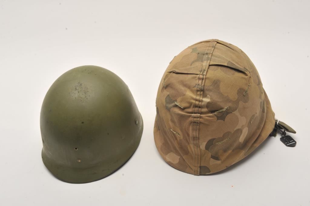 Marine Corps front seam WWII helmet with tiger strip liner and early straps. With cover. Very good plus condition. Est.: $125-$250