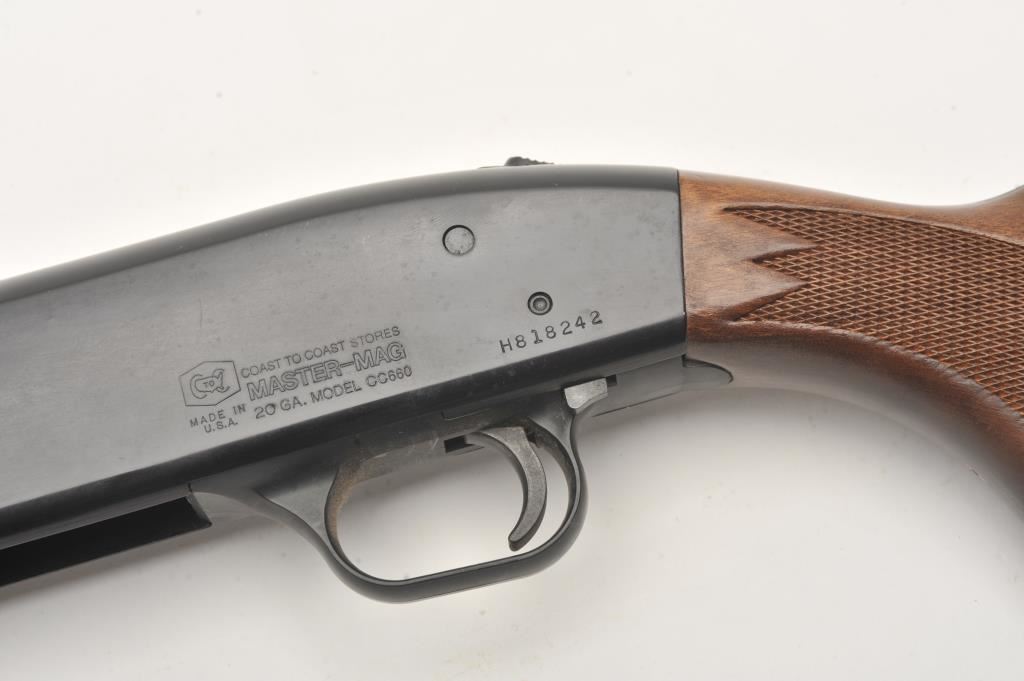 Coast to Coast Master Mag 20GA pump action shotgun with 28” barrel. Choked extra modified. S/N H818242. Original butt plate and length. Very good plus used condition. Minor use and storage marks. (Modern) Est.: $125-$250