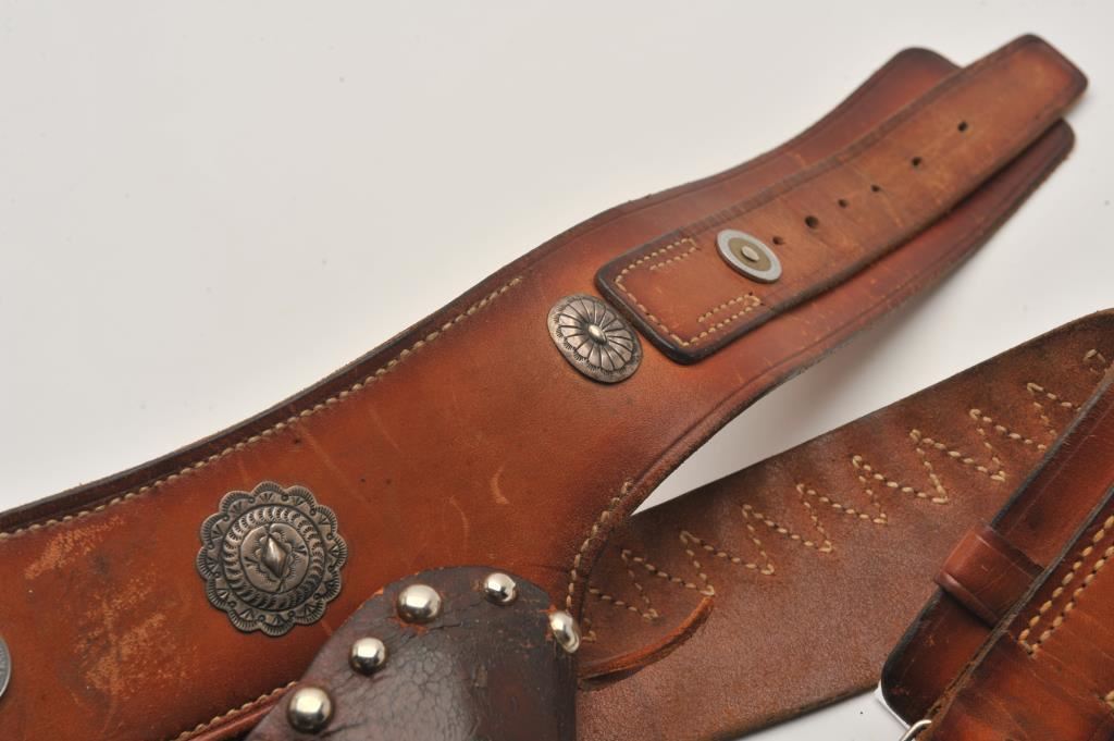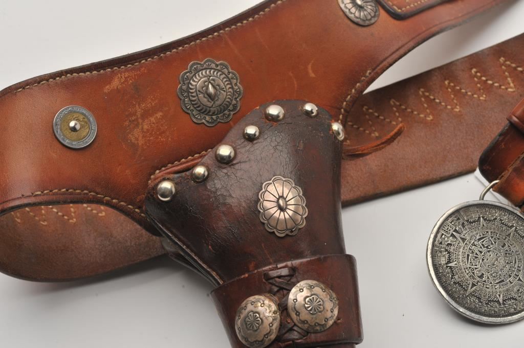 Western style cartridge belt and single loop holster with silver mountings by Alfonso’s of No. Hollywood, large Aztec calendar belt buckle marked “Bergamot Brass Works/c. 1974”. Est.: $175-$350.