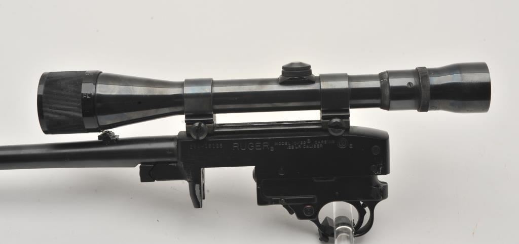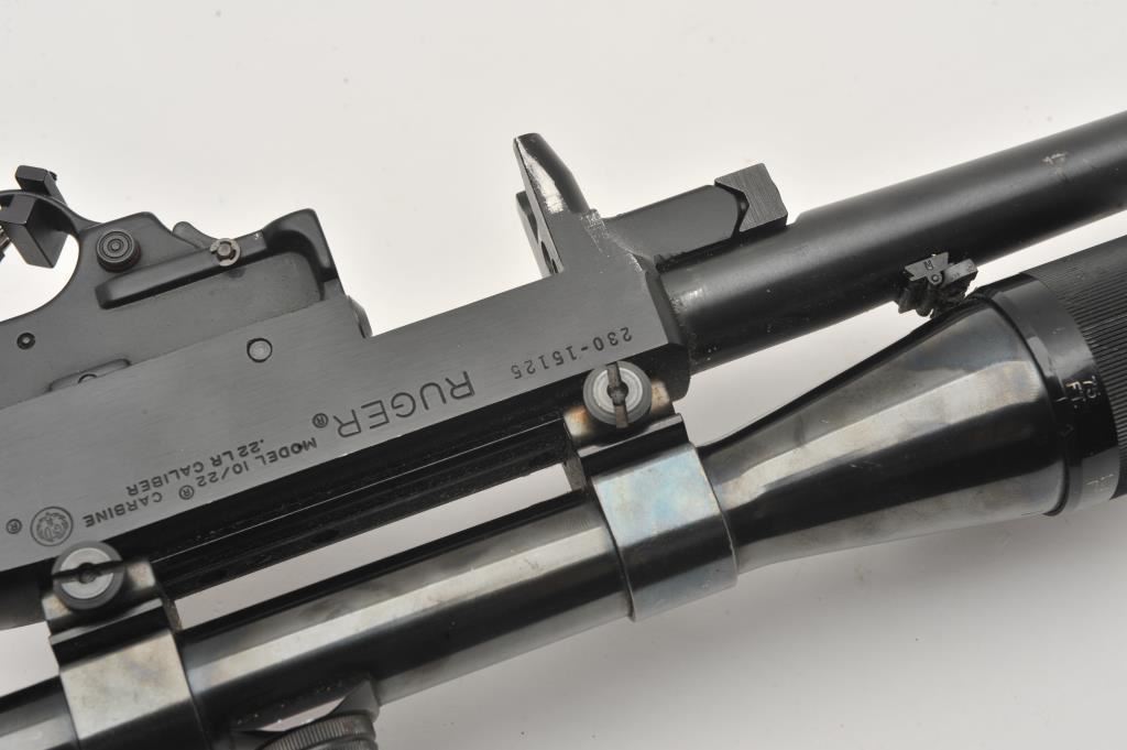 Ruger Model 10/22 barreled action only; .22LR caliber, 18.5” barrel, blued finish, S/N 230-15125; mounted with a Weaver V9 scope displaying good optics; majority of blued finish remains, front sight post missing, good bore, crisp action. (Modern). Est.: $250-$500.