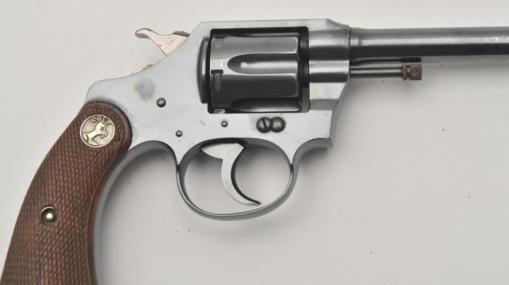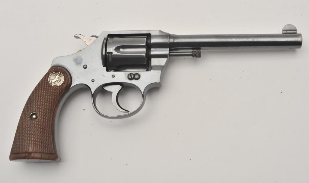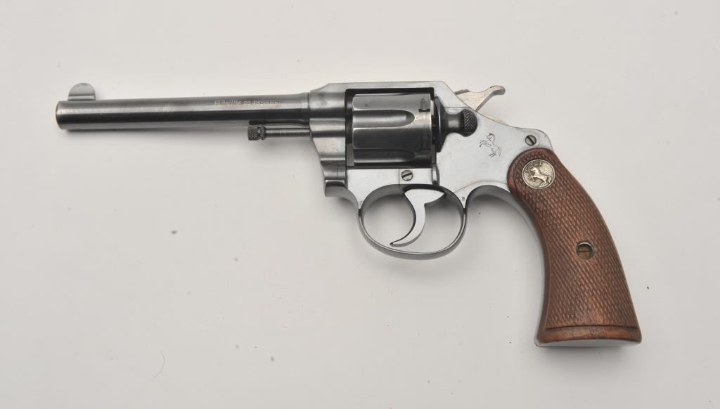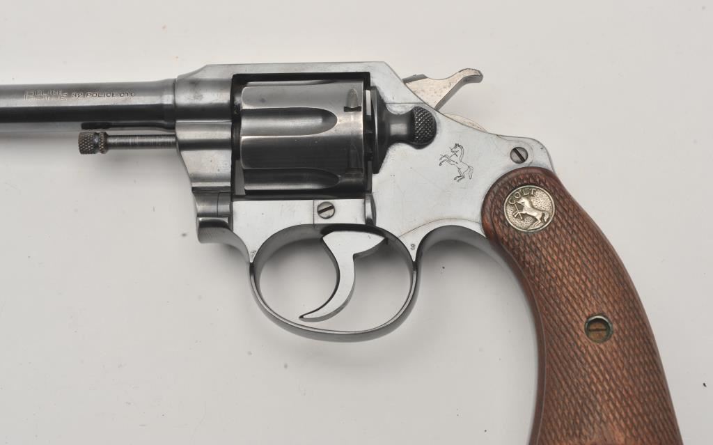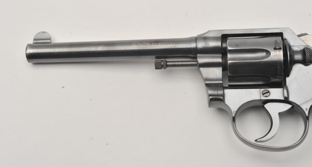 Colt Police Positive DA revolver, .32 Police caliber, 5” barrel, blued finish, checkered wood medallion grips, S/N 205981; overall very good + to fine condition with majority of original blued finish remaining, fine bore, crisp action, sharp markings and very good grips. (C&R/PPT). Est.: $250-$500.