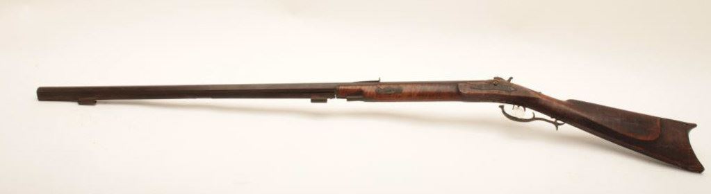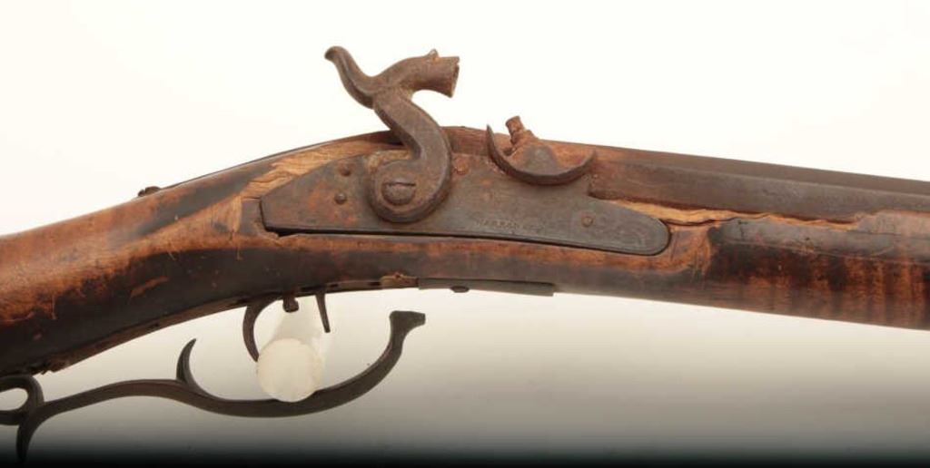 Relic condition half stock percussion rifle, .50 caliber, 38” un-marked octagon barrel, missing ramrod, double set triggers and action not working, brass mounted, single keyed wood stock; would make an interesting wall hanger. (percussion). Est.: $200-$400.