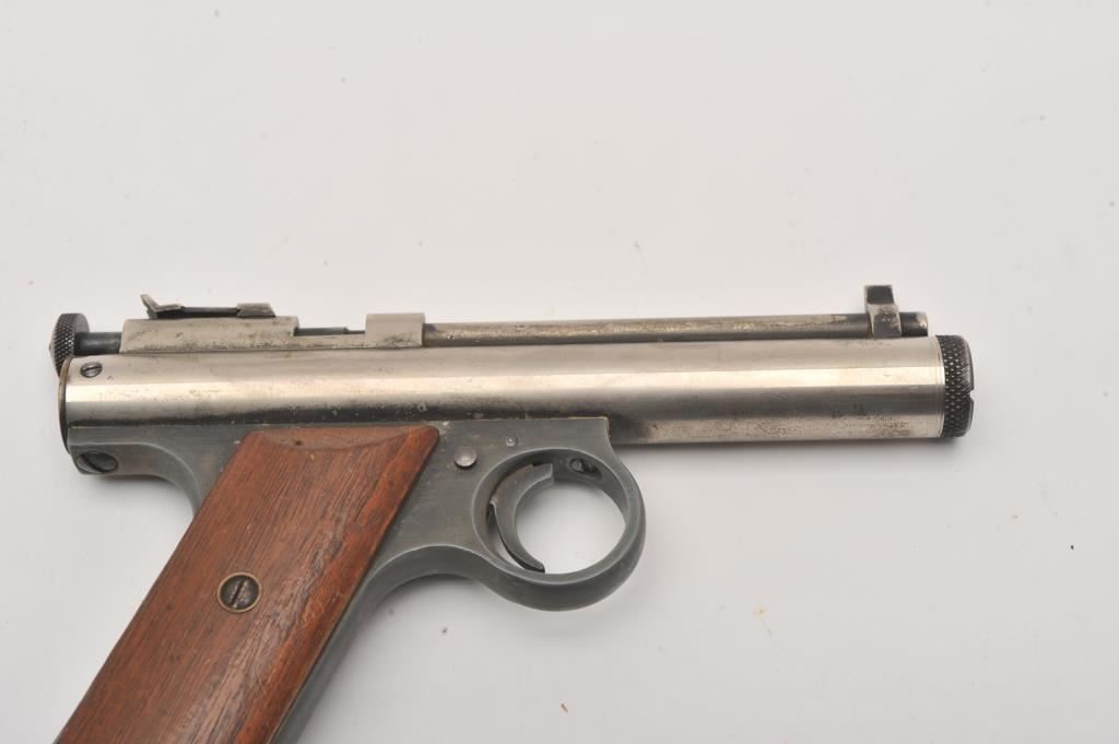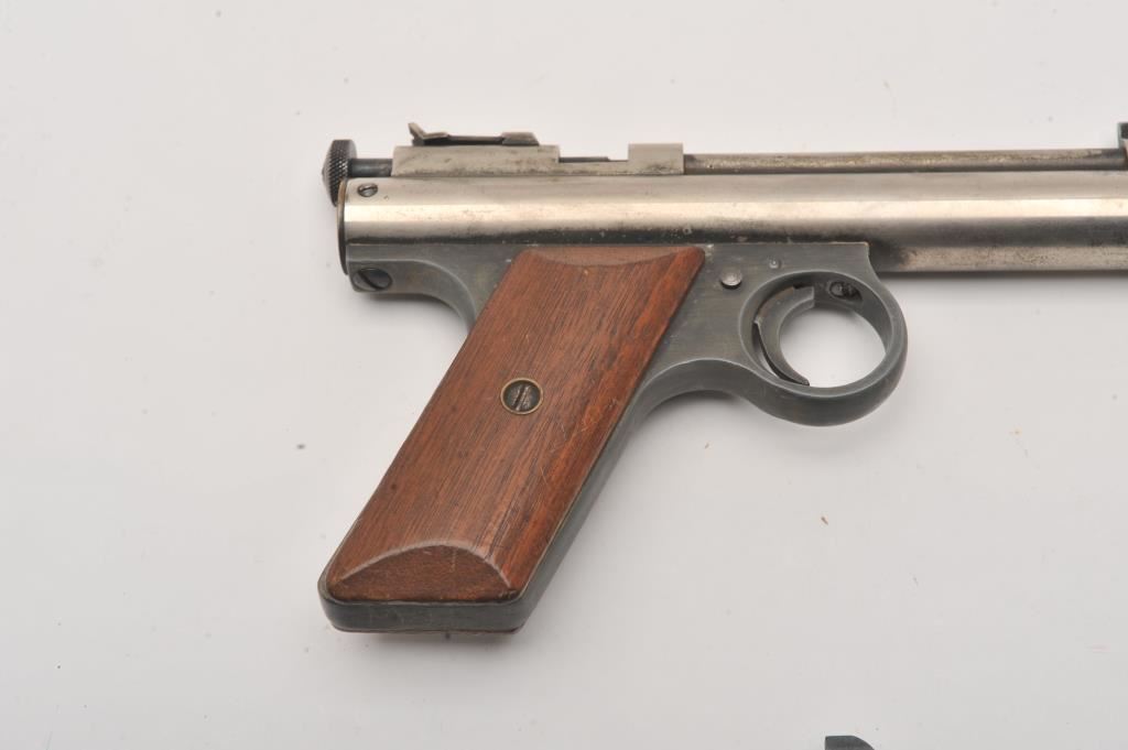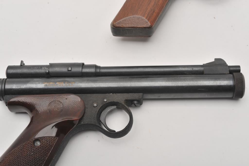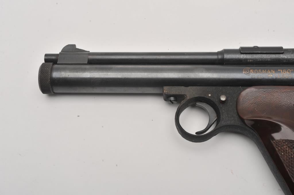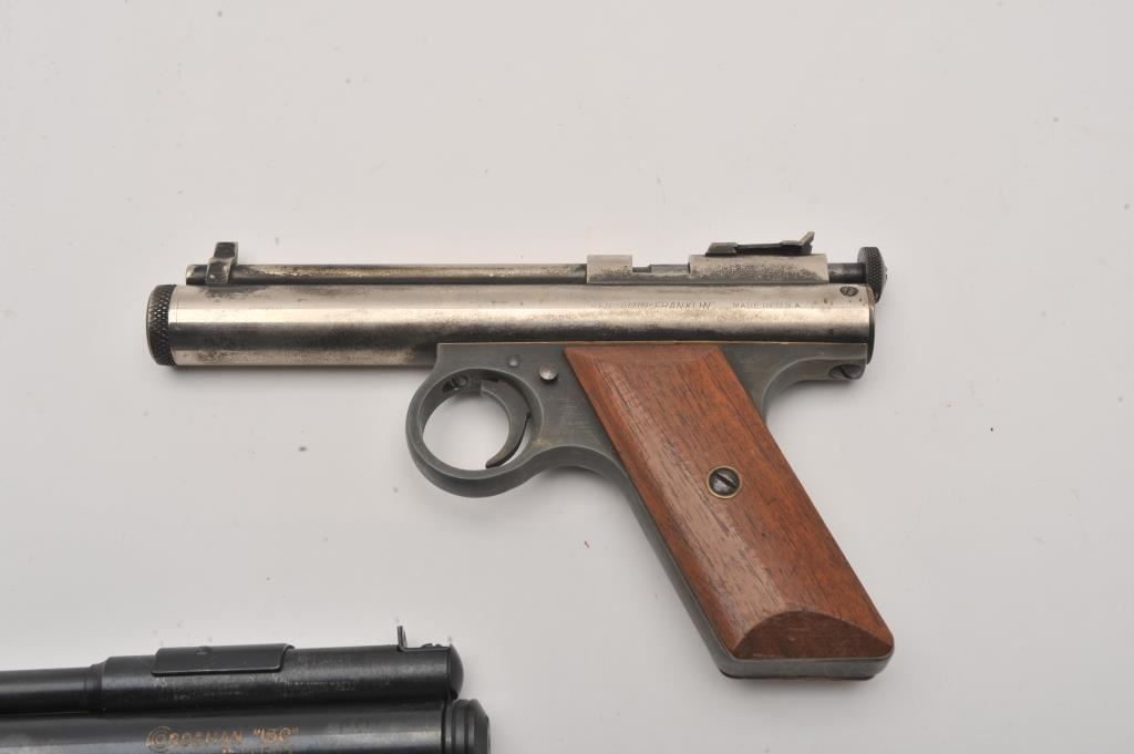 Lot of two CO2 air pistols. The lot includes a Benjamin Franklin .177 caliber pistol with a 5” barrel. The pistol has gone to a silver patina with some original finish in protected areas. The smooth wood grips are in good condition. The 2nd pistol is a Crosman Model 150 .22 caliber with a 6” barrel. The pistol retains a significant amount of its blue finish with checkered plastic grips. Est.: $100-$200.