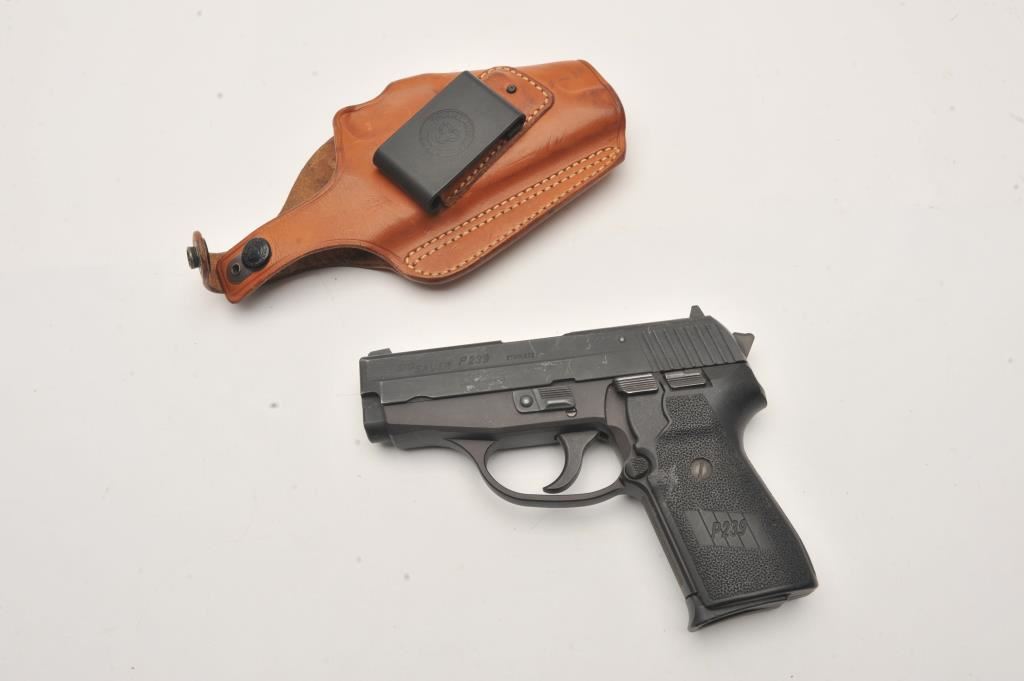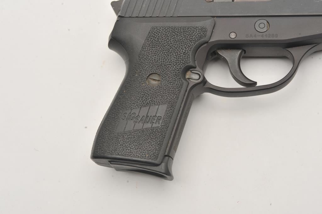 Sig Sauer P239 #SA4-44289, .357 Sig cal., 3 5/8" barrel, Nitrite finish, fixed sights with plastic grips. Pistol is in good condition overall, in need of a thorough cleaning. Bore is good, action is good, finish has numerous scratches from carry and use. Some holster wear. Includes Galco leather holster (too big) and one correct mag. (Modern / PPT) Est. $300-600