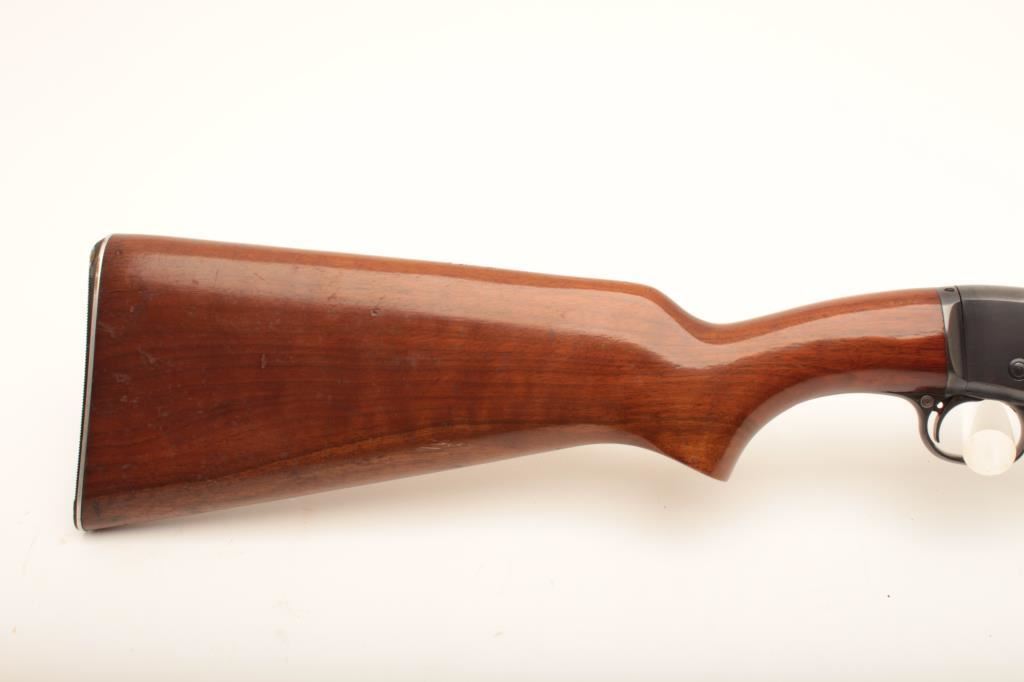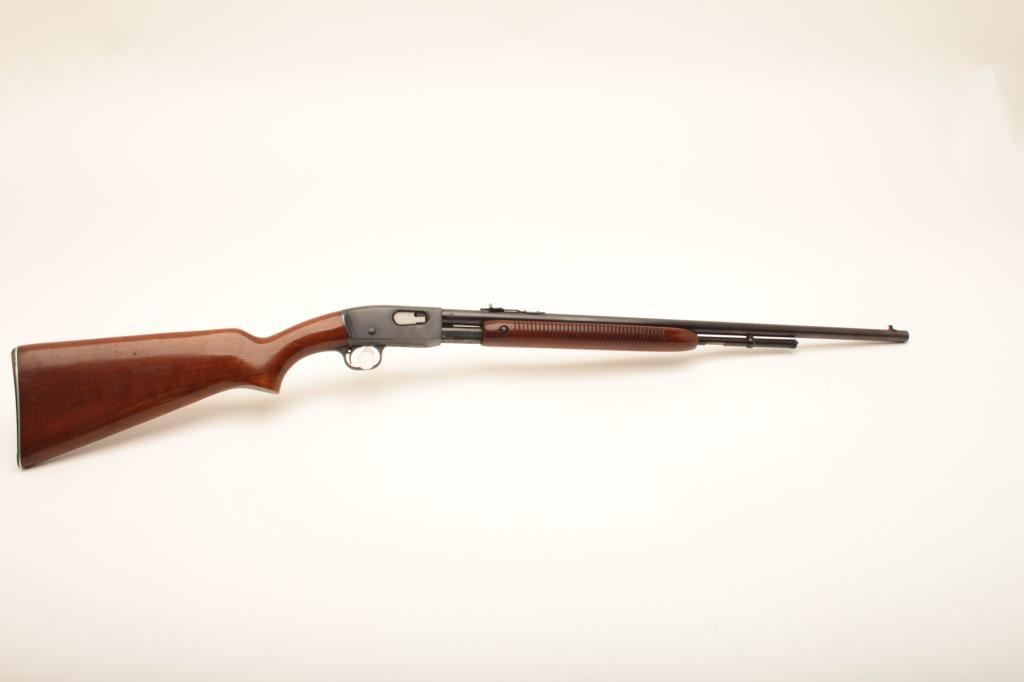 Remington Model 121 The Field Master pump rifle, .22 Short, Long or Long Rifle caliber, Serial #196200. The rifle is in fine overall condition with a 24” barrel. The barrel and half magazine retain the majority of their blue finish with light wear at the muzzle. The receiver retains nearly all of its blue finish with high point edge wear noted. The barrel indicates the rifle was manufactured in 1953. The smooth wood stocks are in very good condition with small mars and compressions consistent with field use. The butt stock ends with a Remington marked steel butt plate. The bore is good, the action crisp and markings are sharp. Est.: $250-$500. (C+R).