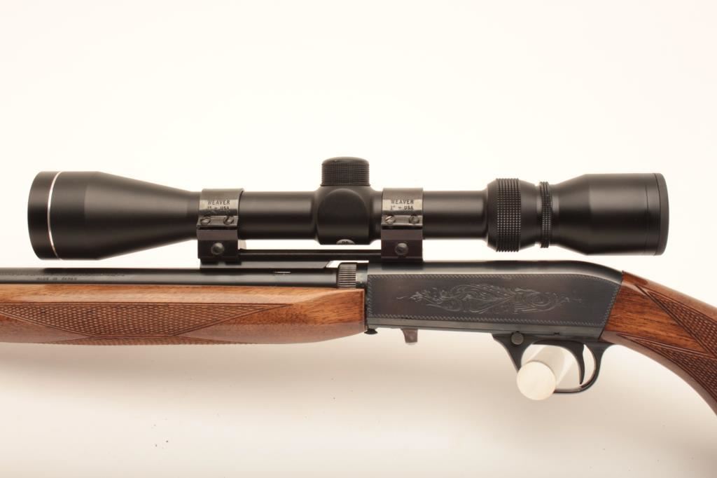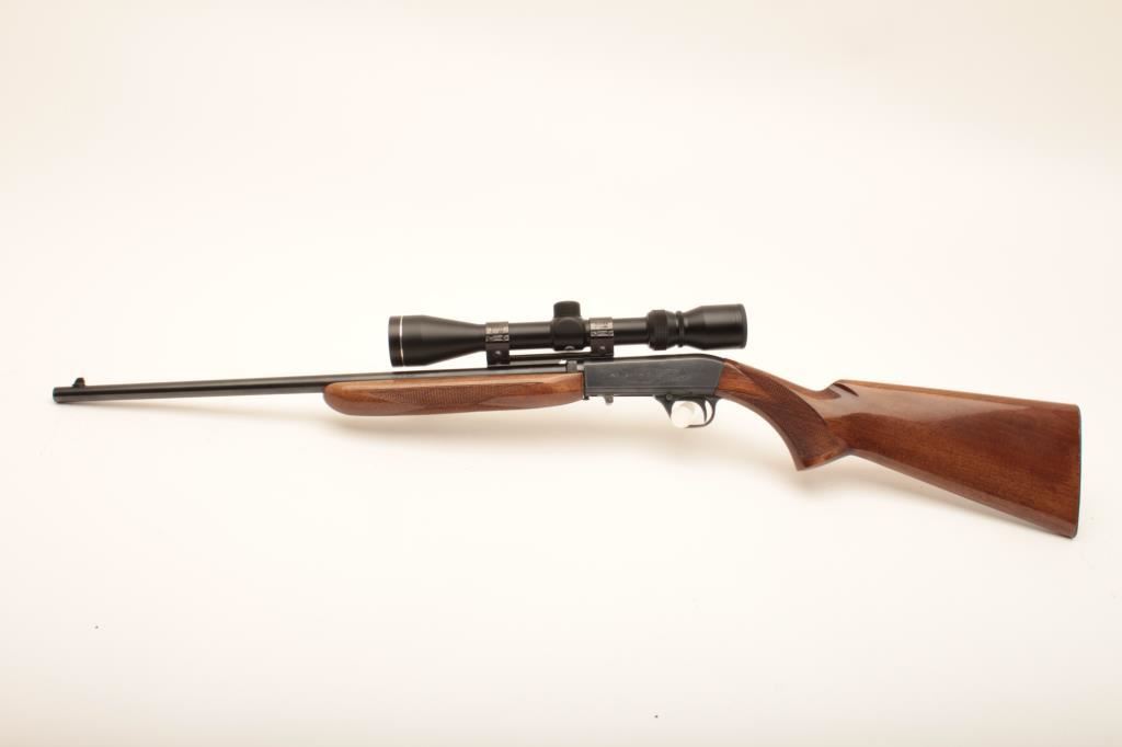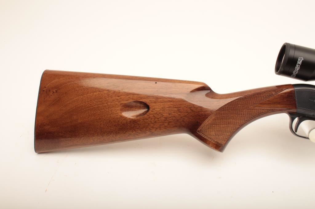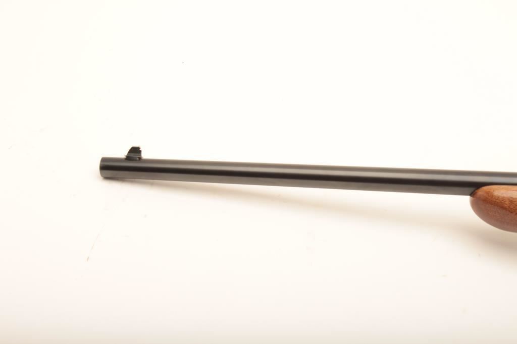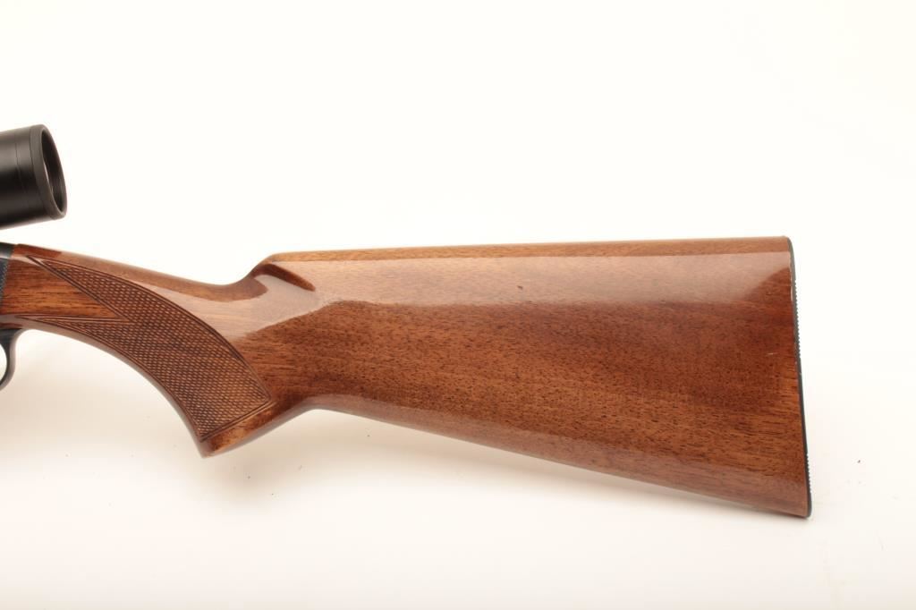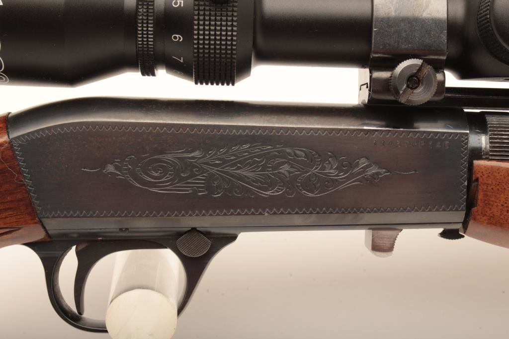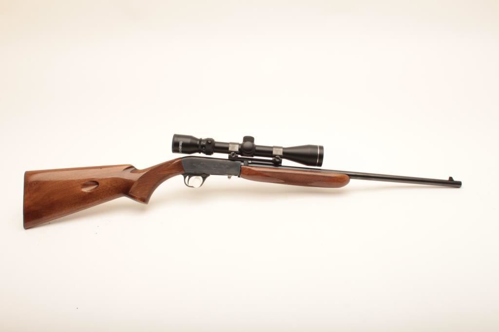 Browning SA-22 semi-automatic takedown rifle, .22 Long Rifle caliber, Serial #11457RP146. The rifle is in very good overall condition with a 19” barrel. The metal surfaces retain the majority of their blue finish with light wear at the muzzle and high point edge wear. The receiver and trigger guard are lightly engraved while the barrel is marked, “MADE IN JAPAN”. The checkered wood stocks are in very good condition with small mars and compressions consistent with field use. The butt stock ends with a checkered steel butt plate. The rifle is topped with Weaver tip-off rings and a Tasco variable power scope with clear, crisp optics. The bore is good, the action is crisp and the markings are sharp on this desirable Browning ATD. Est.: $250-$500. (Modern).
