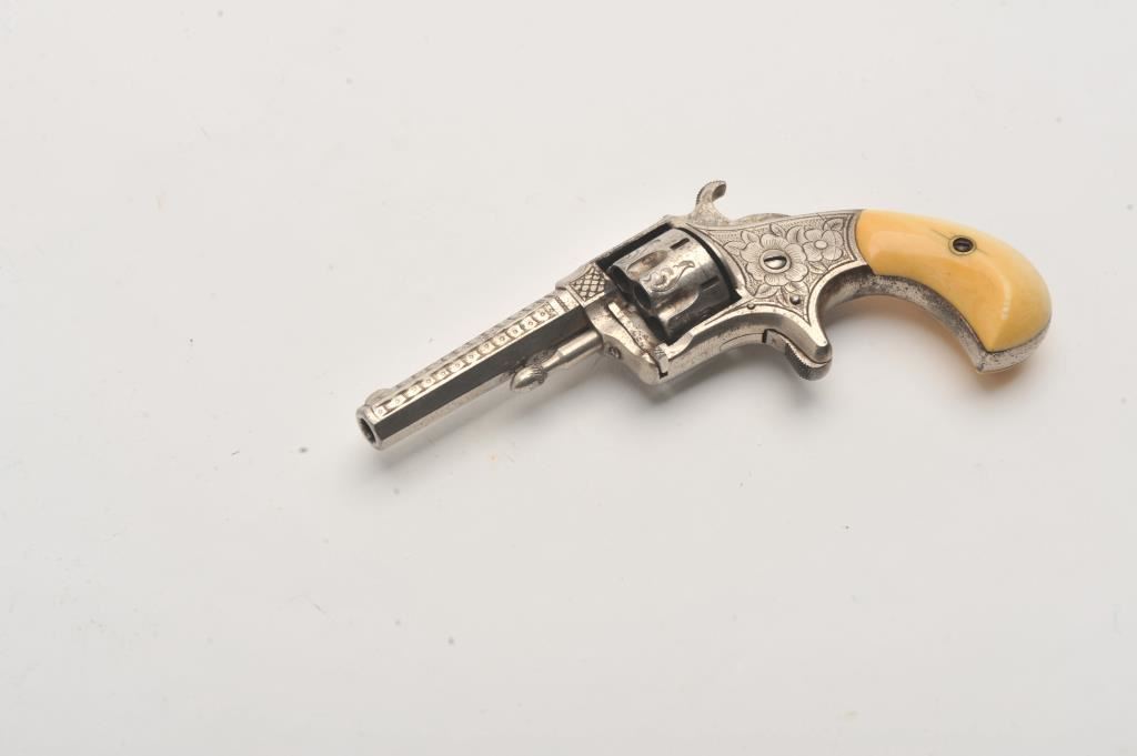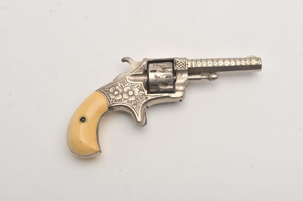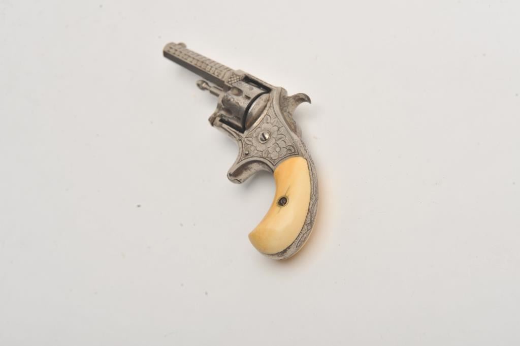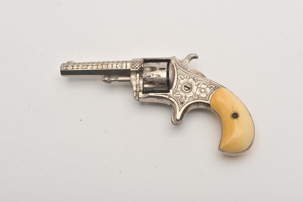 A fine factory engraved Hopkins and Allen XL No 1 with beautiful original ivory grips and nearly full coverage engraving. .22 caliber with floral engraving on frame. Lovely collectible little revolver has nearly all its bright nickel finish, strong action and great old ivory grips. Has been in a private collection for decades. Hard to find a better example. Estimate 300-600