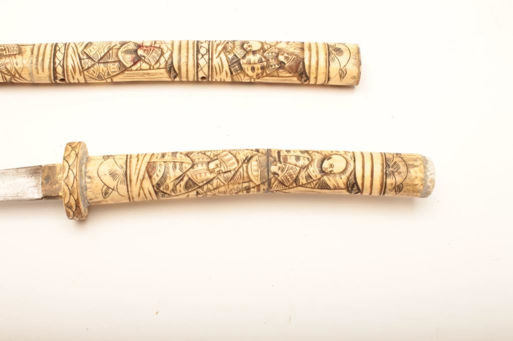 ) Japanese sword in elaborately carved and scrimshawed bone mounts. Measuring 34 inches overall the handle and scabbard are very well carved with figures of priests. 17 inch samurai type blade with no visible temper and brass habaki. Blade is in fair state of polish and mounts have some minor fill but overall very showy and nearly 3 feet long. Late 19th century. Estimate: 500-750