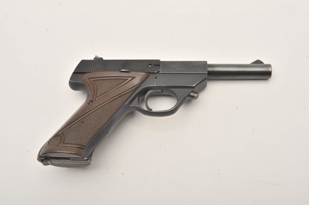 Hi-Standard Flight King first model, #442934, .22 short cal., 4 1/2" barrel, blued finish, fixed sights, with checkered plastic grips. Pistol is in very good condition overall, showing approx. 95% original finish, thinning slightly at the muzzle and high points. The barrel shows minor spots of erosion which has been cleaned. The grips are very good plus with no chips or cracks. The bore and action are very good. Includes one correct mag. (C&R / PPT) Est. $250-500