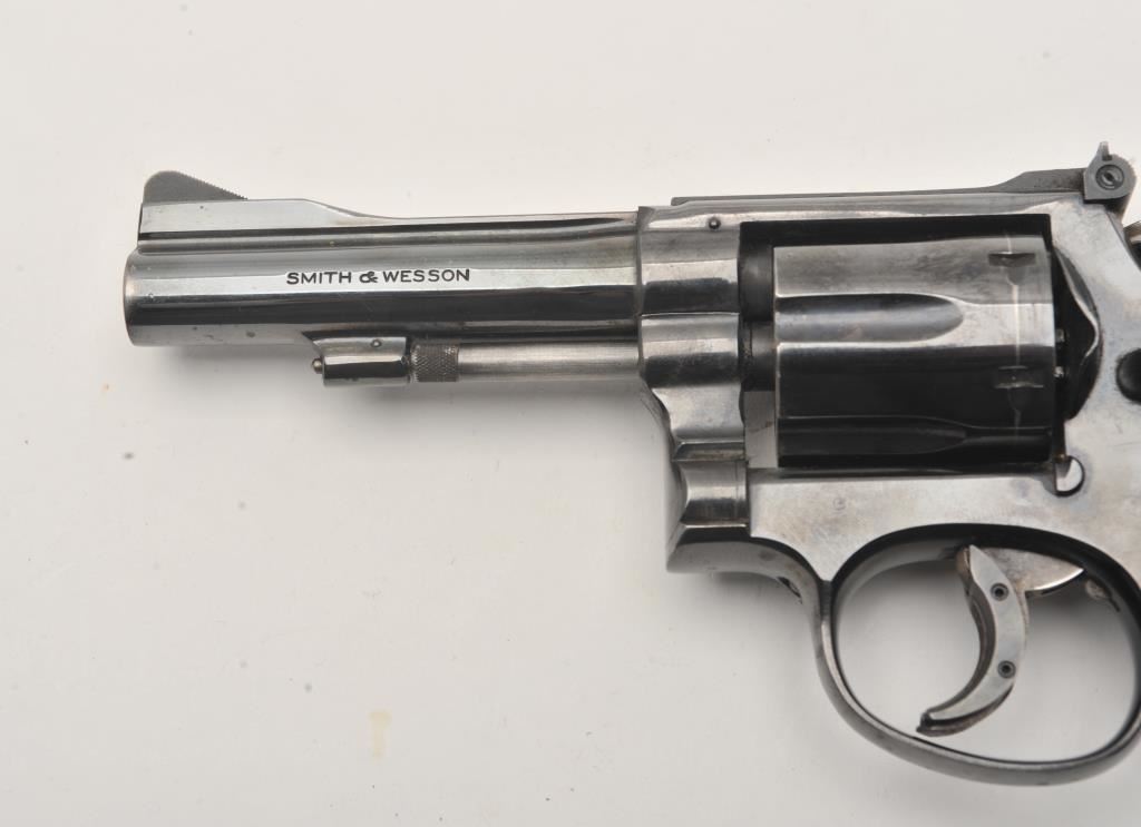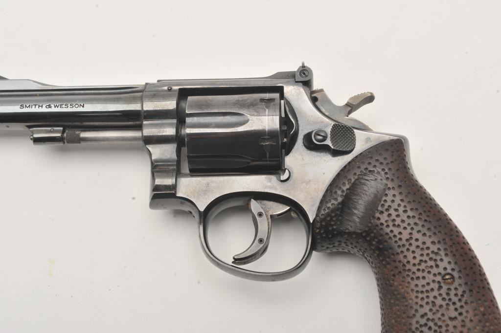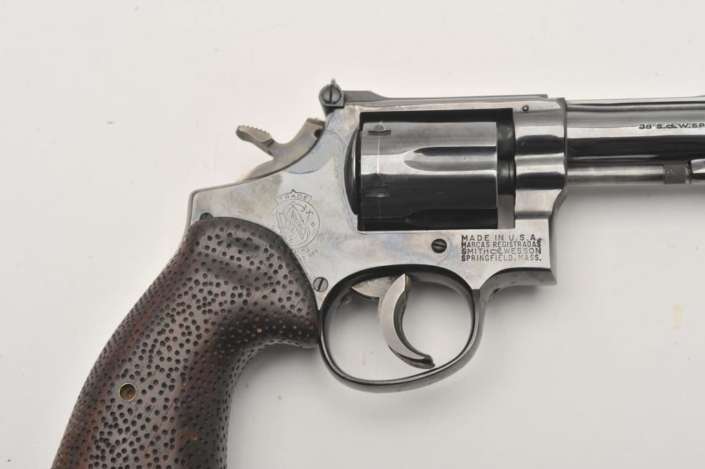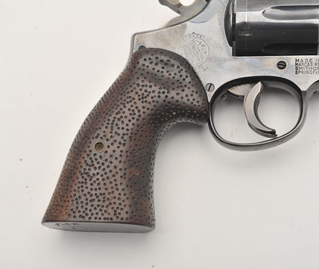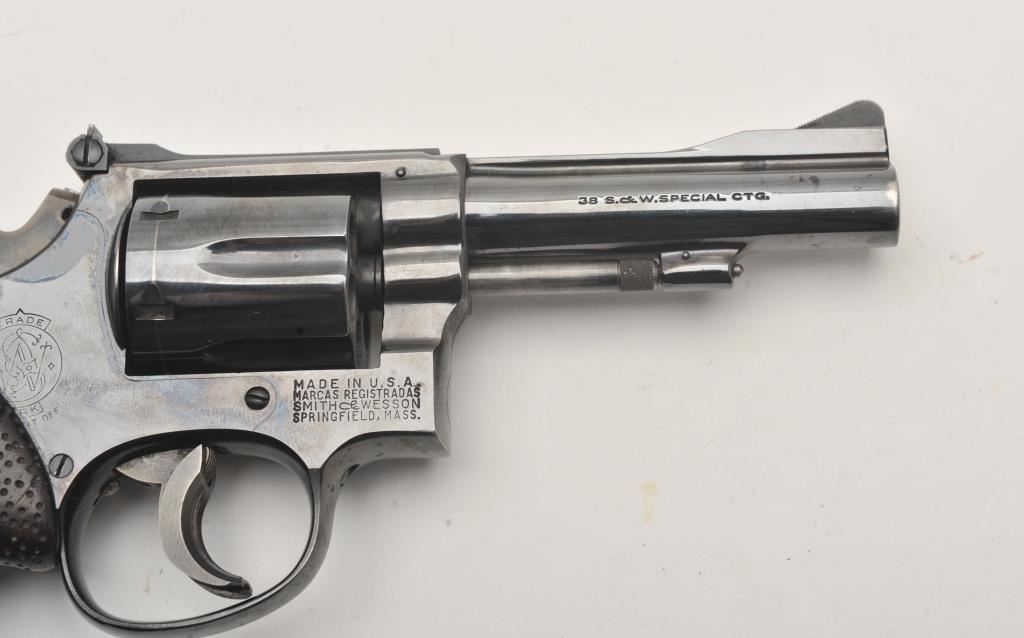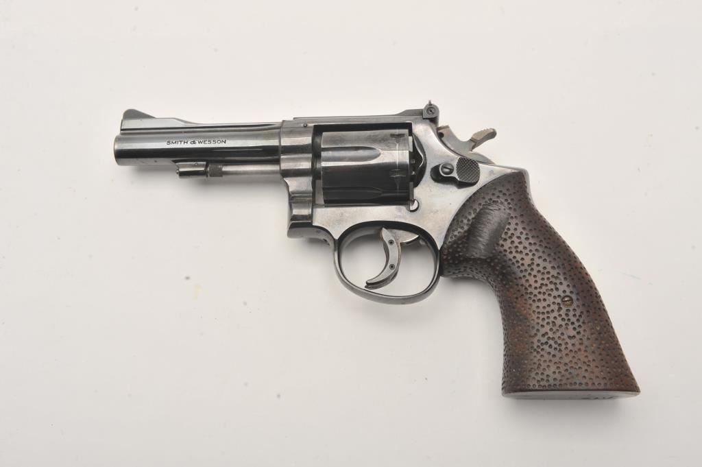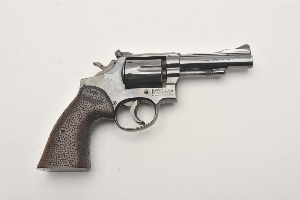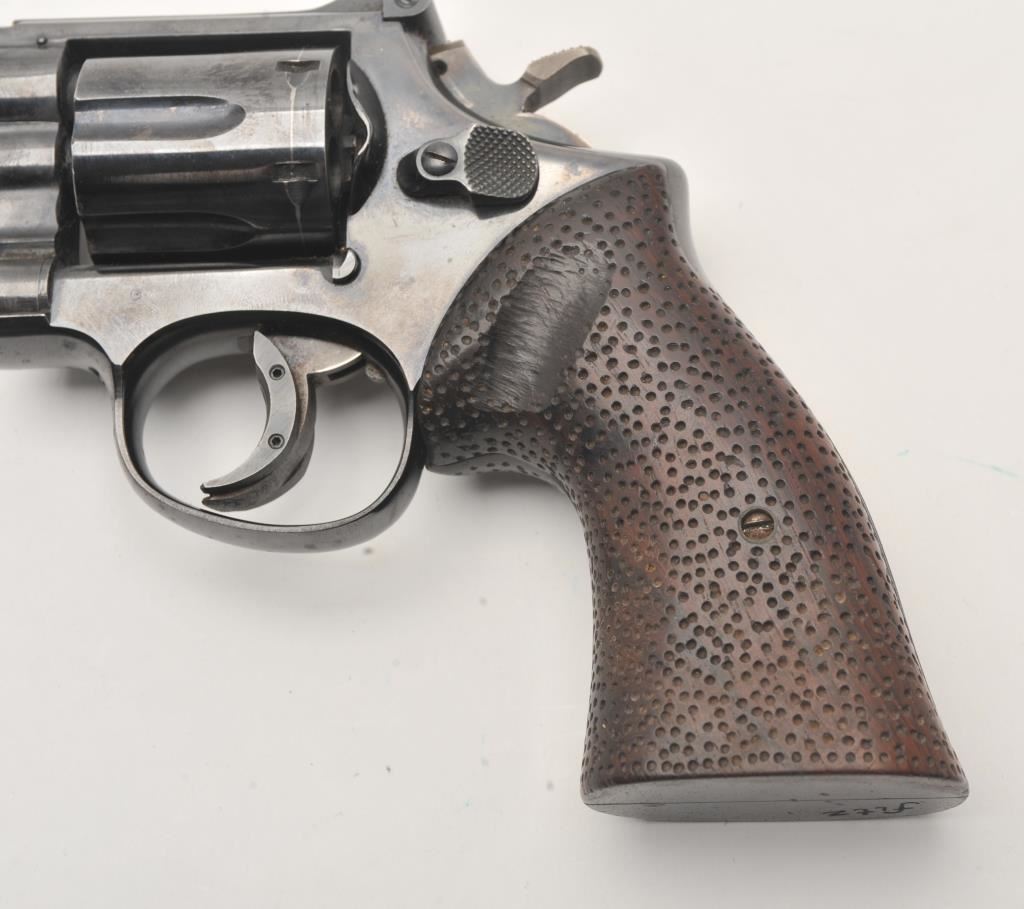 Smith & Wesson Model 15 revolver, .38 Special caliber, Serial #K583539. The pistol is in good overall condition with a 4” barrel with a ramped front and adjustable rear sights. The metal surfaces retain the majority of their blue finish with wear at the muzzle and the desirable four-screw frame. The hammer and trigger show muted case hardening with a trigger shoe added. The textured wood combat grips are in very good condition and marked, “fitz” at the base. The bore is good, the action is crisp and markings are sharp on this Smith & Wesson K frame. Est.: $400-$800. (C+R).