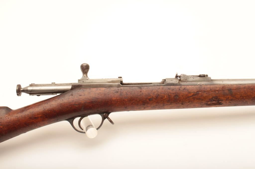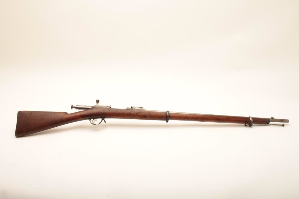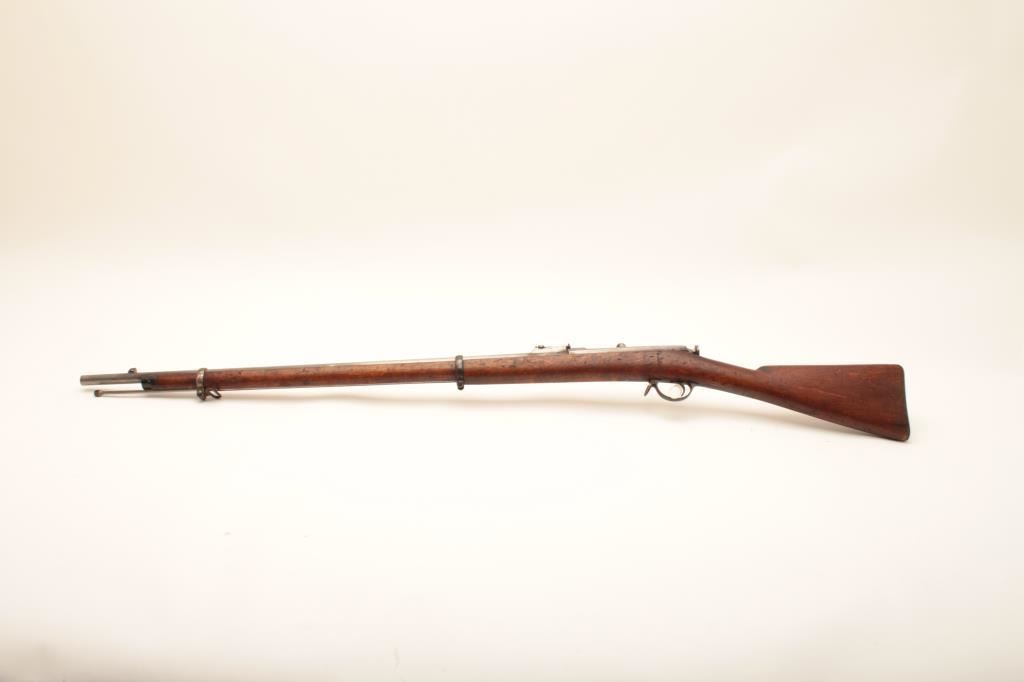 Russian Berdan No. 2 single shot rifle, 10.75 x 58R caliber, Serial #120243. The rifle is in fair overall condition with a 33” barrel with a blade front and military ladder style rear sights. The metal surfaces are a uniform silver/grey patina that appears to have been cleaned. The Russian Crest is displayed on the front ring and the action is dated 1881. The rifle retains the cleaning rod, sling swivels and has non-matching serial numbers. The smooth wood stock is in good condition with mars and compressions consistent with service use and a couple small cartouches behind the trigger guard. The bore is fair, the action crisp and markings are sharp. The Berdan rifle was designed by Hiram Berdan and in service with the Russian army from 1870-1891, until replaced by the Mosin-Nagant. Est.: $500-$1,000. (Antique).