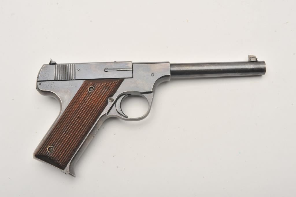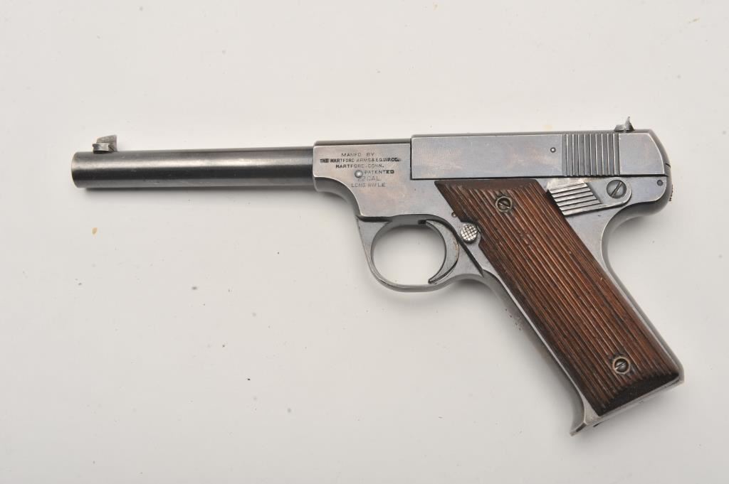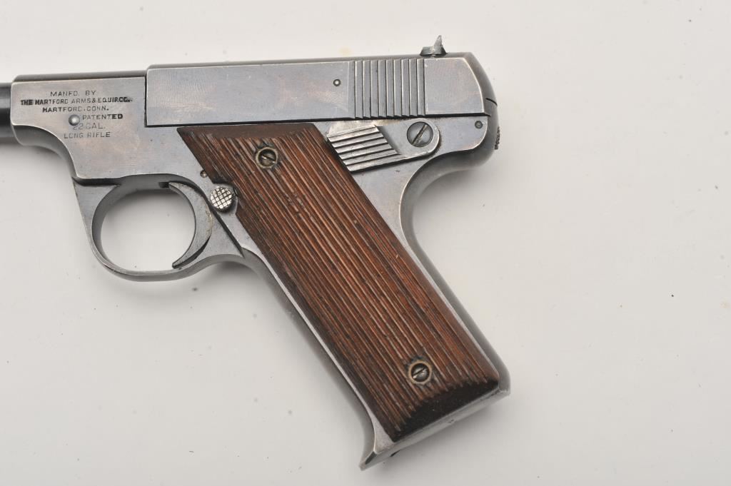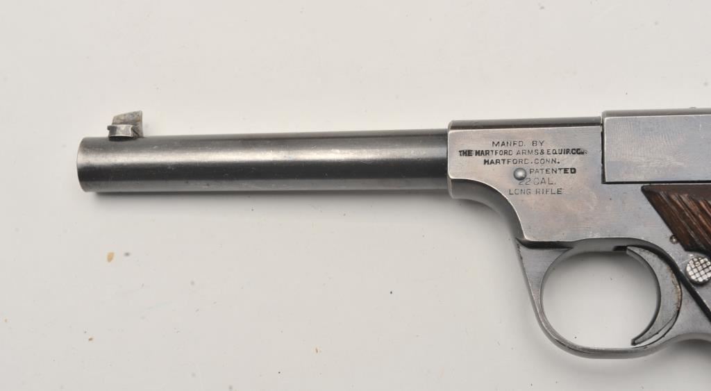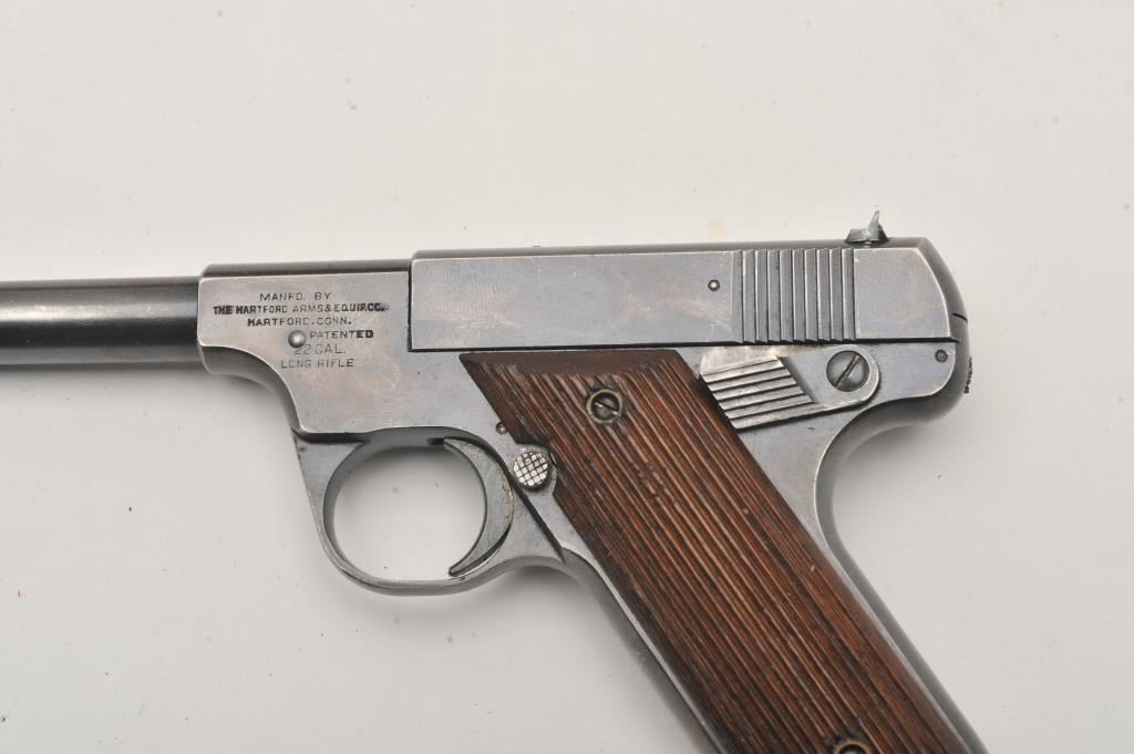 Hartford Arms and Equipment Co Model 1925 Target single shot, #1270, .22 LR cal., 5 3/8" barrel, blued finish, fixed sights, with grooved grips. Pistol is in very good condition overall, showing 90%+ original finish, thinning. The grips are very good plus with no chips or cracks. The bore and action are very good. Includes incorrect box in fair condition. Est. (C&R / PPT) $250-500