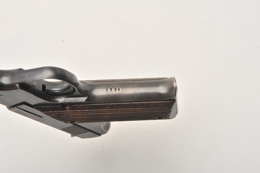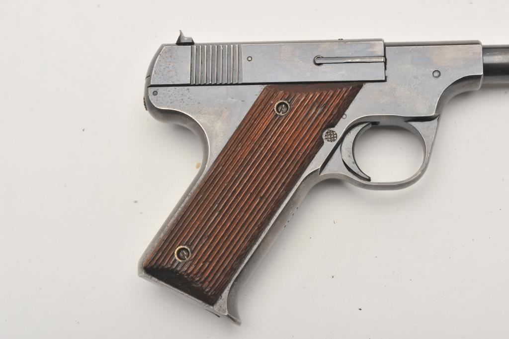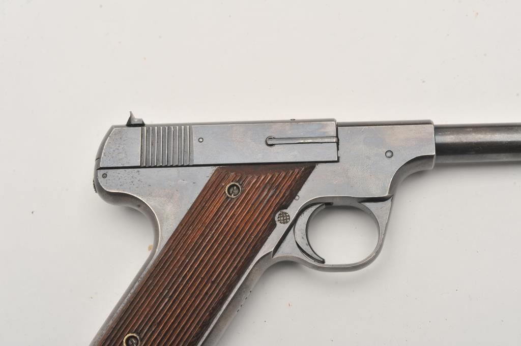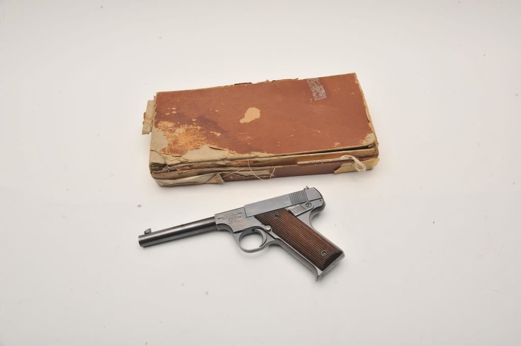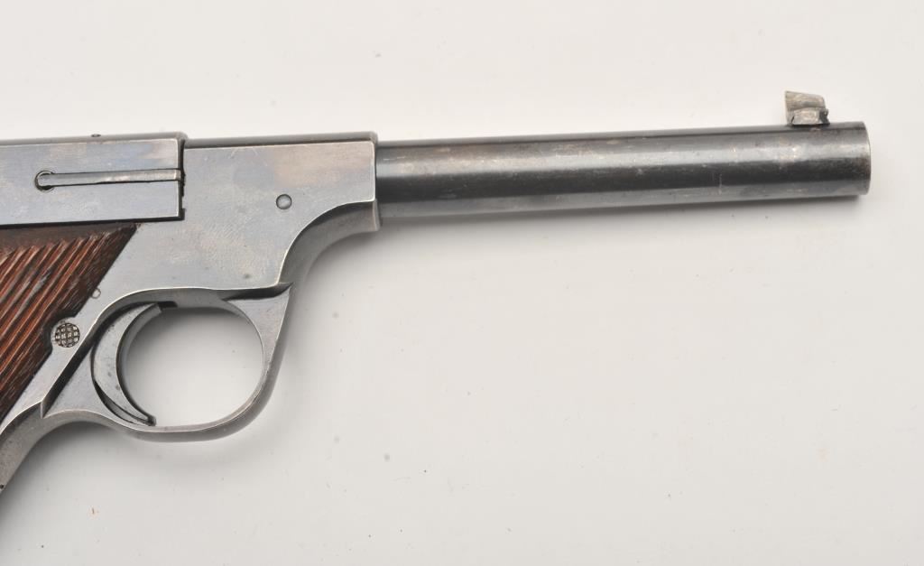 Hartford Arms and Equipment Co Model 1925 Target single shot, #1270, .22 LR cal., 5 3/8" barrel, blued finish, fixed sights, with grooved grips. Pistol is in very good condition overall, showing 90%+ original finish, thinning. The grips are very good plus with no chips or cracks. The bore and action are very good. Includes incorrect box in fair condition. Est. (C&R / PPT) $250-500
