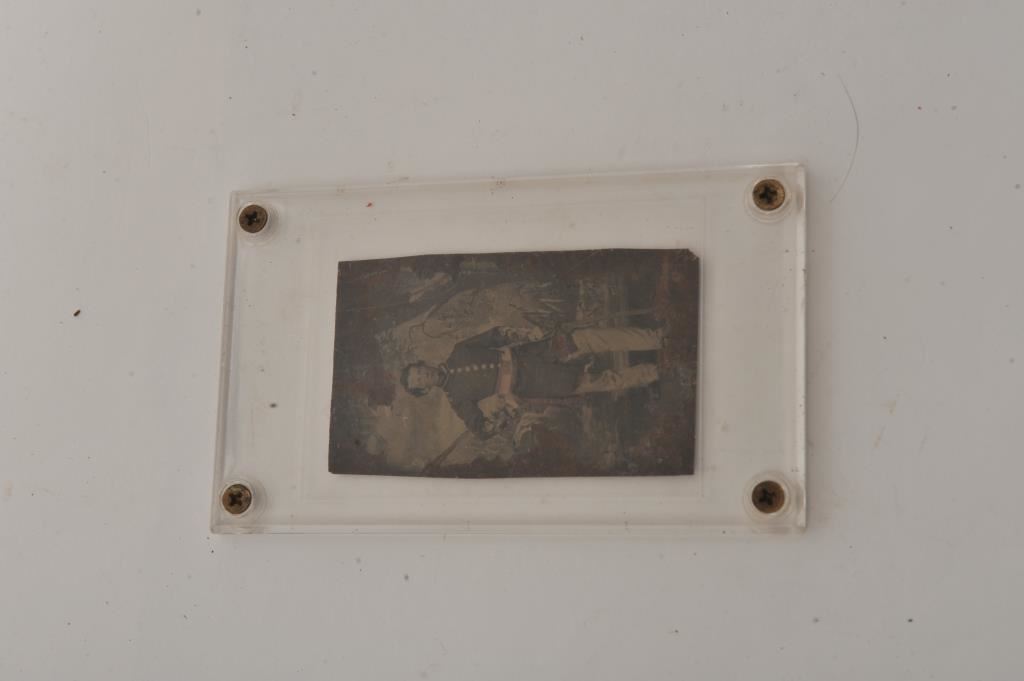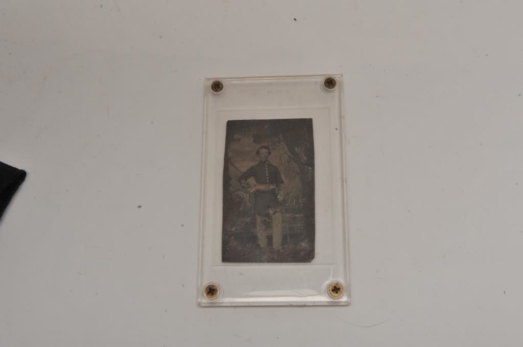 Tintype of Civil War Officer in uniform; contained in protective plastic casing. Est.: $50-$100.