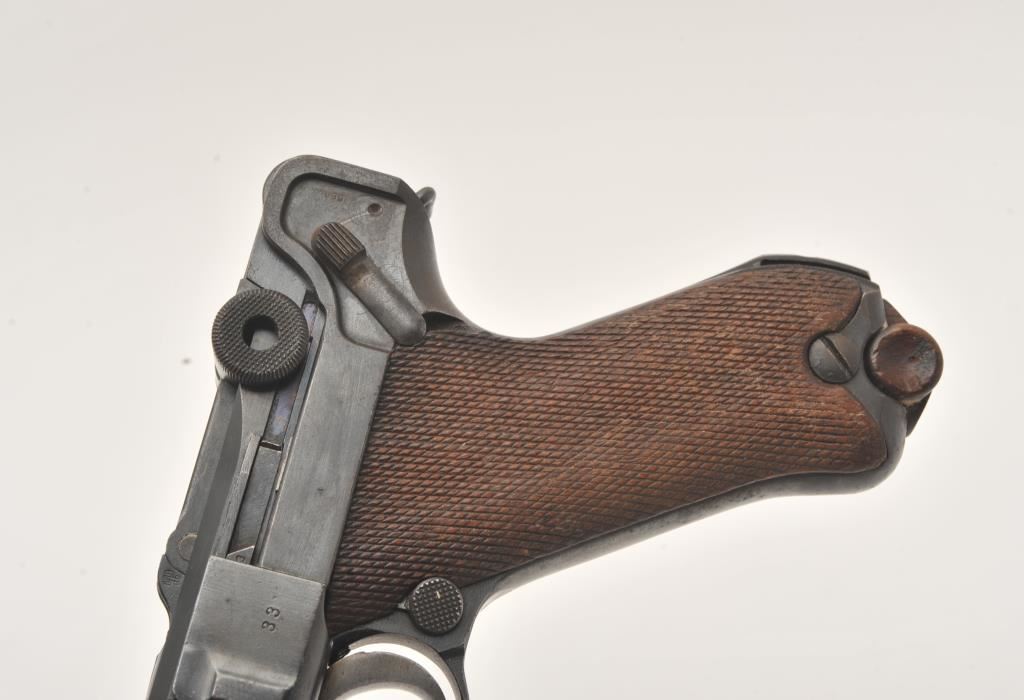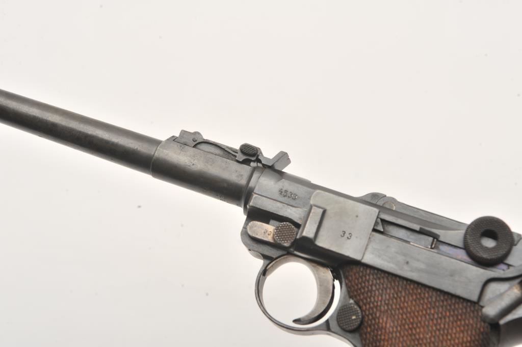 DWM Artillery Luger semi-automatic pistol, 9 x 19mm Parabellum, Serial #4533. The pistol is in good overall condition with an 8” barrel. The barrel features a ramped blade front and eight position tangent rear sights. The pistol retains the majority of its muted blue finish with light surface erosion on the barrel and all matching visible serial numbers. The frame has numerous proof marks and the front ring is dated 1918. The trigger and various small parts show old, toning straw finish. The checkered wood grips are in good condition showing moderate to heavy use with small mars and flattening of the checkering. The bore is fair, the action is crisp and the markings are sharp on this desirable WWI era artillery Luger. The lot includes one correct magazine. Est.: $900-$1,800. (C+R).