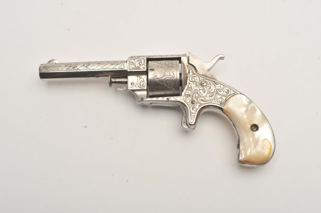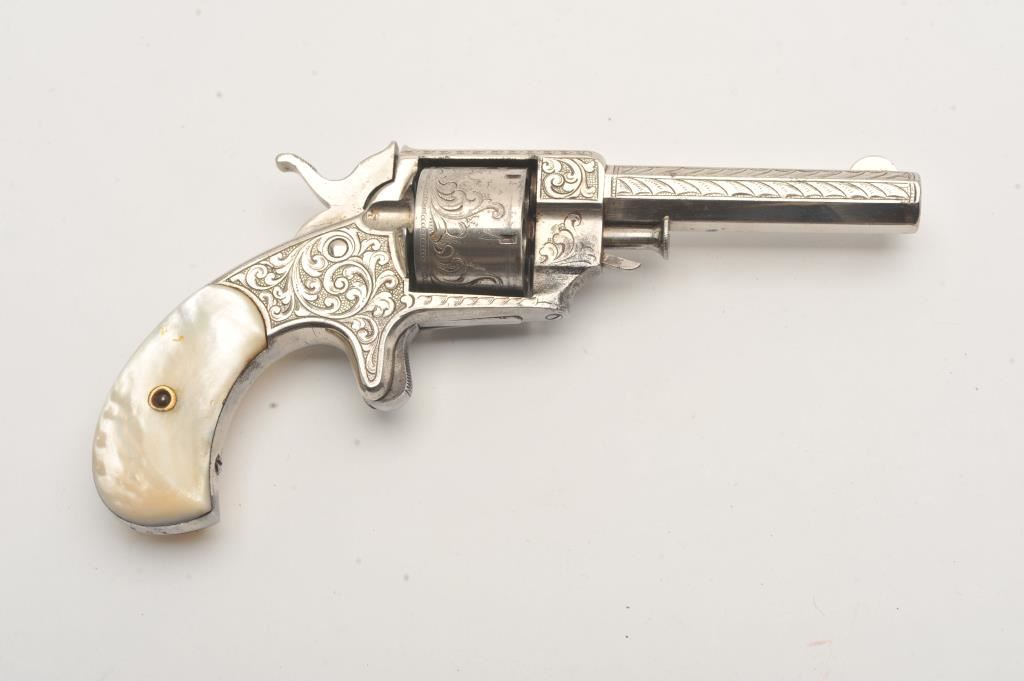 An Exhibition Factory Engraved Forehand and Wadsworth Center Hammer .32 with Factory Pearl Grips. Flayderman 8A-060. Made in the 1870's this is an exhibition quality revolver. 3 and 1/2 inch octagonal barrel marked on top flat: Forehand & Wadsworth, Worcester, Mass. U.S. Pat. Sept 24. Oct 22/61-Jany. 27/71. The frame, barrel and cylinder elaborately engraved with foliage on a punch dot ground. Lovely original grips with great 'fire' and no chips whatsoever. Barrel has nearly all original nickel with perfect address and engraving. Frame has much original nickel with losses mostly on backstrap and underside where steel has been polished. Cylinder is polished bright and may have been so originally as engraving is sharp. Action is good as is bore. This is a highly decorated Western Expansion period American revolver that would enhance anyone's collection. From a decades old private collection. Est:$1200-1800