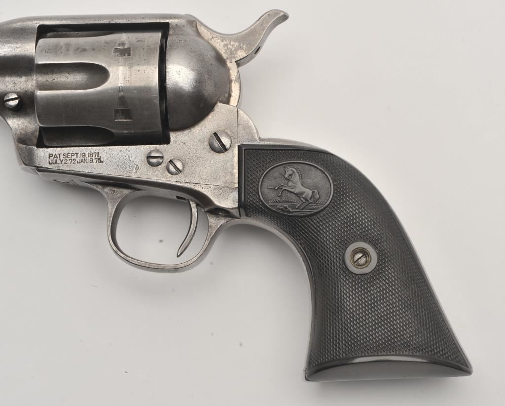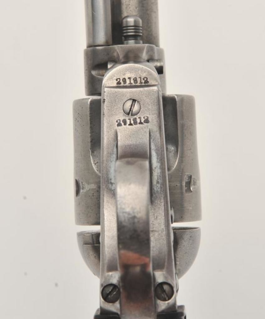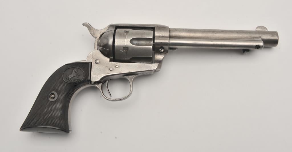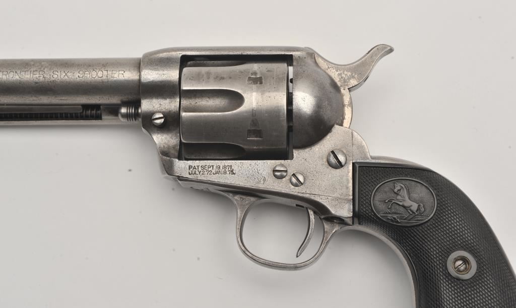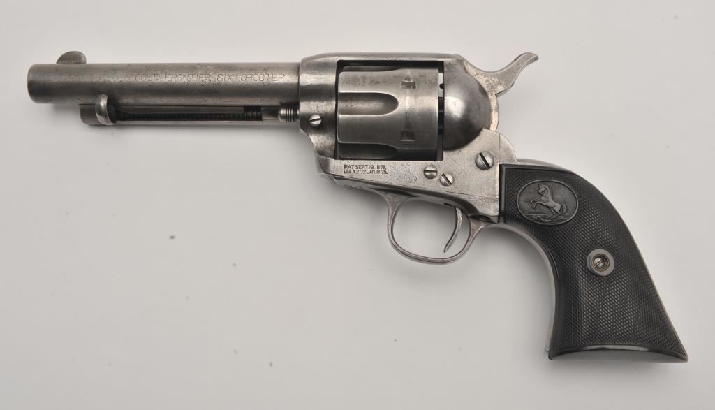Colt SAA revolver, .44/40 caliber, 5.5” barrel, grey patina, checkered hard rubber grips, S/N 291812; overall good condition with an even grey patina to metal surfaces and scattered light pinprick pitting, crisp action, good markings, fair bore and good grips. (C&R/PPT). Est.: $1,500-$3,000.