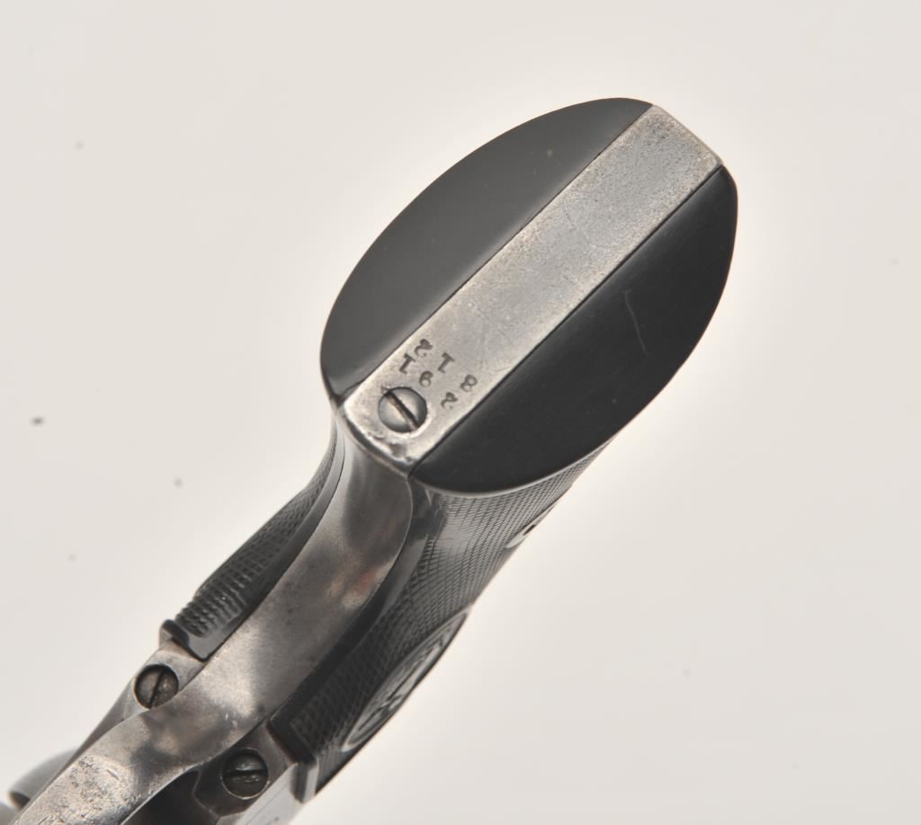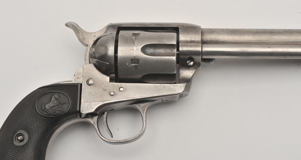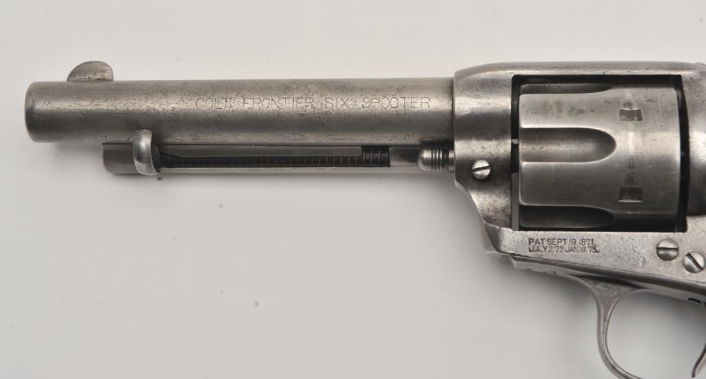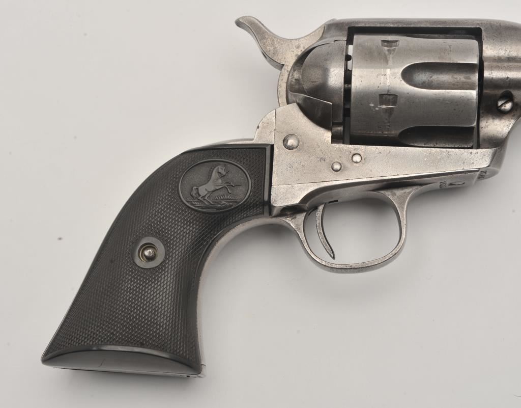 Colt SAA revolver, .44/40 caliber, 5.5” barrel, grey patina, checkered hard rubber grips, S/N 291812; overall good condition with an even grey patina to metal surfaces and scattered light pinprick pitting, crisp action, good markings, fair bore and good grips. (C&R/PPT). Est.: $1,500-$3,000.