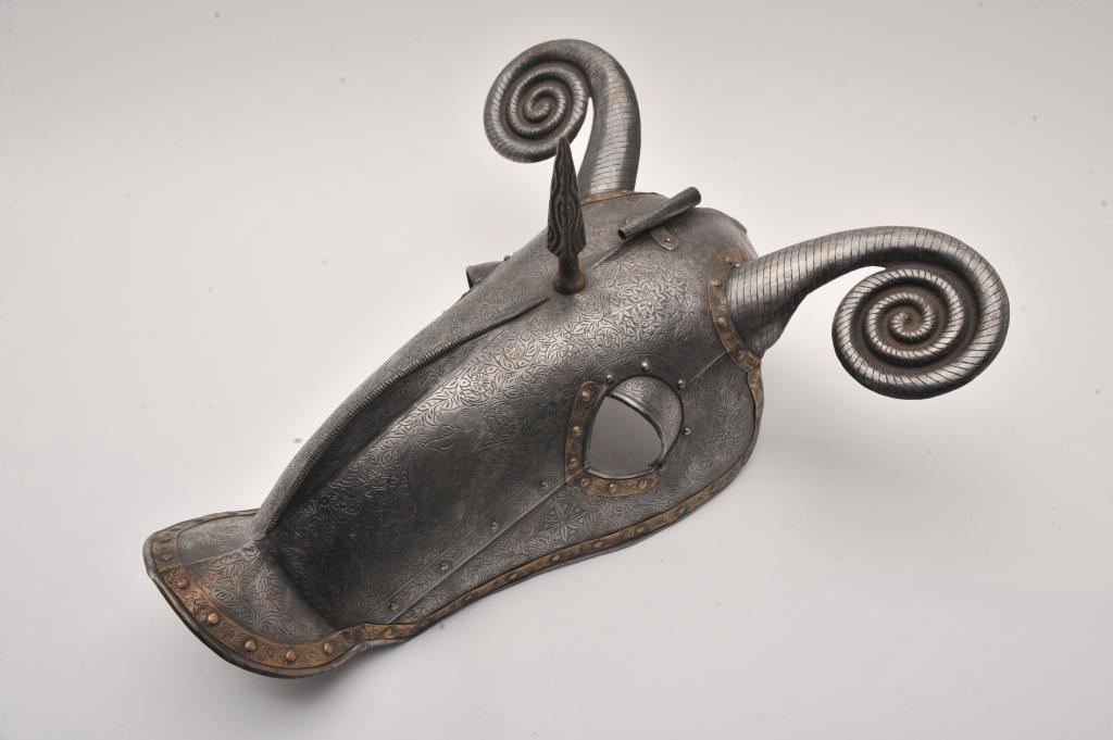 Chanfron or horse armour from area of India or region. Well and properly constructed with decorative etching and quality metal work. 19th to early 20th century for parade. Measures 24” from end to end. Nicely engraved unicorns on the two front panels. Though not an early battle armour a very nice and decorative chanfron that has a bit of age. Est.: $900-1800