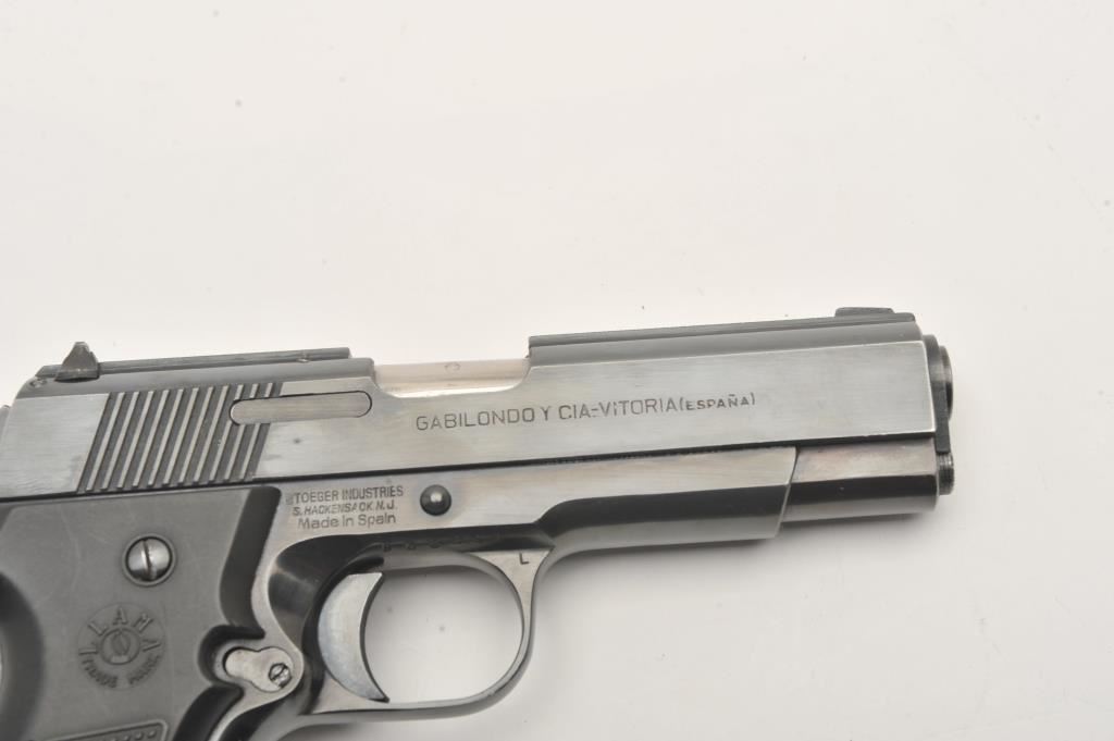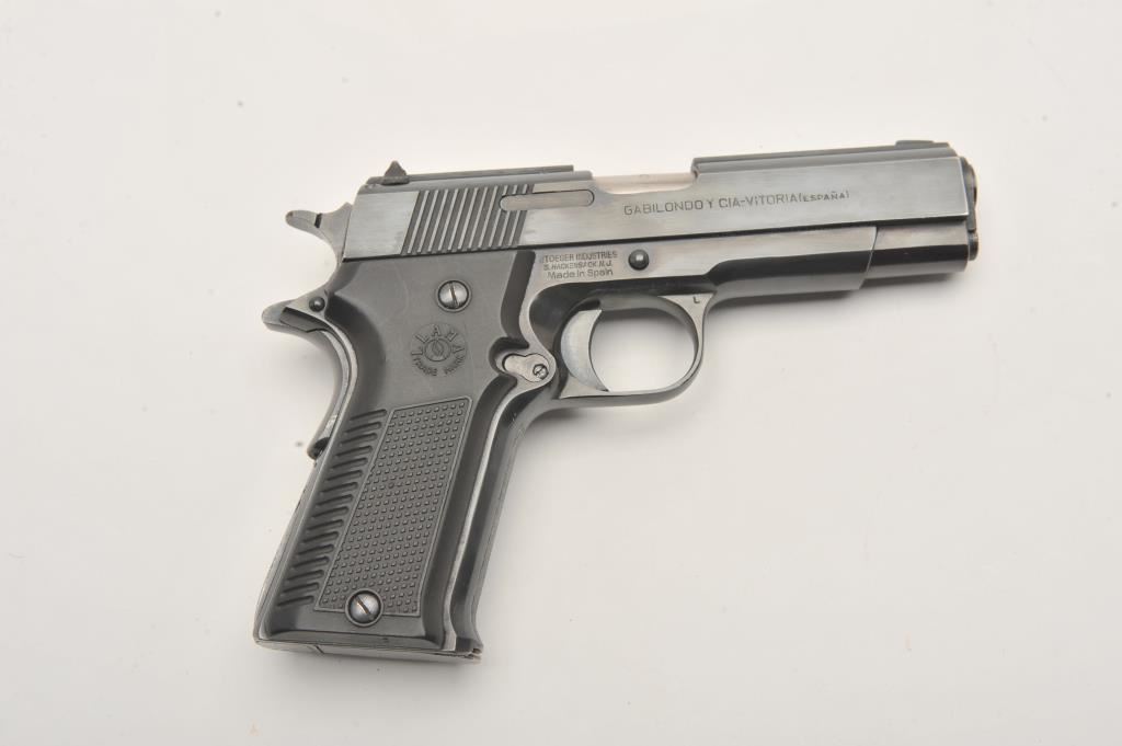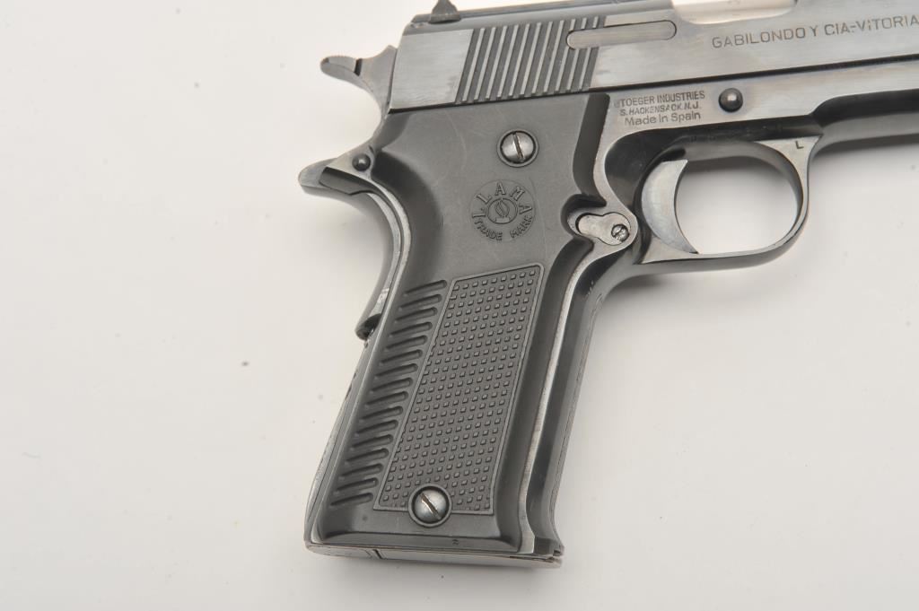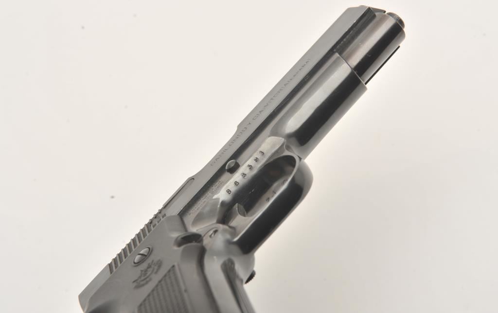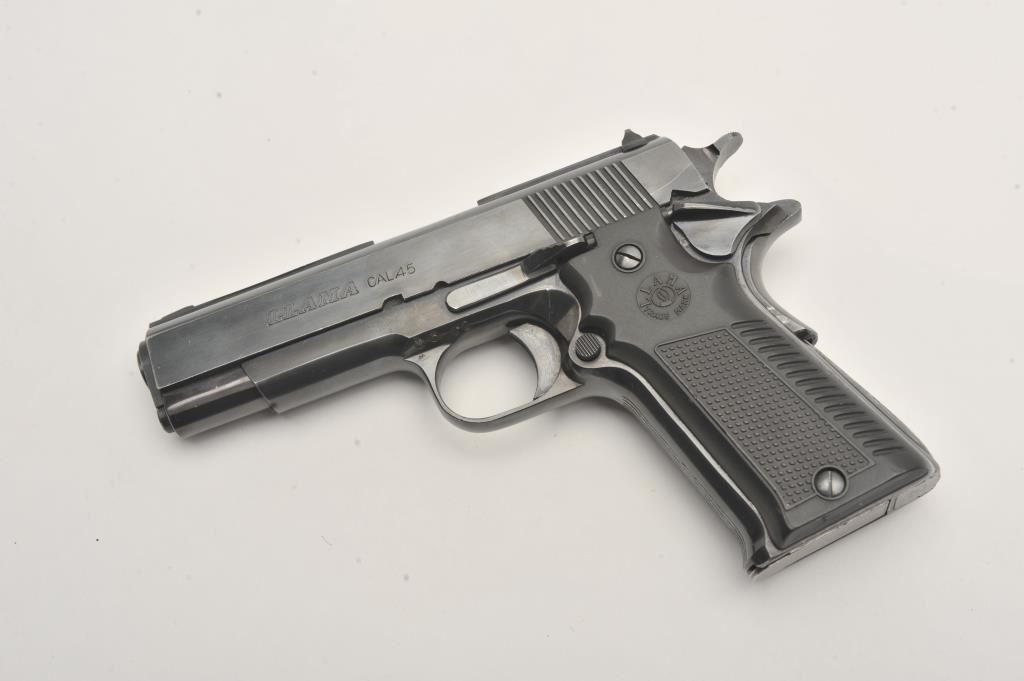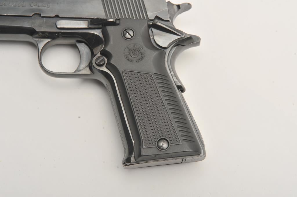 Llama Model IX-B semi-automatic pistol, .45 caliber, Serial #B68391. The pistol is in very good to nearly fine overall condition with a 4 ¼” barrel. The pistol retains nearly all of its blue finish with high point edge wear and small scratches. The left side of the frame has several proofs while the right side is import marked. The checkered plastic grips are in very good condition with sharp checkering. The bore is very good, the action is crisp and the markings are sharp. The lot includes one correct magazine. Est.: $300-$600. (Modern/PPT).