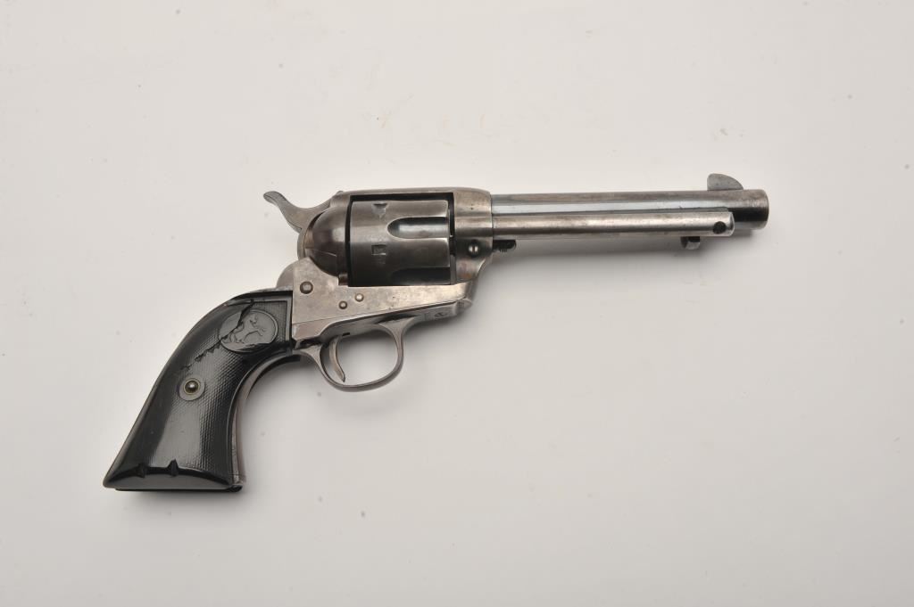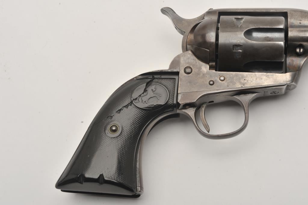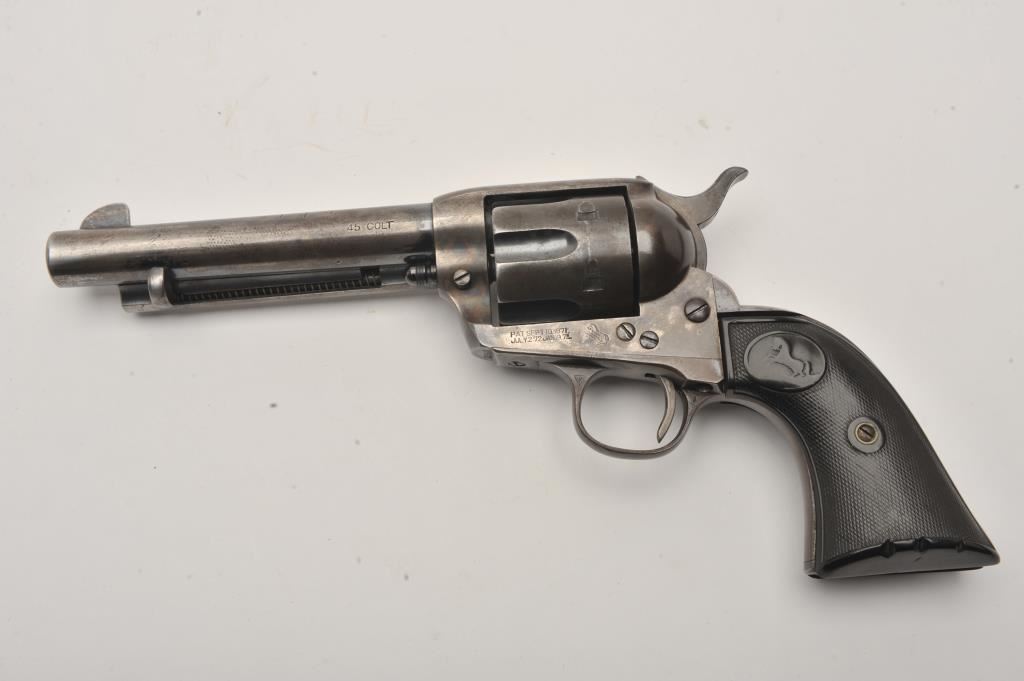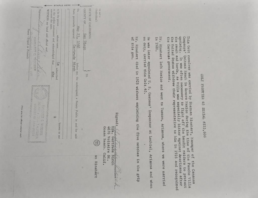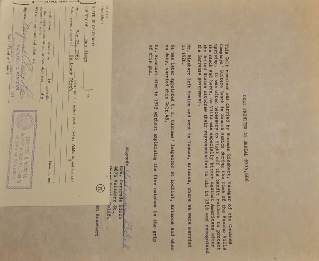 Colt SAA revolver, .45 caliber, 5.5” barrel, blued and case hardened finish, checkered hard rubber grips with 5 old carved notches in the bottom of grips (3 on left side, 2 on right), S/N 335608; with May 23, 1968 signed and notarized document describing this Colt by S/N was carried by Sherman Rinehart, Manager of the Cananea Companys’ Quiteca Ranch in Sonora Mexico during the time of the Pancho Villa uprising. The affidavit also notes “It was often necessary to fight off the bandit raiders to protect the ranch and herds, as Villa was especially bitter against Americans after the United States withdrew their representatives to him in 1916 and recognized the Carranza government. Mr Rinehart left Mexico and went to Tucson, AZ where we were married in 1920. He was later appointed U.S. Customs’ Inspector at Lochiel, Arizona and when on duty, carried this Colt .45. Mr. Rinehart died in 1925 without explaining the five notches in the grip of this gun”. (signed by Mrs. Gertrude Birch; formerly Mrs. Sherman Rinehart). This gun is in overall good condition with traces of