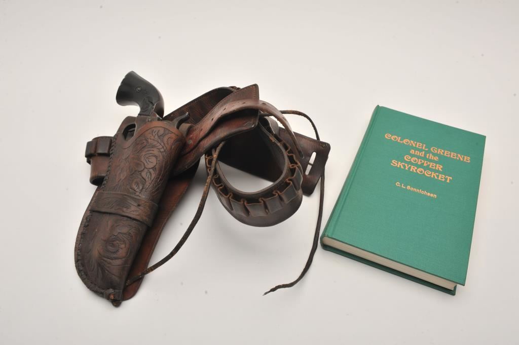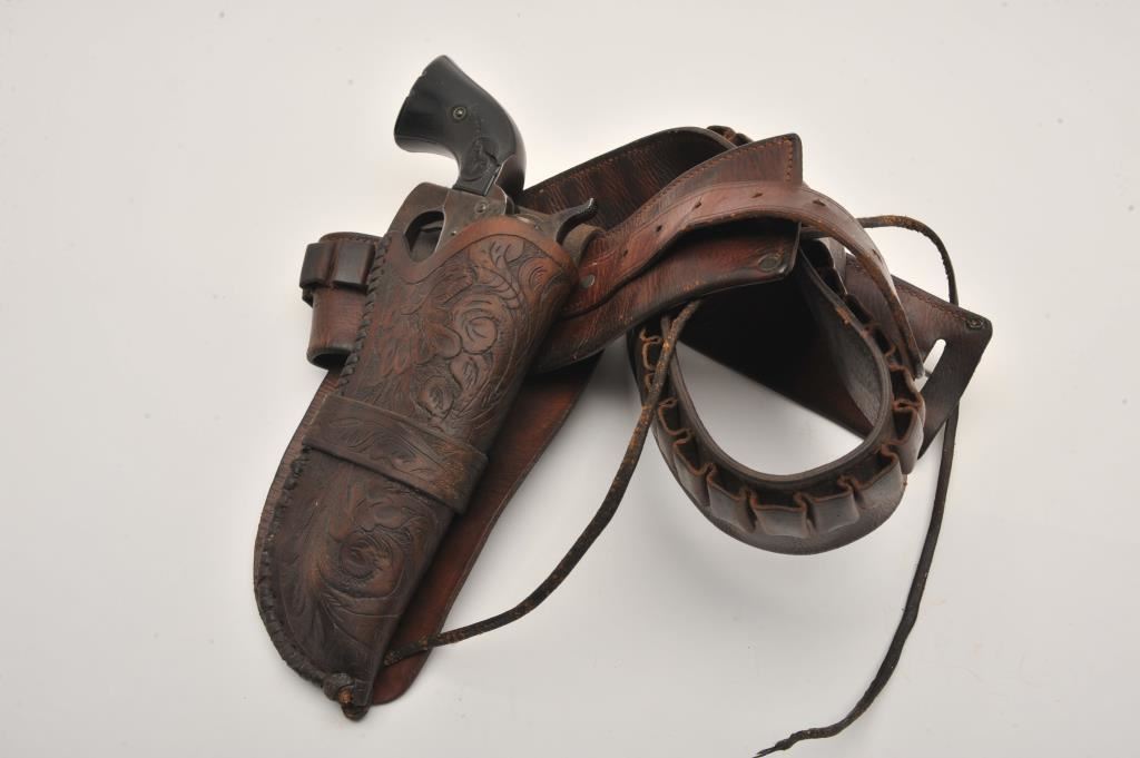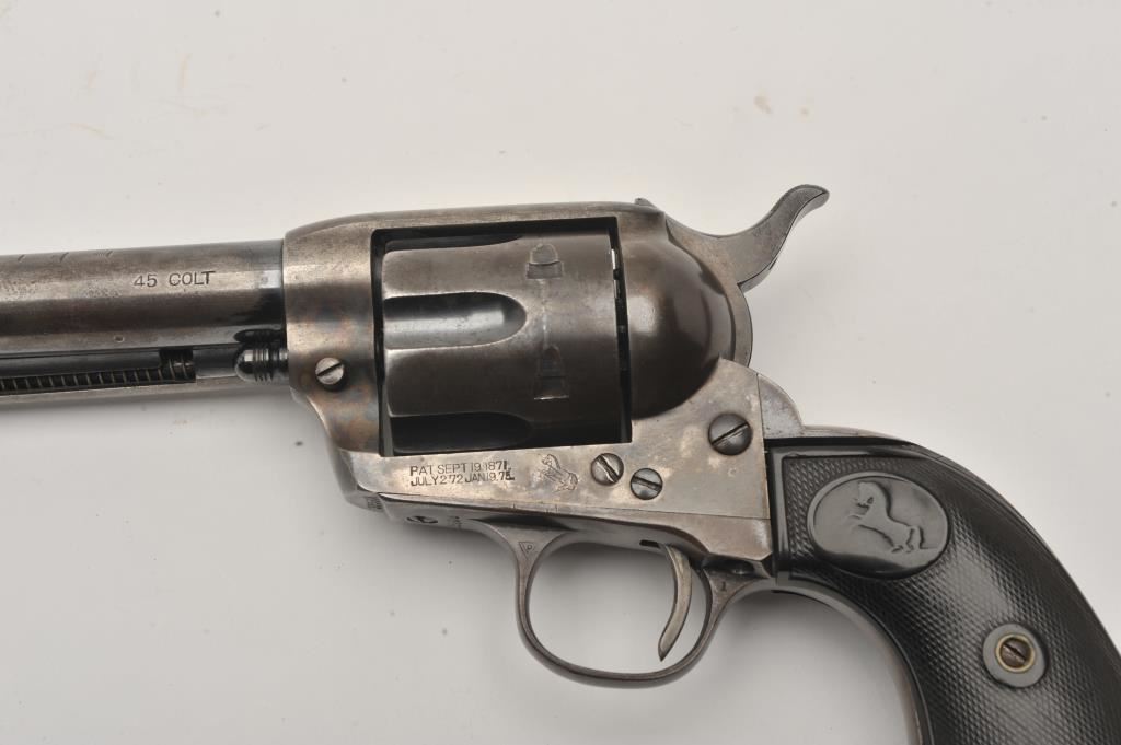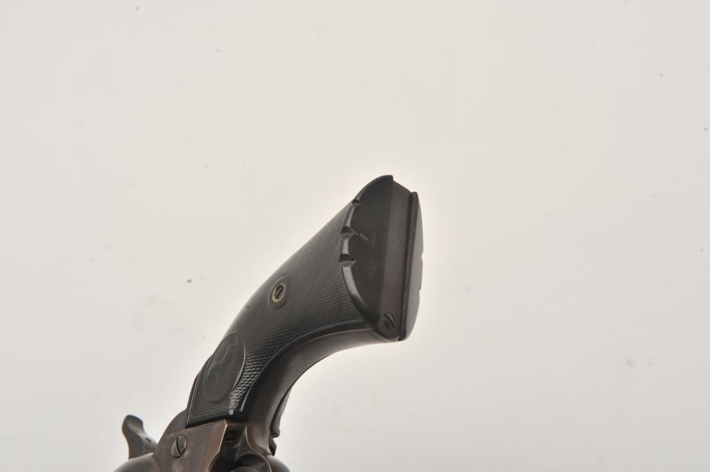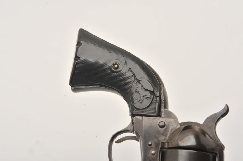 Colt SAA revolver, .45 caliber, 5.5” barrel, blued and case hardened finish, checkered hard rubber grips with 5 old carved notches in the bottom of grips (3 on left side, 2 on right), S/N 335608; with May 23, 1968 signed and notarized document describing this Colt by S/N was carried by Sherman Rinehart, Manager of the Cananea Companys’ Quiteca Ranch in Sonora Mexico during the time of the Pancho Villa uprising. The affidavit also notes “It was often necessary to fight off the bandit raiders to protect the ranch and herds, as Villa was especially bitter against Americans after the United States withdrew their representatives to him in 1916 and recognized the Carranza government. Mr Rinehart left Mexico and went to Tucson, AZ where we were married in 1920. He was later appointed U.S. Customs’ Inspector at Lochiel, Arizona and when on duty, carried this Colt .45. Mr. Rinehart died in 1925 without explaining the five notches in the grip of this gun”. (signed by Mrs. Gertrude Birch; formerly Mrs. Sherman Rinehart). This gun is in overall good condition with traces of