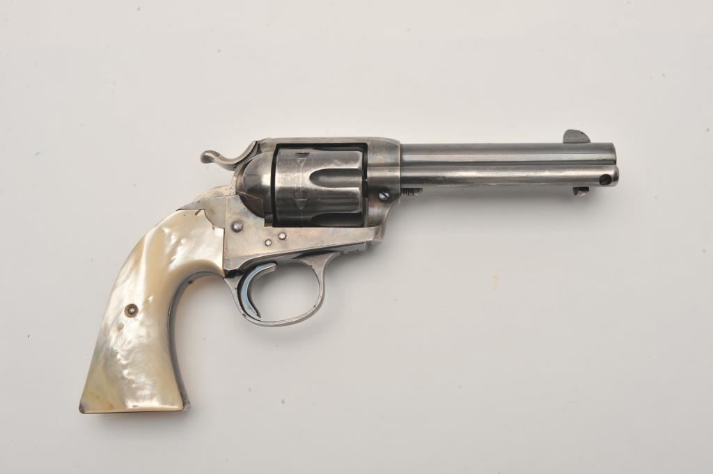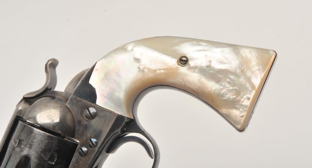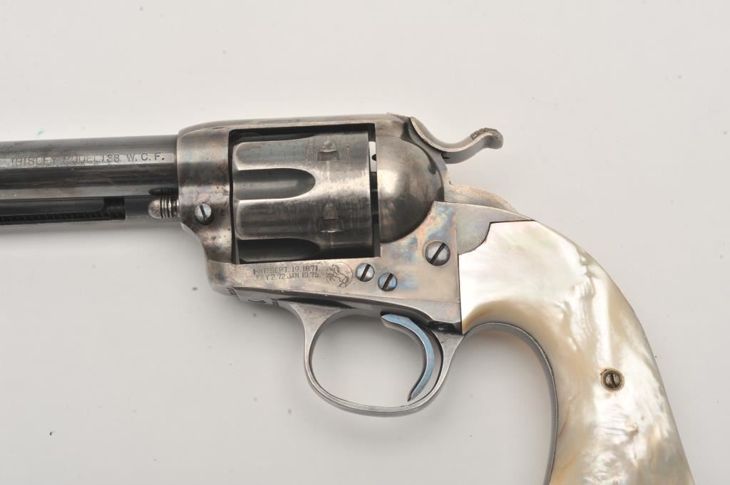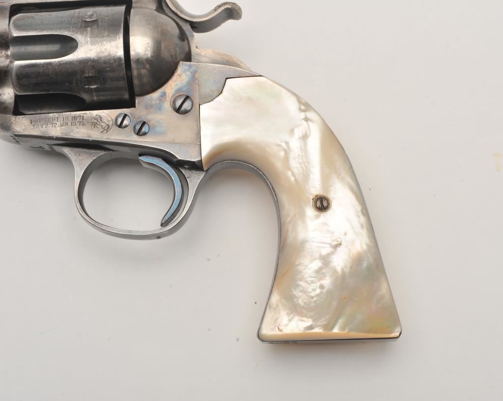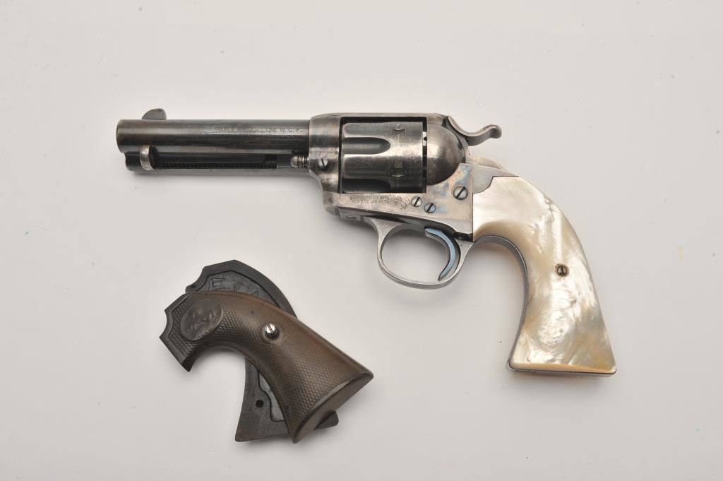 Colt Bisley Model Single Action revolver, .38-40 caliber, 4.75” barrel, blued and case hardened finish, pearl grips (also accompanying lot is an original pair of checkered hard rubber grips), S/N 222246; overall very good to fine condition with majority of blued finish remaining on barrel assembly, cylinder and straps; majority of case colors on frame and hammer; crisp action, sharp markings, near fine bore, authentic pearl grips that fit well and are tapered and correct Colt Mfg. in our opinion; included pair of hard rubber grips are in very good condition. Factory Colt letter confirms caliber, barrel length and finish, type of stocks “Not Listed”; shipped to Simmons Hardwar Co., St. Louis, MO on Feb. 19, 1902, 7 guns in shipment. (C&R/PPT). Est.: $2,000-$4,000.