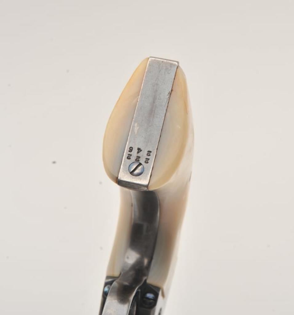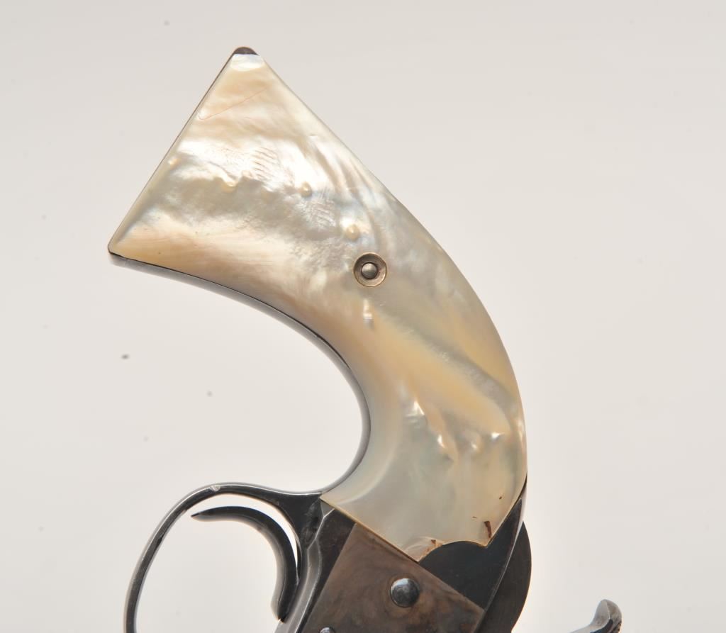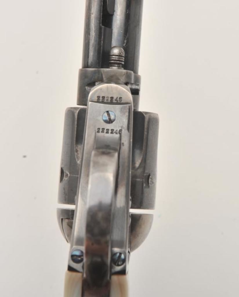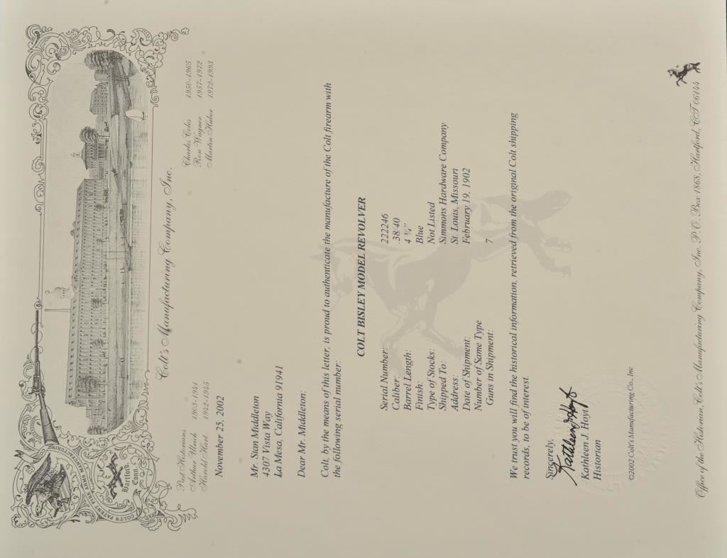 Colt Bisley Model Single Action revolver, .38-40 caliber, 4.75” barrel, blued and case hardened finish, pearl grips (also accompanying lot is an original pair of checkered hard rubber grips), S/N 222246; overall very good to fine condition with majority of blued finish remaining on barrel assembly, cylinder and straps; majority of case colors on frame and hammer; crisp action, sharp markings, near fine bore, authentic pearl grips that fit well and are tapered and correct Colt Mfg. in our opinion; included pair of hard rubber grips are in very good condition. Factory Colt letter confirms caliber, barrel length and finish, type of stocks “Not Listed”; shipped to Simmons Hardwar Co., St. Louis, MO on Feb. 19, 1902, 7 guns in shipment. (C&R/PPT). Est.: $2,000-$4,000.