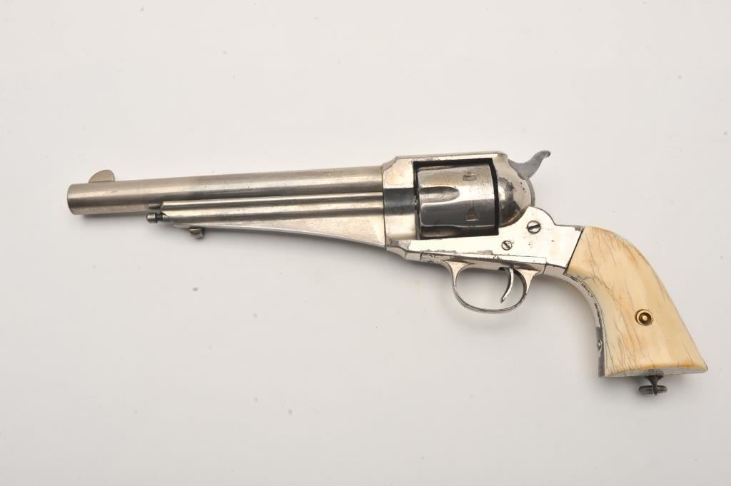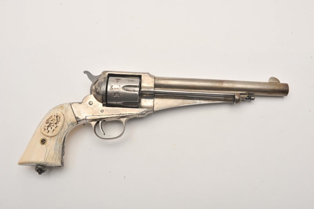 Remington 1875 in .44-40 caliber with 7 ½” barrel, nickel finish, period raised carved ivory grips “J.W.”, S/N 3589. 50%-70% original nickel with some drifting and losses. Dark patina and rust where finish has lifted. Good markings. Period lanyard ring added. Tight with fair to good bore. (Antique) Est.: $2000-$4000