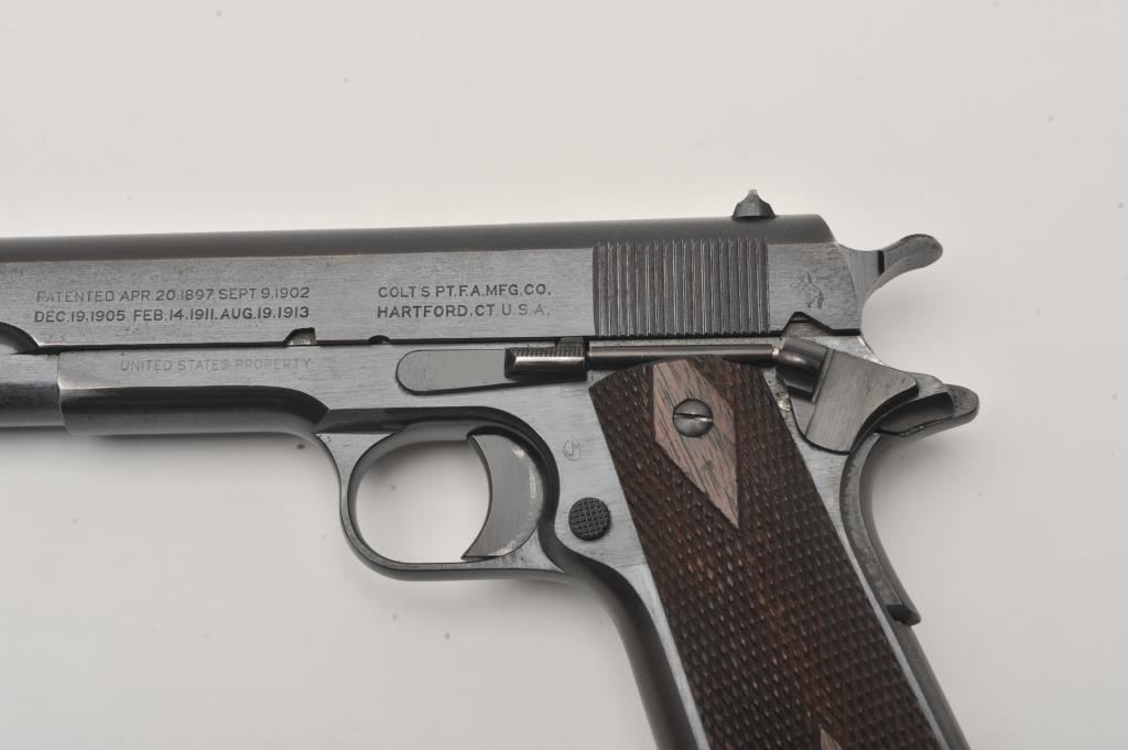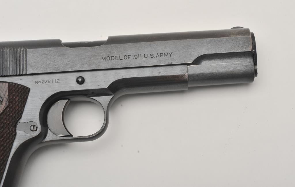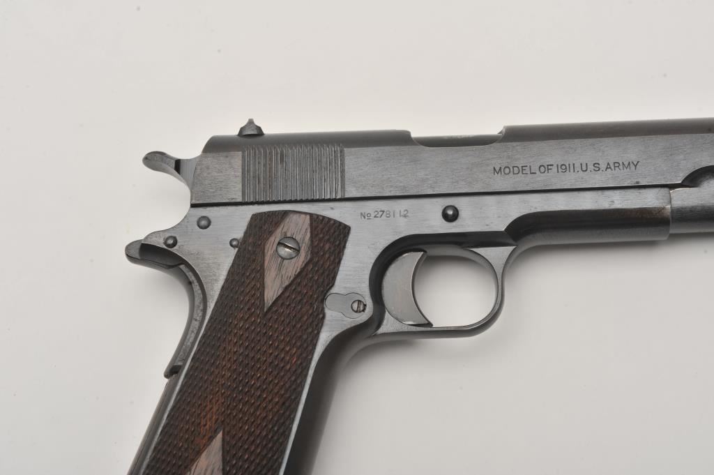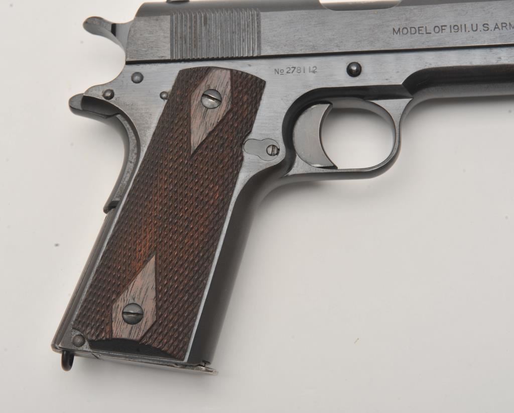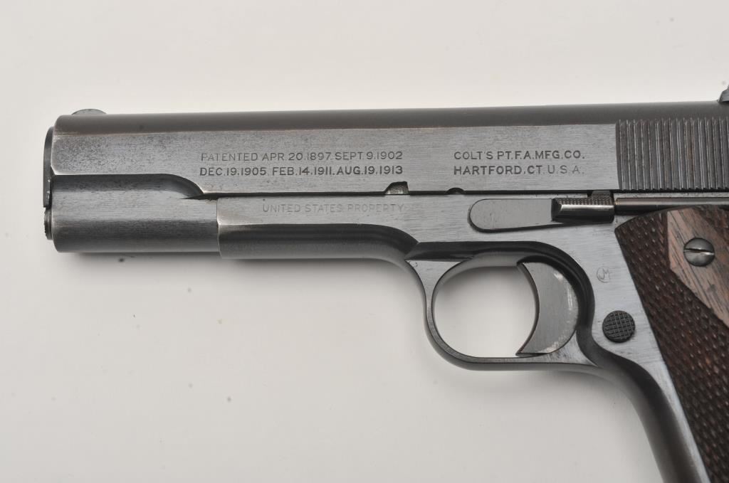 United States Property-marked Colt Model 1911 semi-automatic pistol, .45 caliber, 5” barrel, blued finish, checkered wood grips, two-tone magazine, S/N 278112; overall fine condition with majority of original military finish remaining, fine bore, crisp action, sharp markings and fine grips. Accompanied by a Colt factory letter indicating shipment to the Commanding Officer of the Springfield Armory, Springfield, Massachusetts on April 22, 1918, 6,000 guns in shipment. By tradition, this pistol belonged to first flight instructor for the U.S. Marine Corps. (C&R/PPT). Est.: $2,000-$4,000.