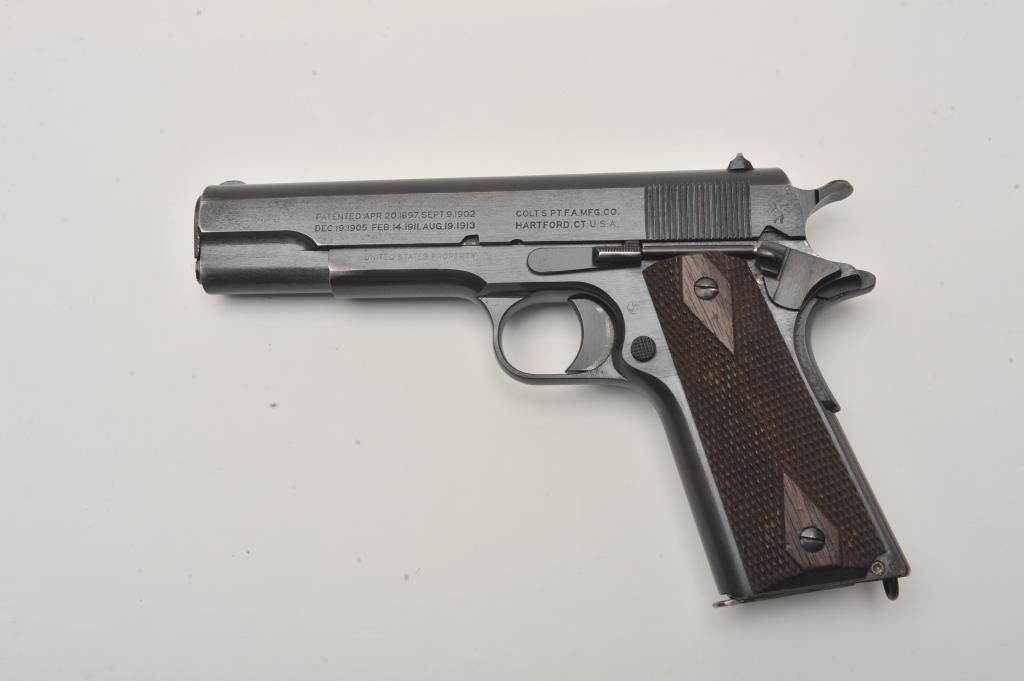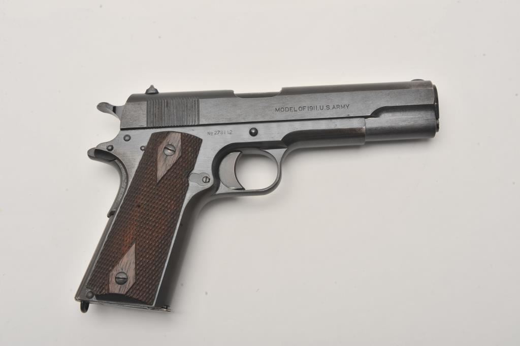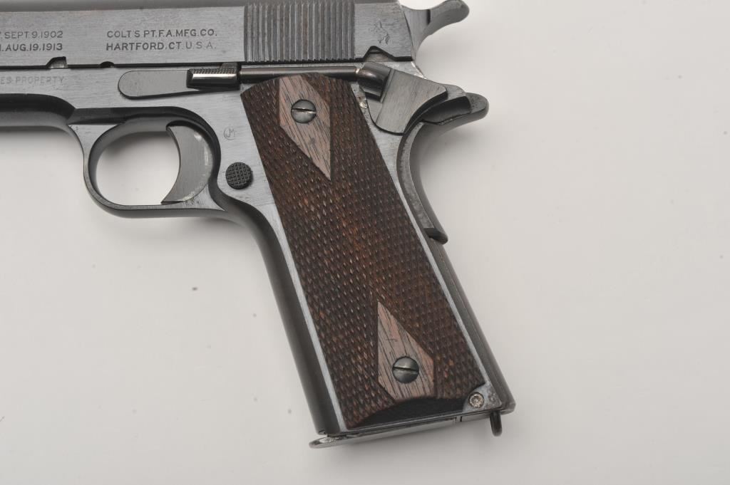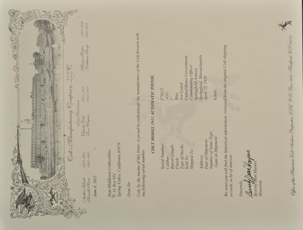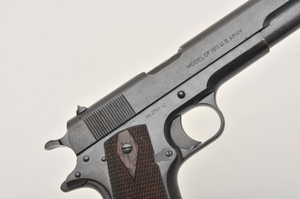 United States Property-marked Colt Model 1911 semi-automatic pistol, .45 caliber, 5” barrel, blued finish, checkered wood grips, two-tone magazine, S/N 278112; overall fine condition with majority of original military finish remaining, fine bore, crisp action, sharp markings and fine grips. Accompanied by a Colt factory letter indicating shipment to the Commanding Officer of the Springfield Armory, Springfield, Massachusetts on April 22, 1918, 6,000 guns in shipment. By tradition, this pistol belonged to first flight instructor for the U.S. Marine Corps. (C&R/PPT). Est.: $2,000-$4,000.