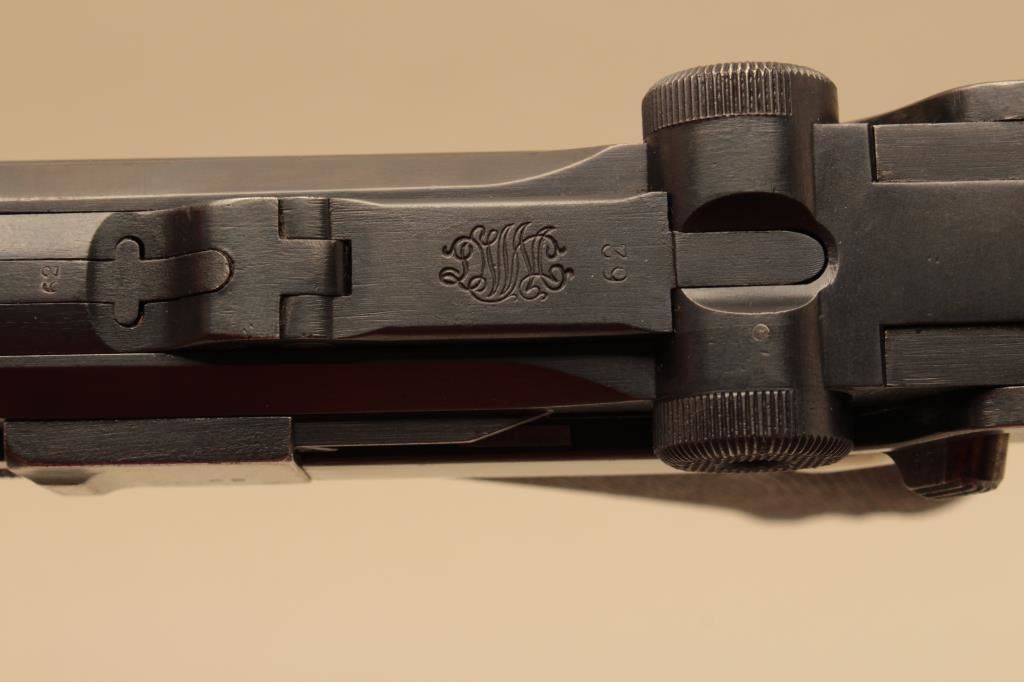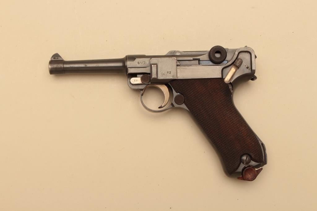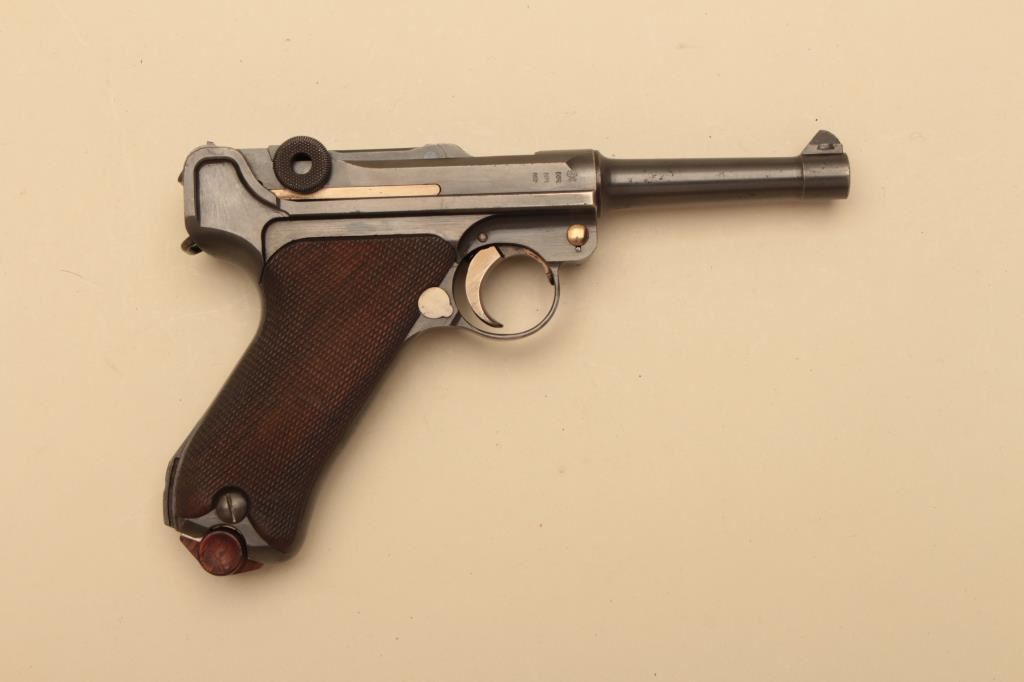 1916 dated Luger by DWM in 9mm with German military acceptance proofs, S/N 4662. Very good condition plus with 90%-95% original toning and dulling slightly original blue finish. 50% straw on small parts. Good plus grips with minor wear to the top of checkering and small loss of wood. Matching visible numbers. Correct style wood bottom mag. Minor erosion and slight pinprick pitting. The bore is bright. A good example. (C&R/PPT) Est.: $1400-$2800