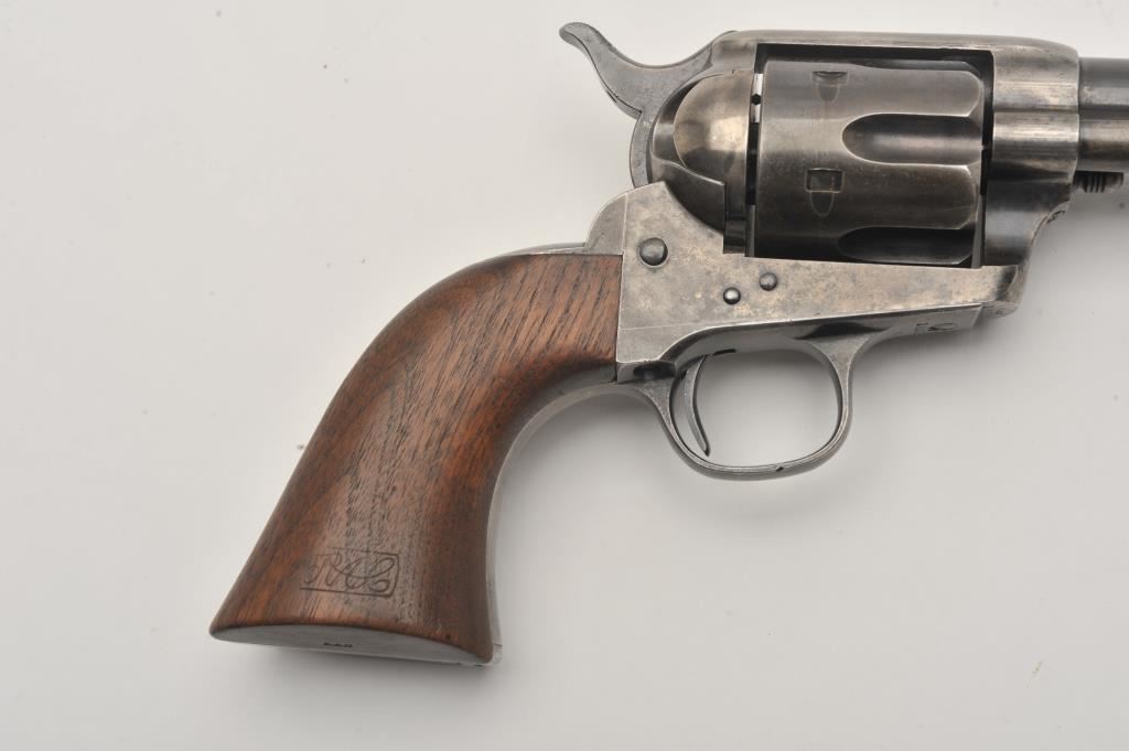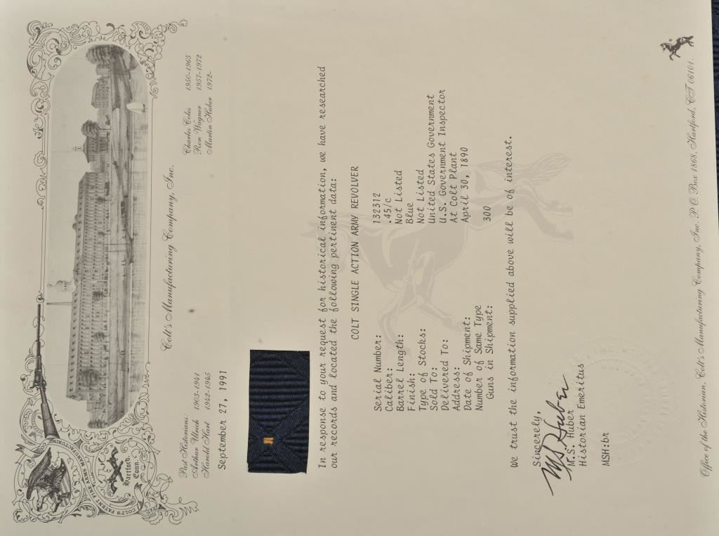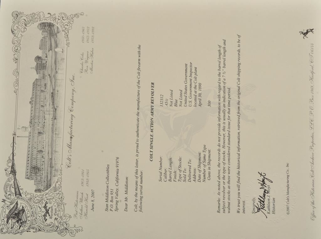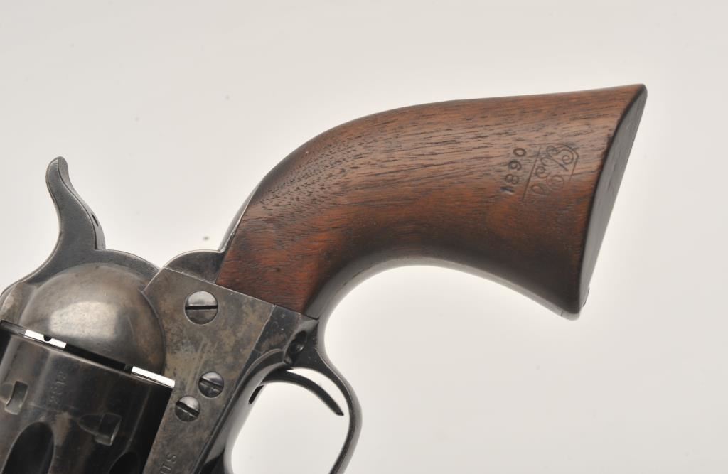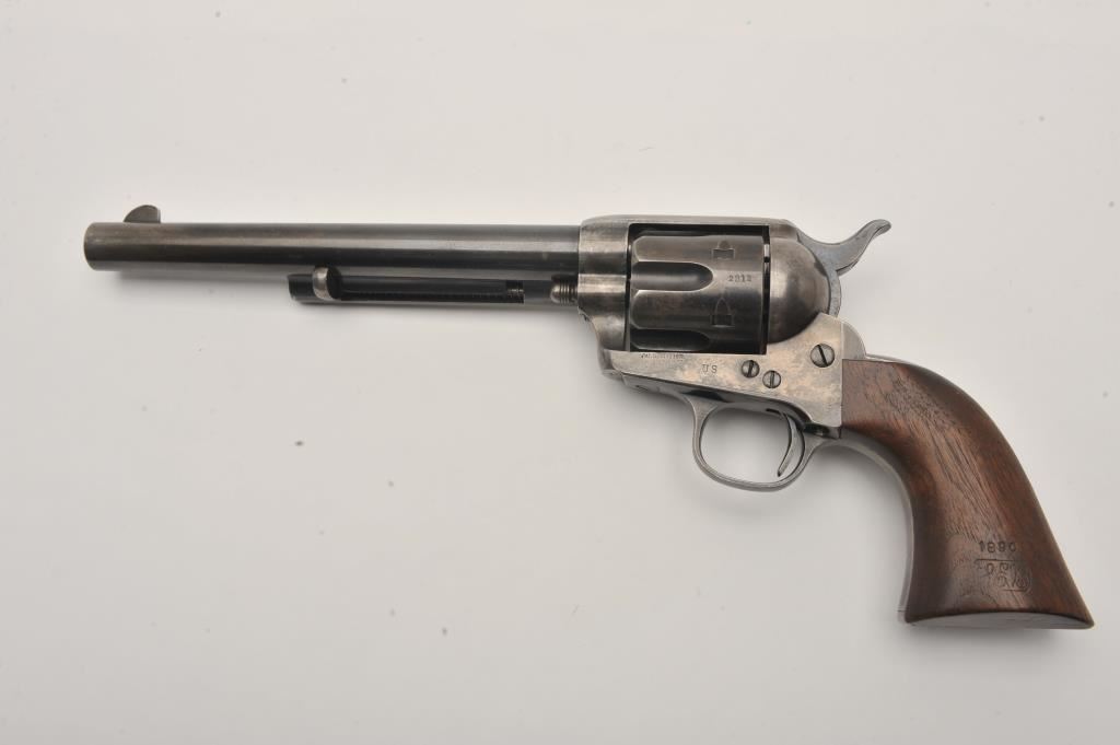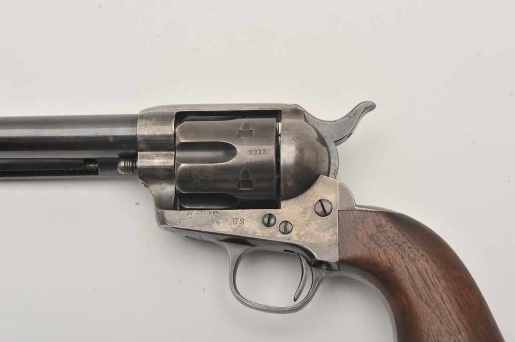 Colt U.S. Cavalry SAA revolver, .45 caliber, 7.5” barrel, blued and case hardened finish, R.A.C. inspections, wood grips showing restorations and replacement, S/N 132312; overall very good condition with majority of blued finish remaining and silver toning to frame; very good bore, crisp action and sharp markings; grips show RAC cartouche on right side and SEB/1890 on left side (as restored). Accompanied by a Colt letter indicating .45 caliber, blued finish, barrel length and type of stocks “Not Listed”, delivered to the U.S. Government Inspector located at the Colt plant on April 30, 1890 in a lot of 300 guns (letter also notes under remarks that standard issue during this period would be a 7.5” barrel length and wood stocks). (Antique). Est.: $3,500-$7,000.