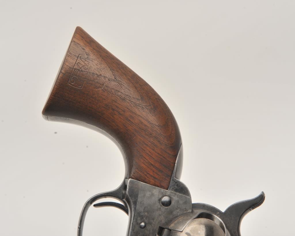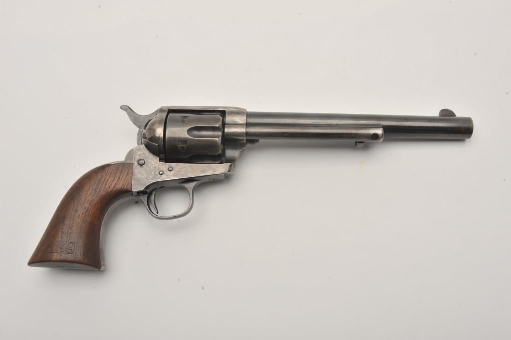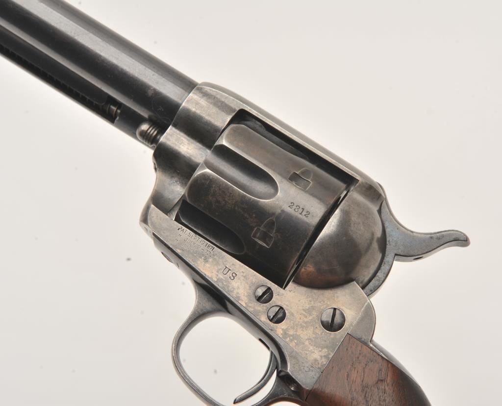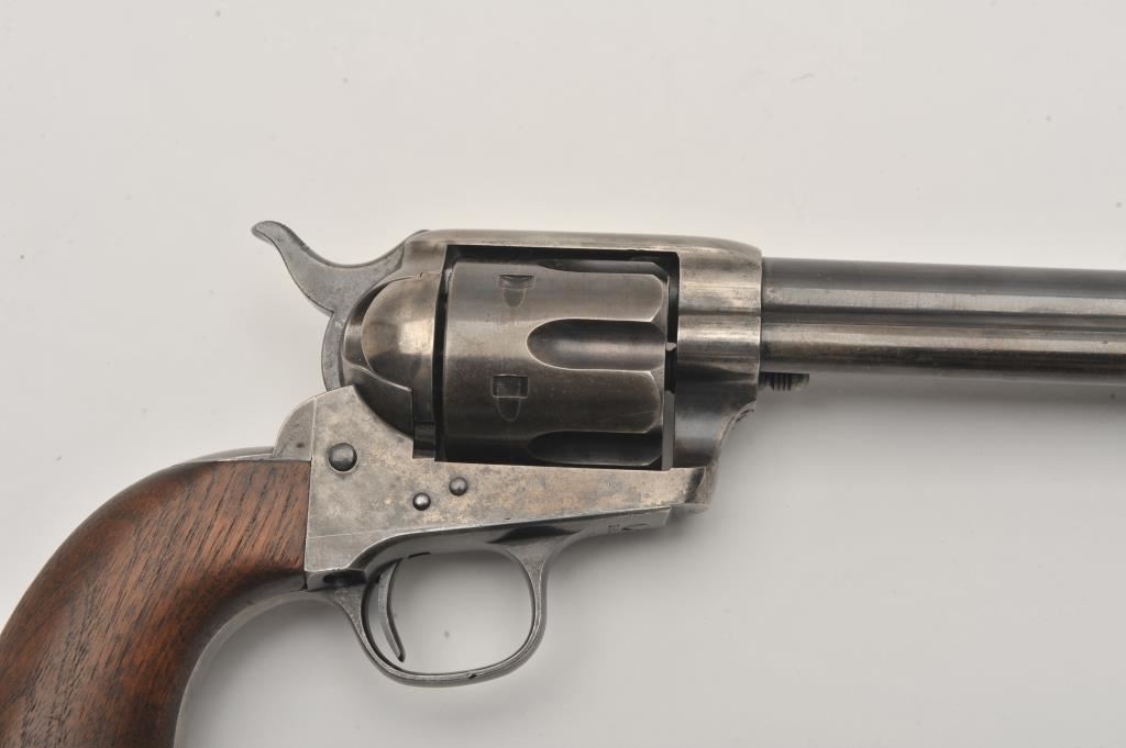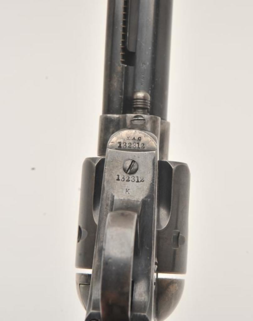 Colt U.S. Cavalry SAA revolver, .45 caliber, 7.5” barrel, blued and case hardened finish, R.A.C. inspections, wood grips showing restorations and replacement, S/N 132312; overall very good condition with majority of blued finish remaining and silver toning to frame; very good bore, crisp action and sharp markings; grips show RAC cartouche on right side and SEB/1890 on left side (as restored). Accompanied by a Colt letter indicating .45 caliber, blued finish, barrel length and type of stocks “Not Listed”, delivered to the U.S. Government Inspector located at the Colt plant on April 30, 1890 in a lot of 300 guns (letter also notes under remarks that standard issue during this period would be a 7.5” barrel length and wood stocks). (Antique). Est.: $3,500-$7,000.
