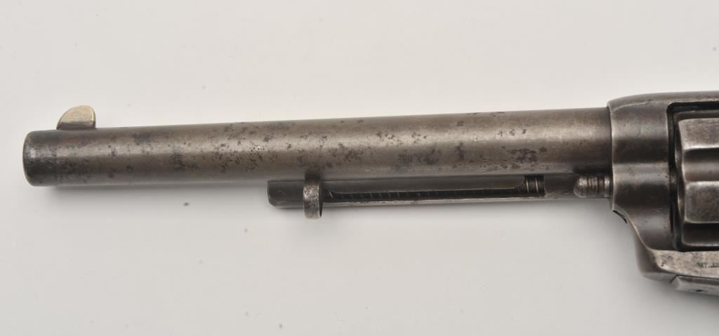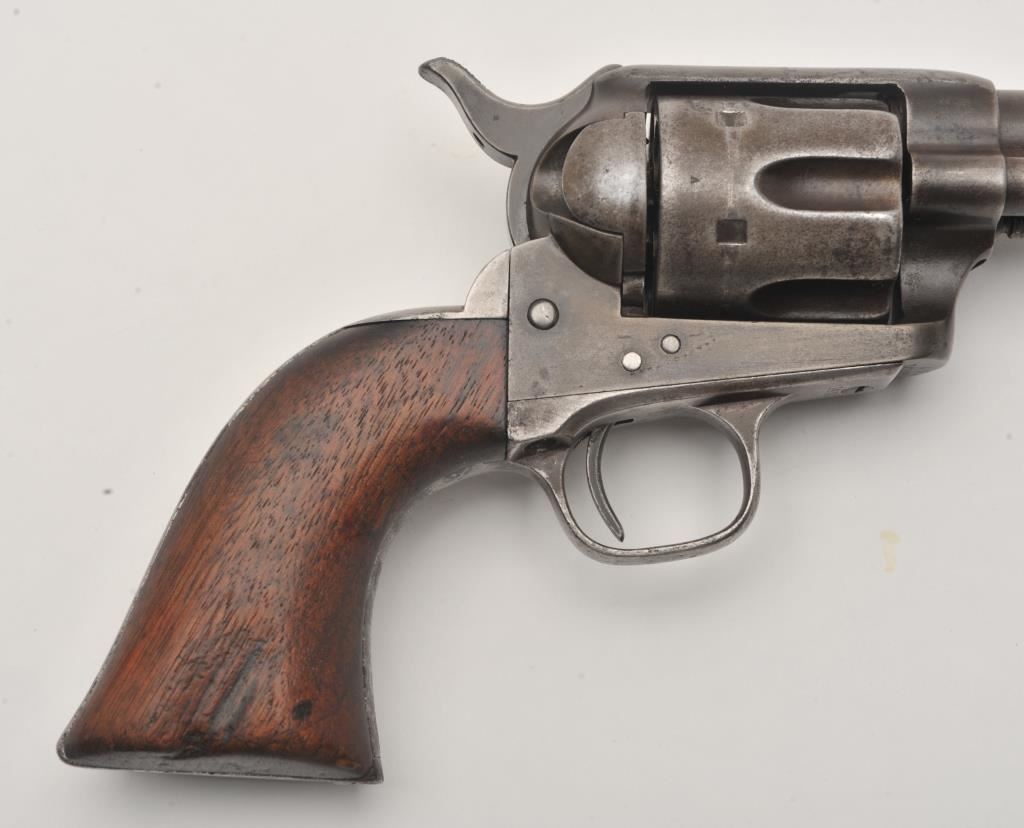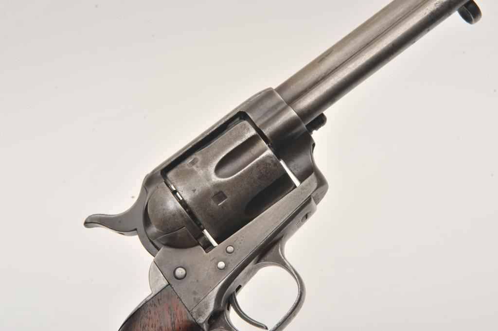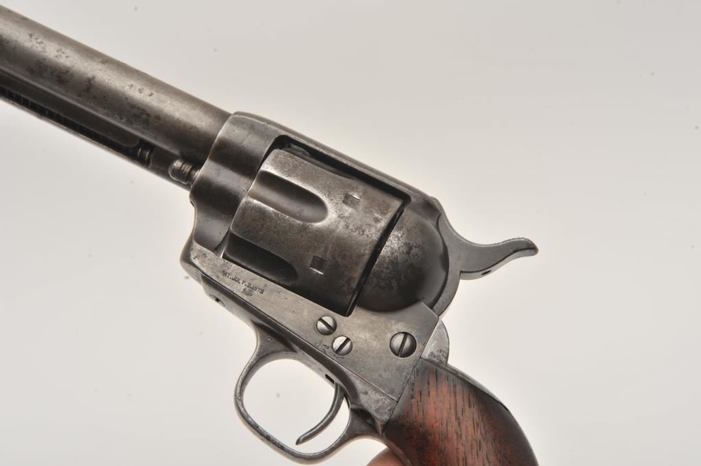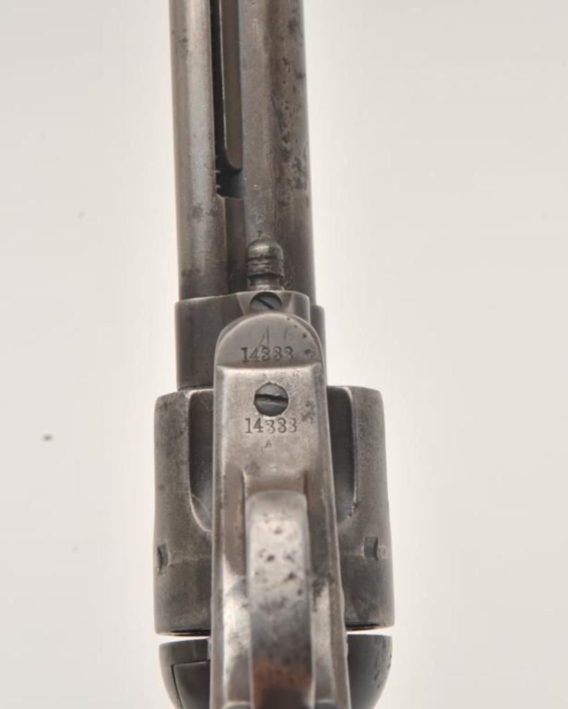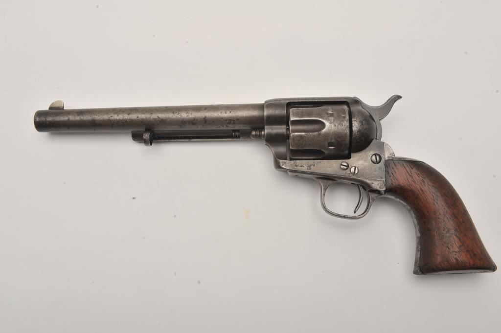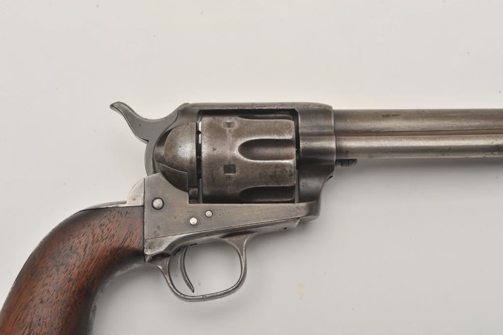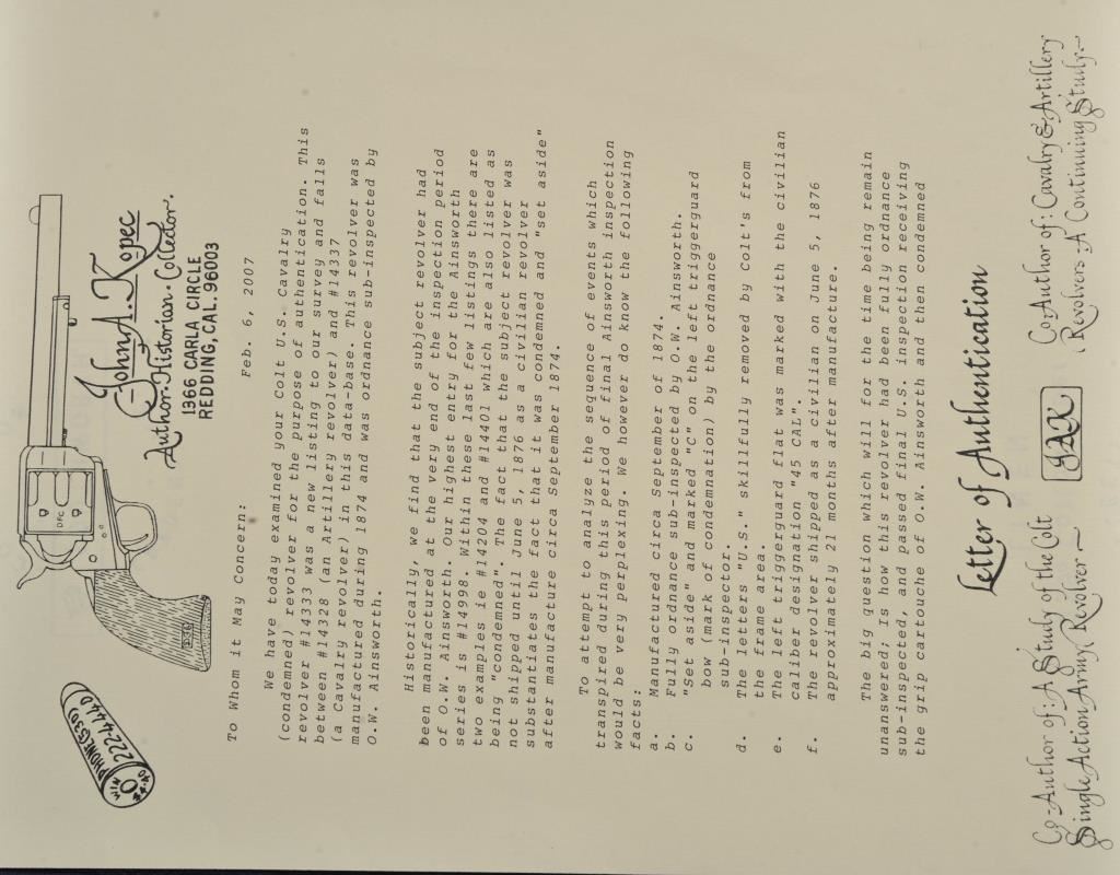 Colt SAA Ainsworth-inspected and condemned revolver, .45 caliber, 7.5” barrel, dark patina with scattered spots of erosion and pitting, wood grips with partial inspector’s cartouche on left side of grips, S/N 14333; working action, fair bore, good grips; accompanied by a factory letter confirming caliber with barrel length and type of stocks “Not Listed”; shipped to B. Kittredge & Co., Cincinnati, Ohio on June 5, 1876 10 guns in shipment. Also accompanied by a John Kopec letter which indicates his research shows this gun had been manufactured at the very end of the inspection period of O.W. Ainsworth; also that the letters “U.S.: had been skillfully removed by Colt’s from the frame area and although it appears that the revolver had been fully ordnance sub-inspected, and passed final U.S. inspection receiving the grip cartouche of O. W. Ainsworth, it was somehow passed by the military and sold commercially later. (Antique). Est.: $2,500-$5,000.