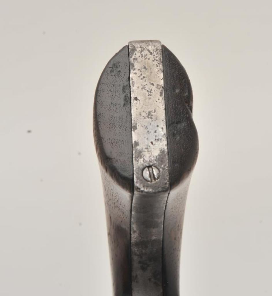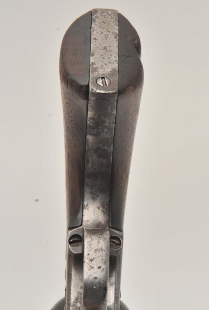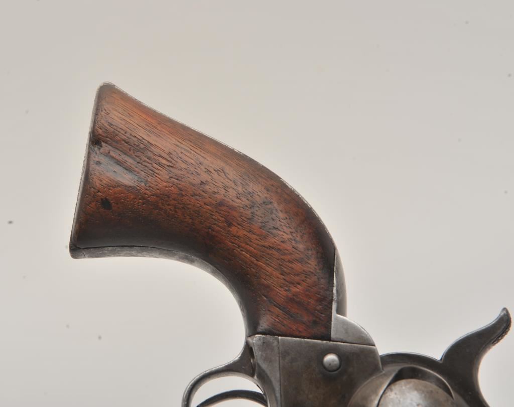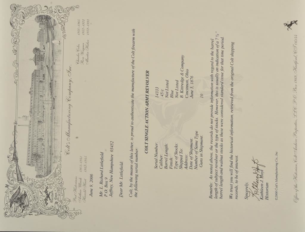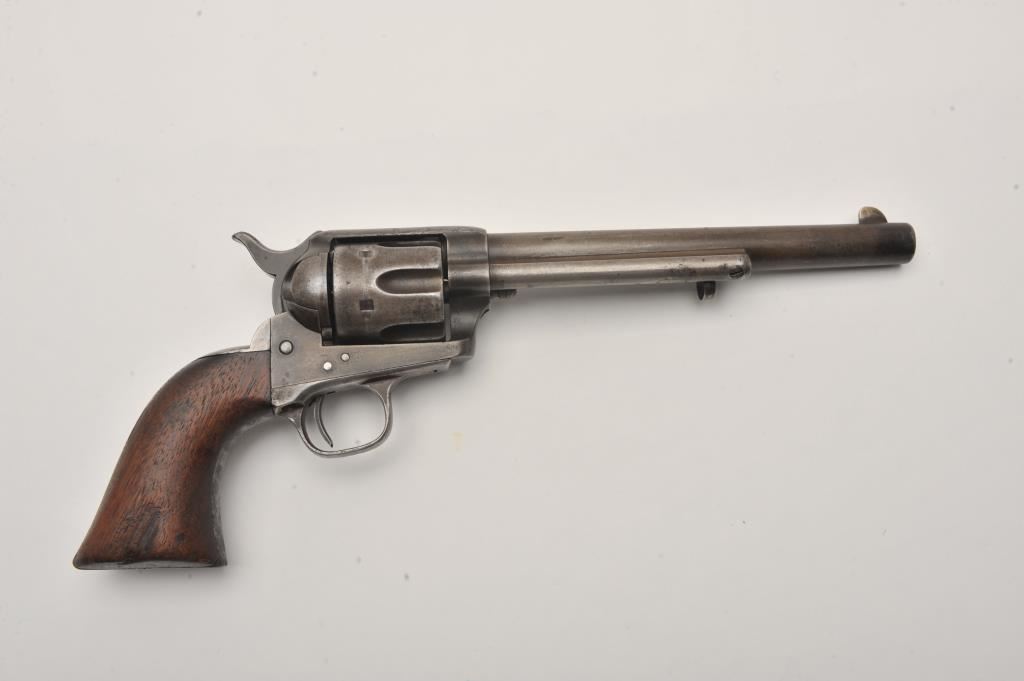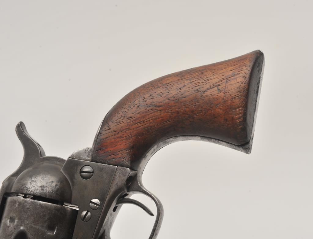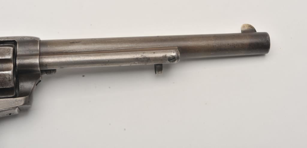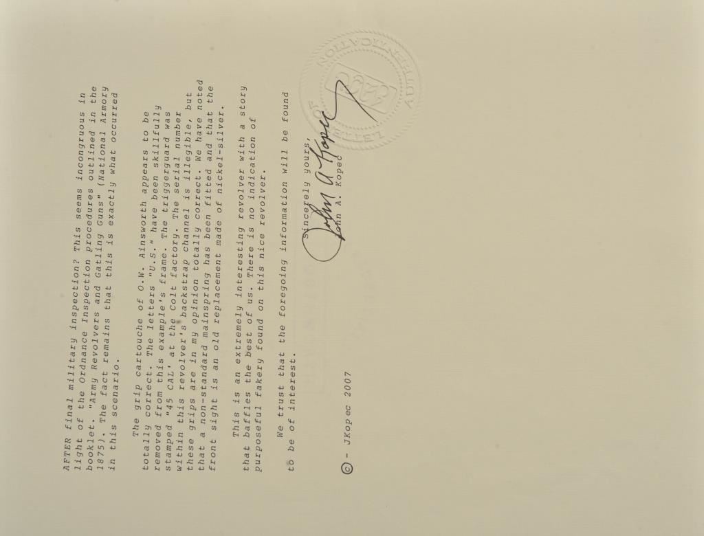 Colt SAA Ainsworth-inspected and condemned revolver, .45 caliber, 7.5” barrel, dark patina with scattered spots of erosion and pitting, wood grips with partial inspector’s cartouche on left side of grips, S/N 14333; working action, fair bore, good grips; accompanied by a factory letter confirming caliber with barrel length and type of stocks “Not Listed”; shipped to B. Kittredge & Co., Cincinnati, Ohio on June 5, 1876 10 guns in shipment. Also accompanied by a John Kopec letter which indicates his research shows this gun had been manufactured at the very end of the inspection period of O.W. Ainsworth; also that the letters “U.S.: had been skillfully removed by Colt’s from the frame area and although it appears that the revolver had been fully ordnance sub-inspected, and passed final U.S. inspection receiving the grip cartouche of O. W. Ainsworth, it was somehow passed by the military and sold commercially later. (Antique). Est.: $2,500-$5,000.